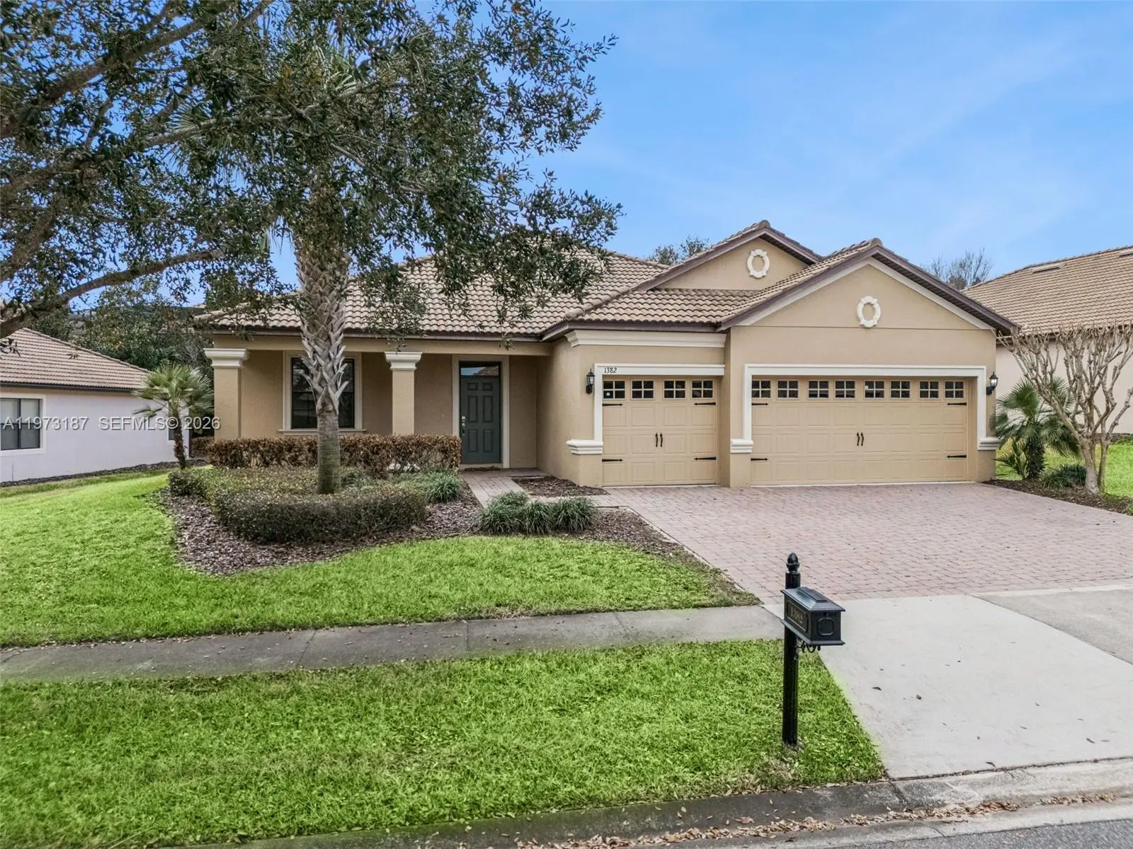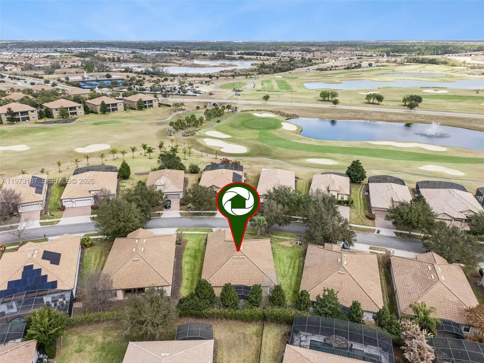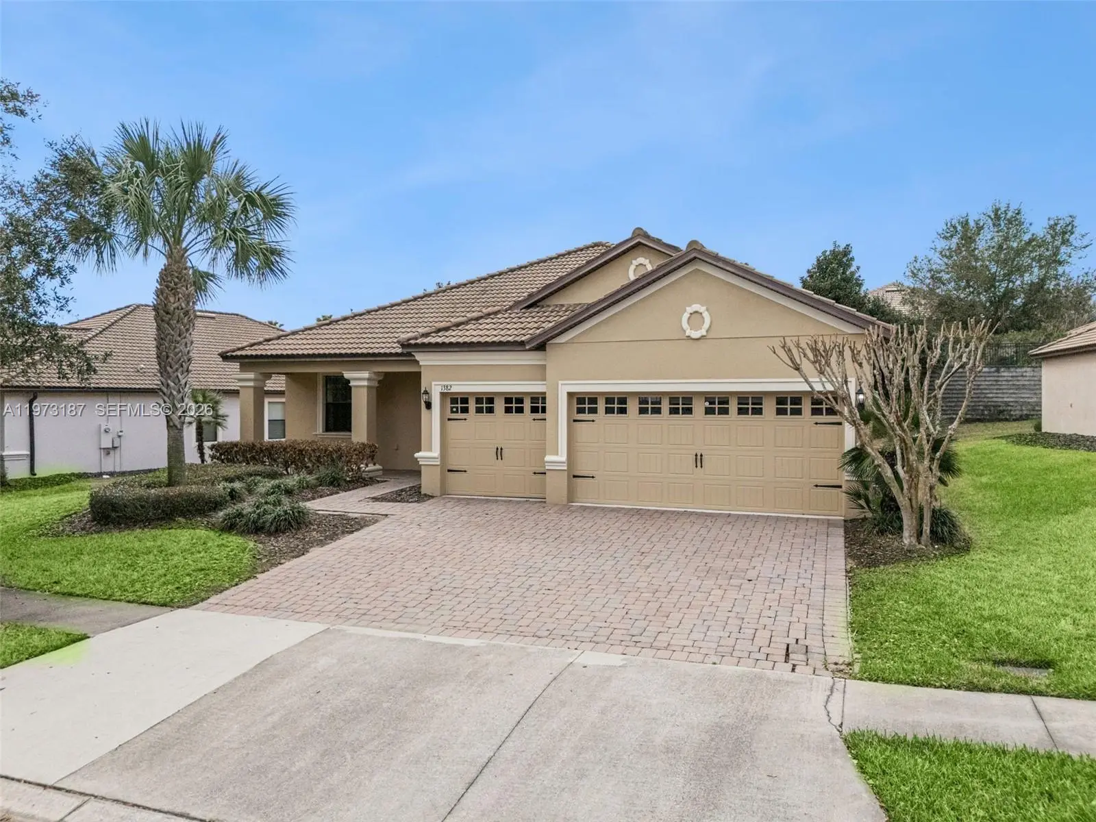Discover this charming single-story home on a premium elevated lot in the prestigious Champions Gate community. This elegant four-bedroom, three-bathroom residence spans over 2,300 square feet, blending luxury and comfort seamlessly. The open floor plan enhances everyday living and entertaining, with the kitchen integrating with the main living and dining areas. The primary suite offers an expansive bathroom and built-in walk-in closet, while three additional bedrooms provide flexibility for various living arrangements. Unwind on your private covered and screened-in lanai, enjoying the peaceful atmosphere. Champions Gate is a luxury, gated community centered around The Oasis Club, featuring a 14,000-square-foot clubhouse with a restaurant, tiki bar, movie theater, fitness center, game room, lazy river, and private cabanas. Residents also enjoy The Plaza, an exclusive clubhouse with its own restaurant, bar, fitness center, sauna, game room, pickleball courts, and two pools. The HOA includes access to these facilities, full golf membership on an 18-hole course designed by George Clifton, along with lawn care, basic cable, internet, phone, and gated security. Golf carts are welcome, providing easy access to all amenities. Located just a few miles from I-4, the community offers quick access to Central Florida attractions, dining, and shopping. Please contact us with any questions or to request further information.