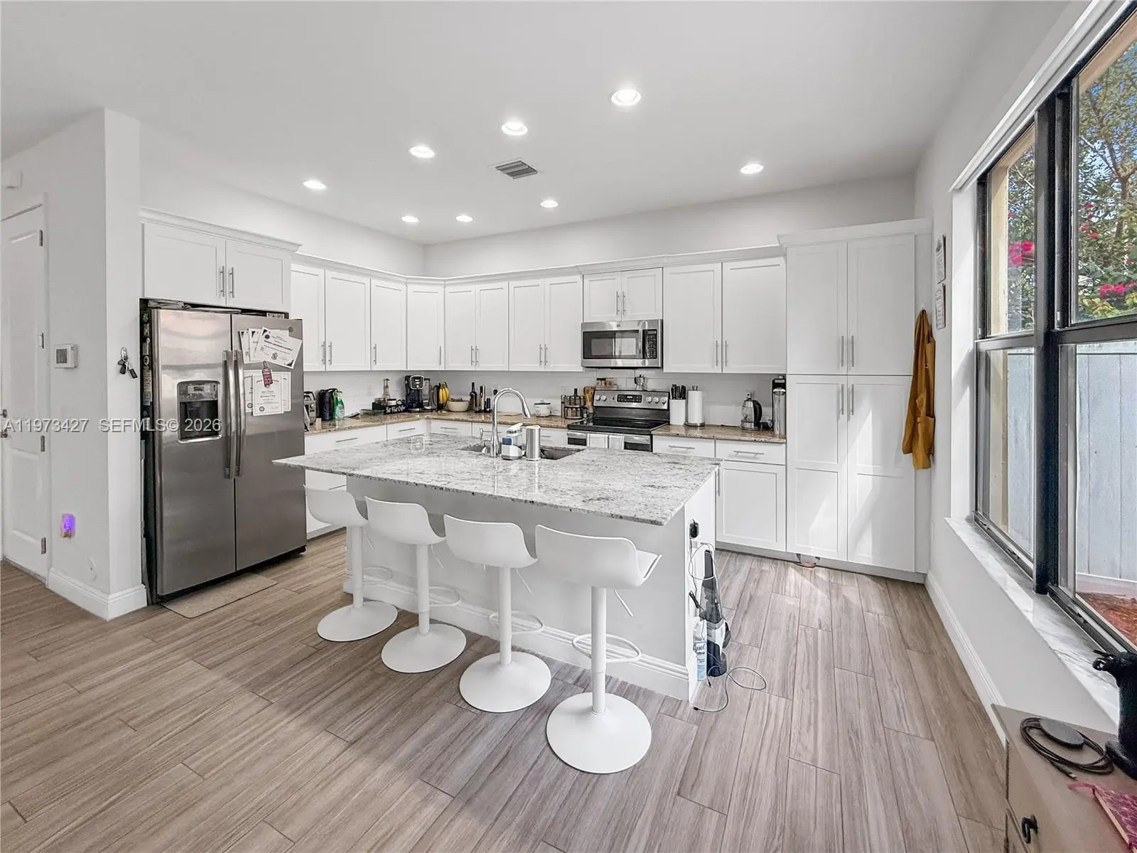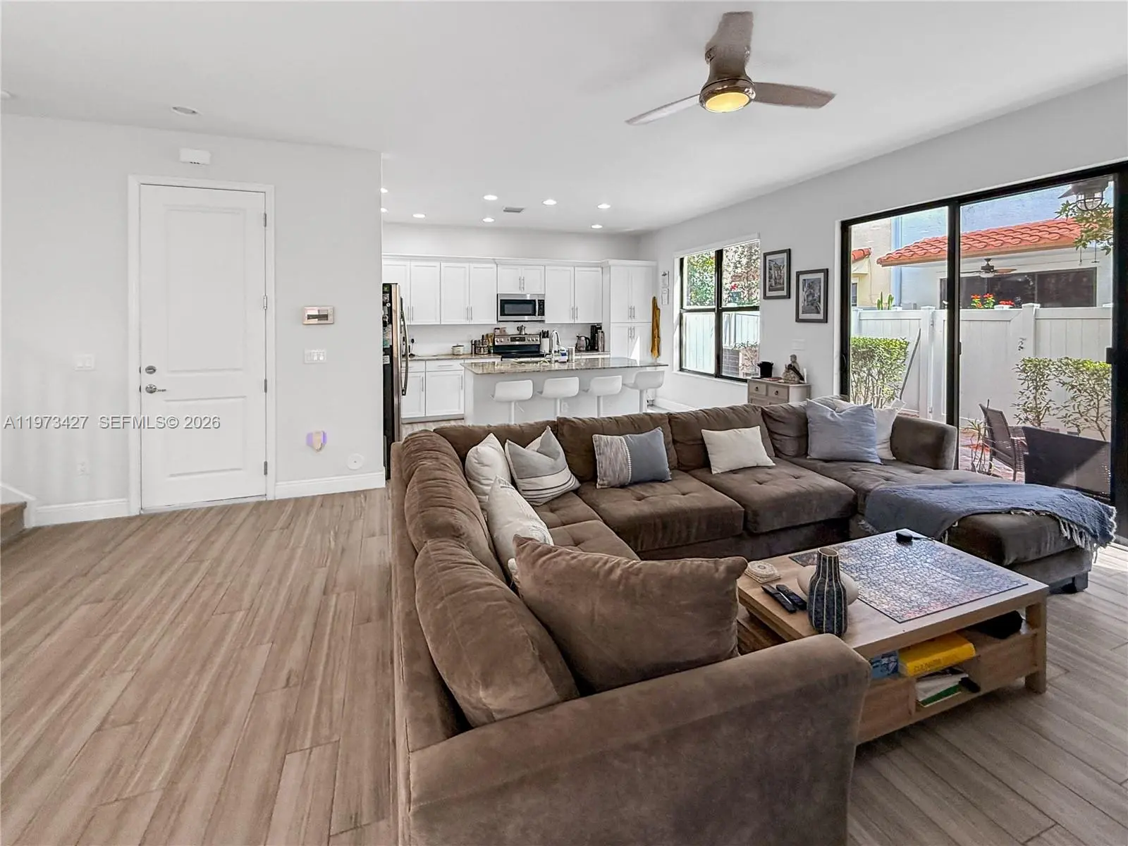 Welcome to Chapel Grove in West Pembroke Pines, a highly desirable boutique community known for its prime location and lifestyle. This 3 bedroom, 2.5 bathroom corner townhome offers bright, open living spaces with extra privacy and natural light. Impact windows provide peace of mind, and the private fenced patio is perfect for relaxing or entertaining. The spacious kitchen is designed for both style and function, featuring granite countertops, a large island, pull out shelves, and built in garbage bins for smart storage. Tile floors run throughout the first level, complemented by a premium vinyl staircase, modern smooth walls, and upgraded tile in the bathrooms for a clean, contemporary feel. As a corner unit, enjoy added separation from neighbors and enhanced curb appeal. The thoughtful layout offers generous bedroom sizes and ceiling height, ample closet space, and comfortable everyday living. Chapel Grove residents benefit from a beautifully maintained community with resort style amenities including a pool, fitness center, basketball court, and playground, all conveniently located near A rated schools, premier shopping, dining, parks, and major highways for easy commuting.