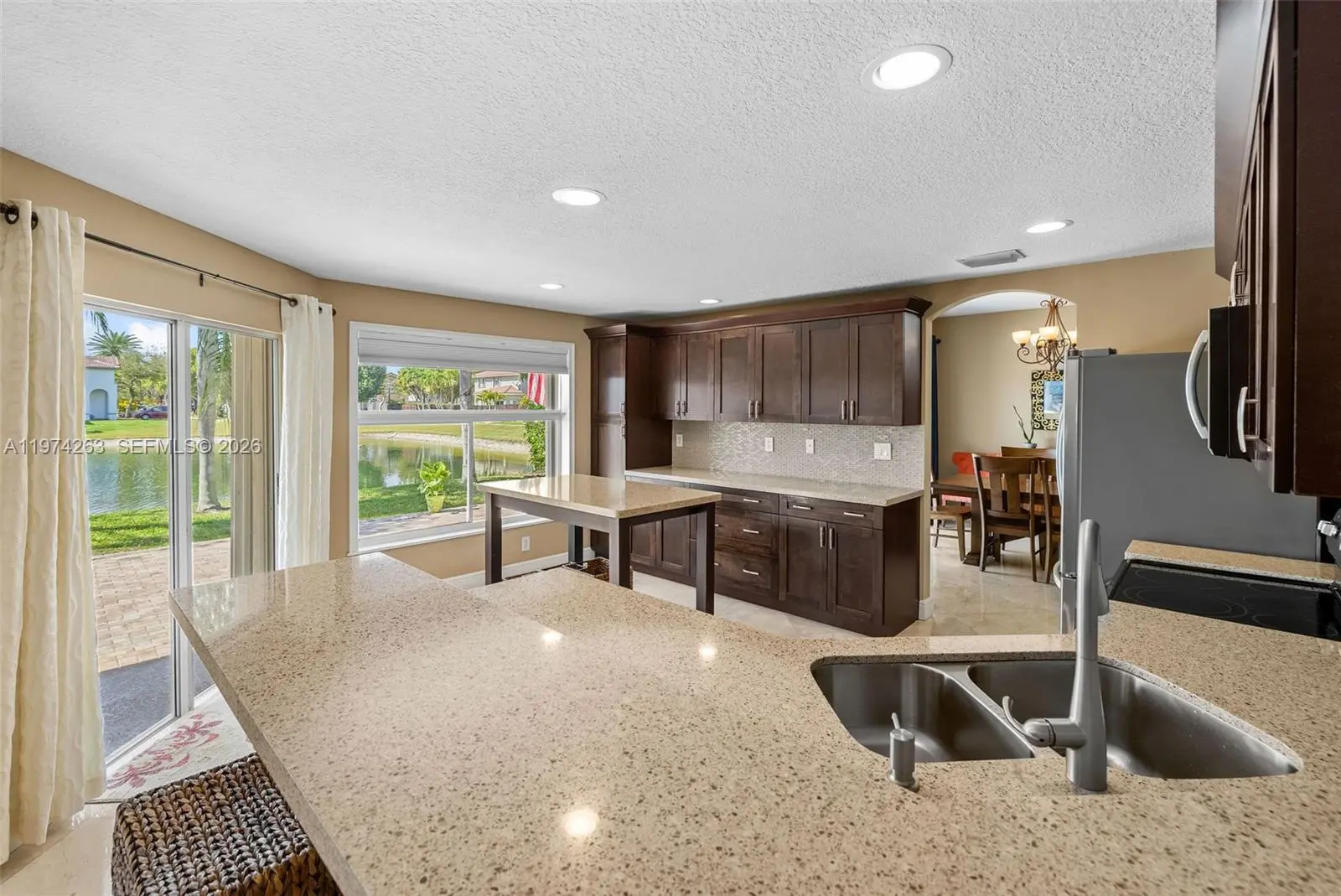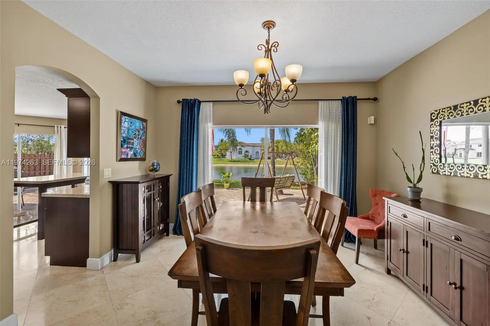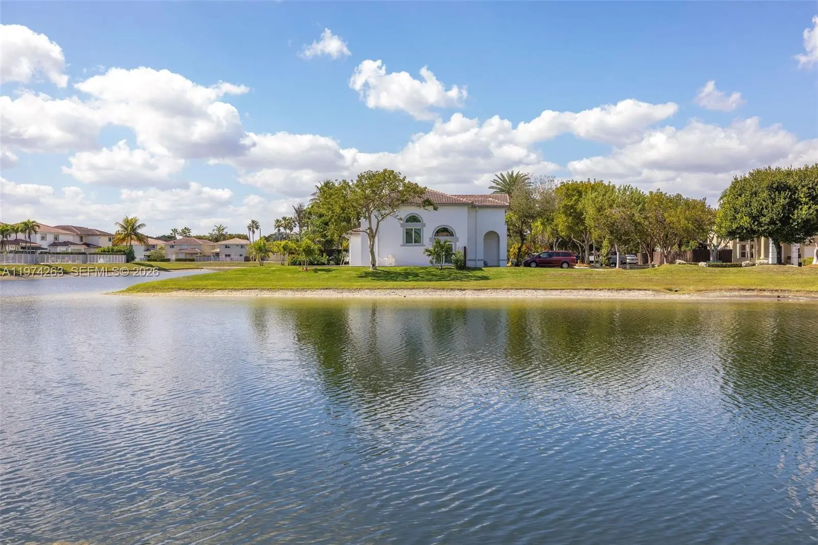 Presenting 4650 NW 109th Court, an exceptional waterfront residence set in a peaceful, elevated position toward the rear of the gated and highly sought-after Doral Meadows community. This true 4-bedroom, 2.5-bath home offers tranquil water views, quality upgrades, and a sense of privacy rarely found. The rear exposure overlooks open water, filling the living areas with natural light and showcasing beautiful sunset views. The layout blends formal and casual spaces with an effortless flow, ideal for both entertaining and everyday living. Interior features include travertine flooring, quartz kitchen countertops, generous cabinetry, and walk-in closets. The primary suite overlooks the lake and features a renovated bath (2021), creating a private retreat within the home. Recent improvements include a new roof (2024) with 10-year warranty, new patio pavers (2025), fresh interior paint (2024), a new refrigerator (2025), washer and dryer (2021), hurricane accordion shutters, impact doors and garage doors, an irrigation system, and A/C under maintenance contract. Parking accommodates up to six vehicles with a two-car garage and extended driveway, a notable advantage in the community. Residents enjoy gated entry with ADT monitoring and access to a community pool. The location offers walkability to A-rated schools, parks, and playgrounds, and is just one mile from Whole Foods, with convenient access to International and Dolphin Malls.