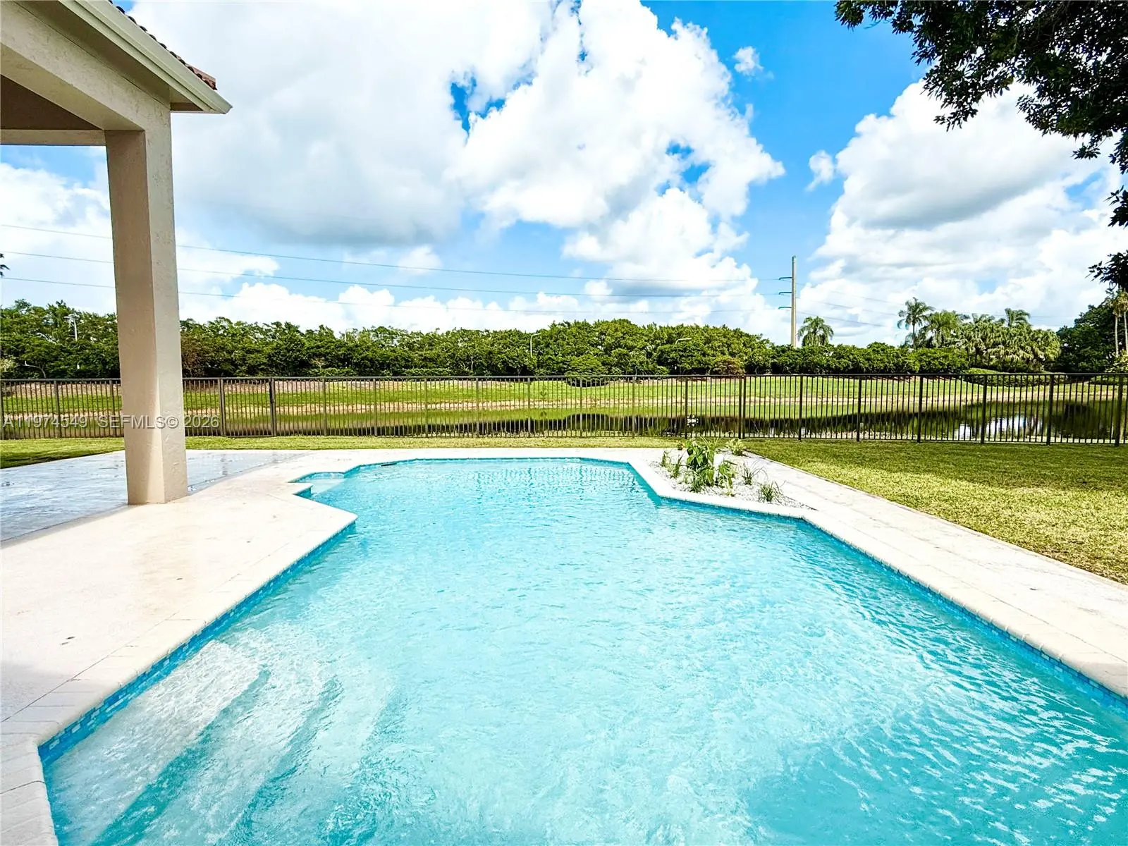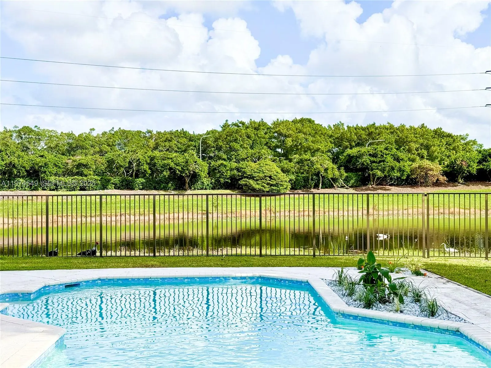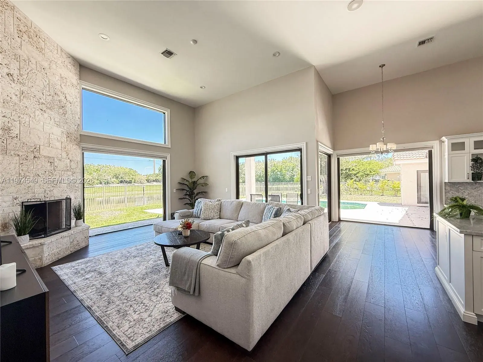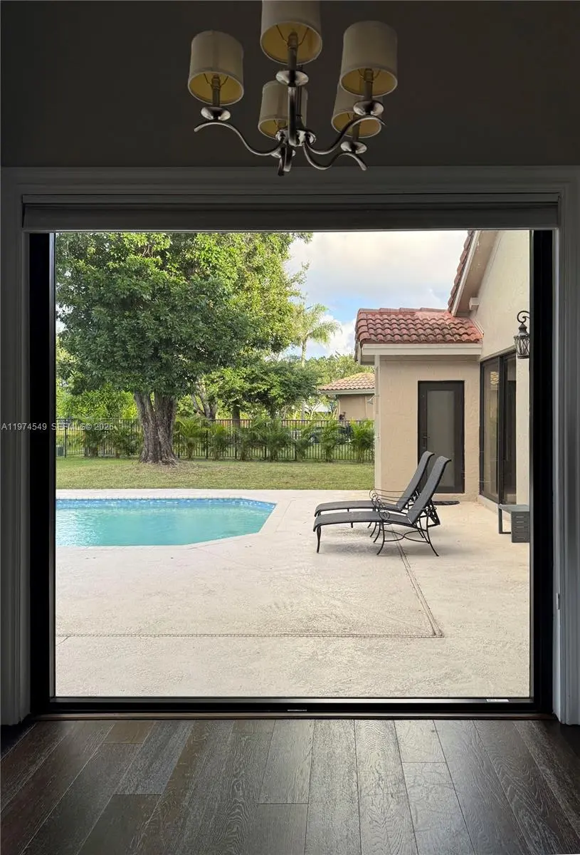 Experience luxury living at its finest in this exquisite lakefront/pool, located in the guard-gated community of Palm Island. Circular driveway + stunning 8ft mahogany front door. 6 BD+den, 4.2 baths, impact windows, 15 ft flat ceilings and wide plank wood flooring. Contemporary kitchen with Carrera marble island and high-end appliances: Subzero fridge, dishwasher, induction cooktop with a pot filler & double ovens. Wet bar. Fireplace A dream primary suite: sitting area, custom walk-in closets, renovated bathroom. 2 en-suites bedrooms. Expansive fenced yard with pool and detached cabana bath. The perfect outdoor retreat for relaxation and entertaining. Privacy in stunning lakefront location. This home blends luxury, comfort, and near parks, shopping, sports, and A+ schools Cypress Bay HS