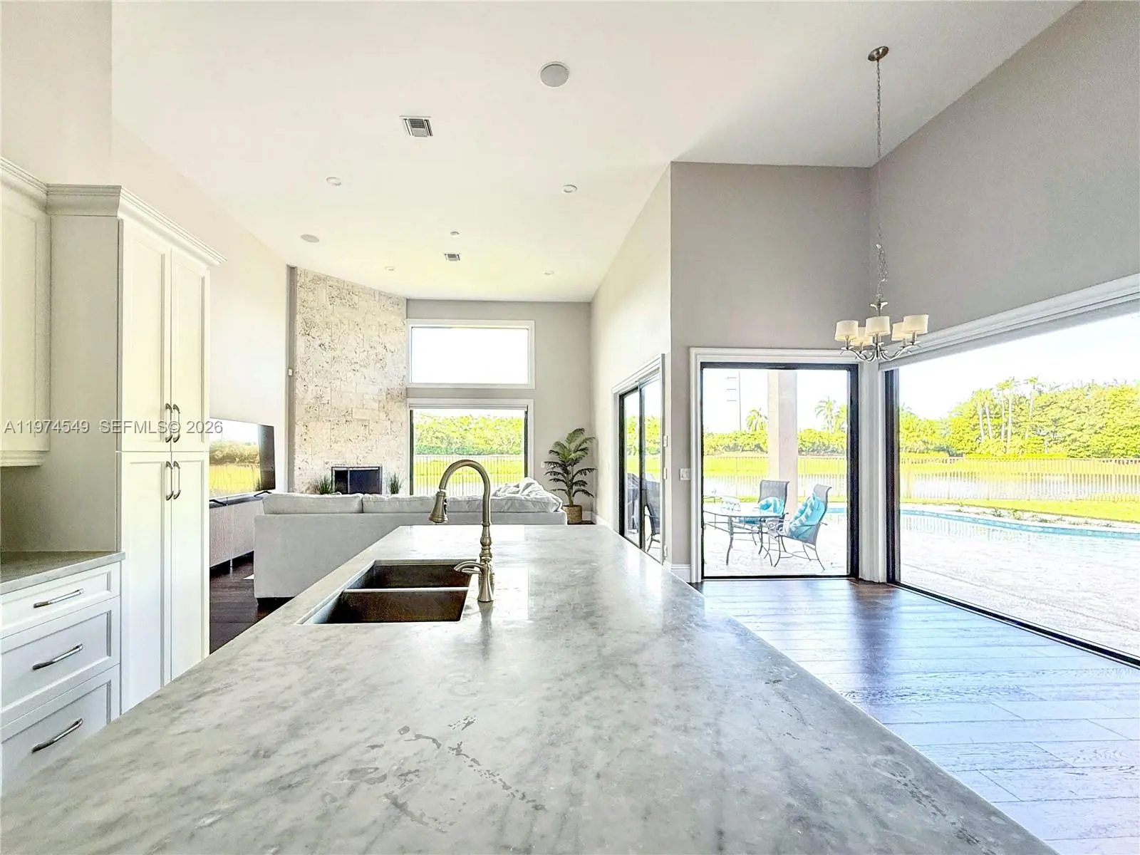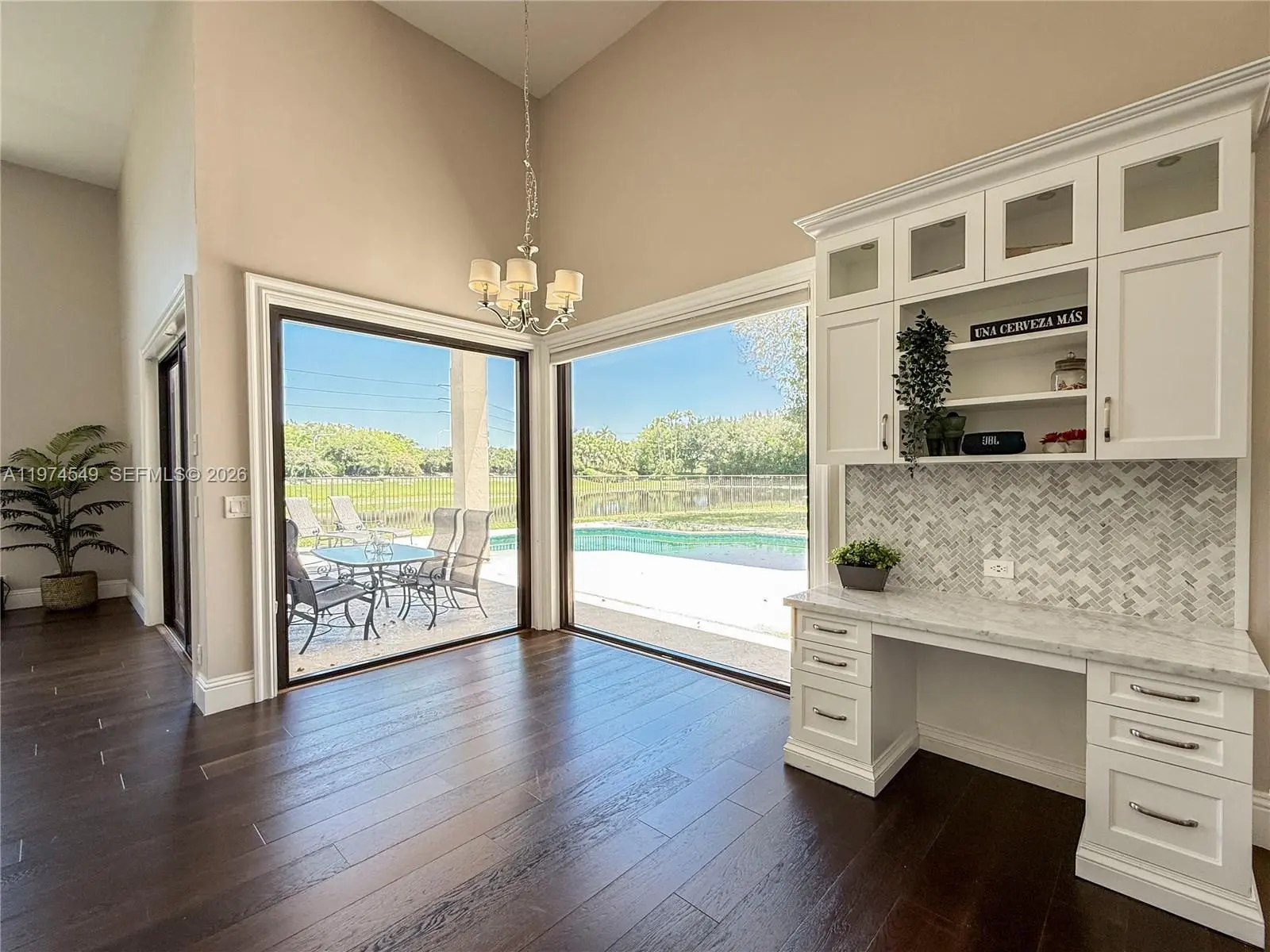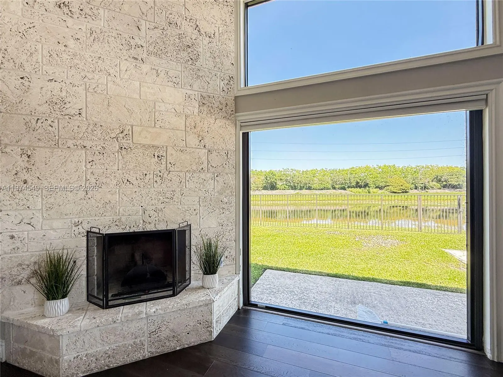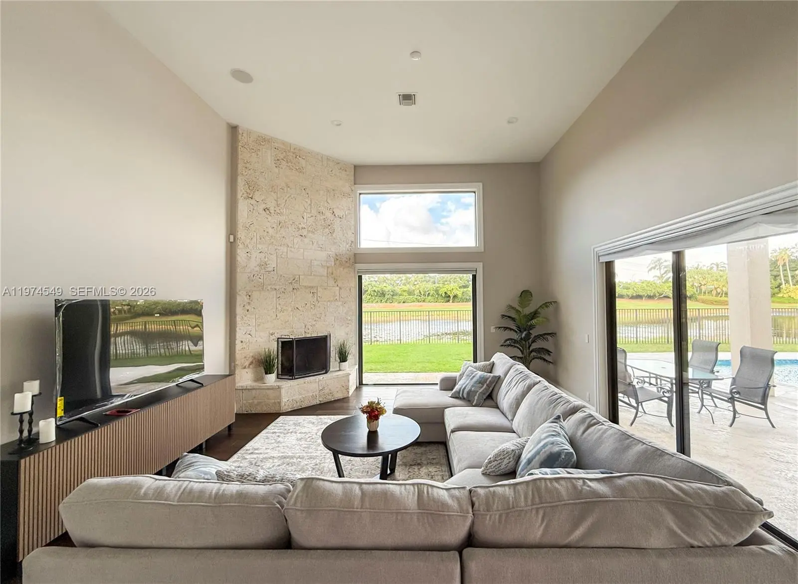 Experience luxury living at its finest in this exquisite lakefront/pool, located in the guard-gated community of Palm Island. Circular driveway + stunning 8ft mahogany front door. 6 BD+den, 4.2 baths, impact windows, 15 ft flat ceilings and wide plank wood flooring. Contemporary kitchen with Carrera marble island and high-end appliances: Subzero fridge, dishwasher, induction cooktop with a pot filler & double ovens. Wet bar. Fireplace A dream primary suite: sitting area, custom walk-in closets, renovated bathroom. 2 en-suites bedrooms. Expansive fenced yard with pool and detached cabana bath. The perfect outdoor retreat for relaxation and entertaining. Privacy in stunning lakefront location. This home blends luxury, comfort, and near parks, shopping, sports, and A+ schools Cypress Bay HS