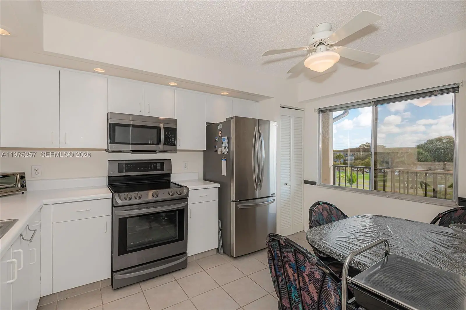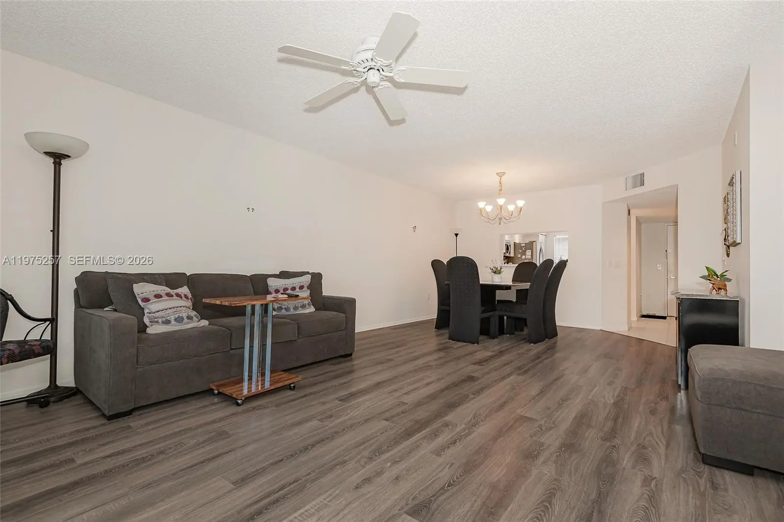 Well-maintained 2-bedroom, 2-bath “Jasmine” model offering 1,207 sq ft in the 55+ community of Century Village Pembroke Pines. Located in Suffolk E (built in 1995), the NEWEST SECTION of the community. Situated on the 4th floor of a 4-story building with ELEVATOR access. This functional layout features an EAT-IN KITCHEN with STAINLESS STEEL appliances and high-hat lighting. Engineered wood flooring throughout with tile in the entry/foyer. Spacious primary bedroom includes a WALK-IN CLOSET and en-suite bath with WALK-IN SHOWER. WASHER & DRYER inside the unit. CENTRAL A/C. Screened patio with sliding doors and additional STORAGE CLOSET. Ample guest parking nearby. **Building is conveniently located near the community walking path, pickleball courts (approx. 3-minute walk), tennis courts (approx. 2-minute walk), nearby houses of worship, and medical center (approx. 6-minute walk). Monthly maintenance is $760.90 (CVP $306.90 + FirstService $454) and includes water, sewer, trash, internet, and cable. **No rentals permitted within the first 2 years of ownership** Community amenities include clubhouse, multiple pools, fitness center, tennis courts, theater, organized activities, and courtesy transportation. Convenient access to shopping, dining, and medical facilities. Easy to show.