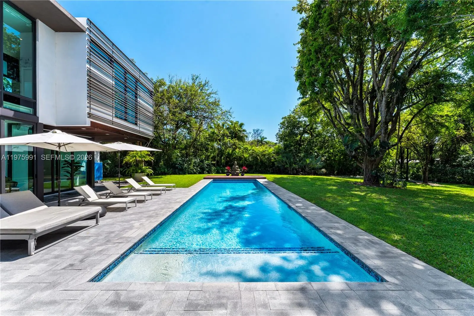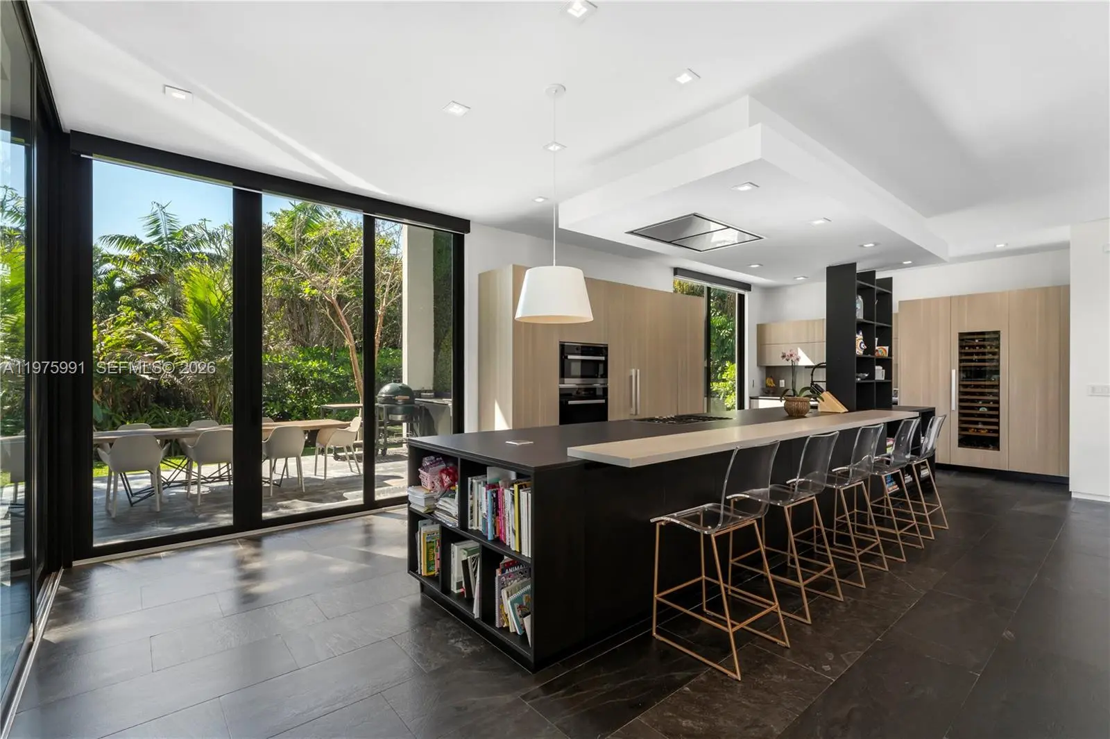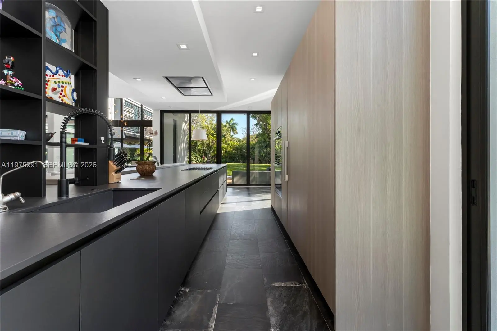 Completed in 2019 by Norway Builders, this exceptional residence sits on a coral ridge along a quiet, tree-lined street on a lush acre lot. Soaring 25+ ft ceilings and expansive open living areas are filled with natural light and overlook a professionally landscaped, resort-style backyard with sparkling pool. Upstairs offers 5 bedrooms, 4 baths, and a family room; the main level includes a VIP guest suite and staff quarters. High-end finishes feature an Italian kitchen and closets, Miele appliances, Spanish stone, oak floors, glass railings, and a dramatic pivot entry door. Per appraisal: 6,267 LA, 7,095 adjusted, 8,989 total. Includes 16kW solar and Tesla battery backup.