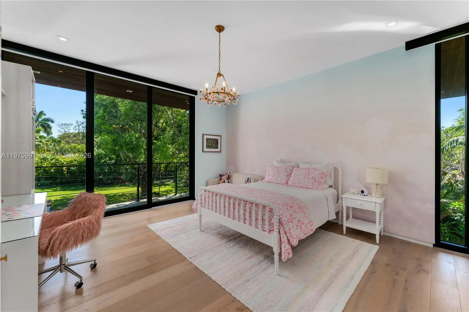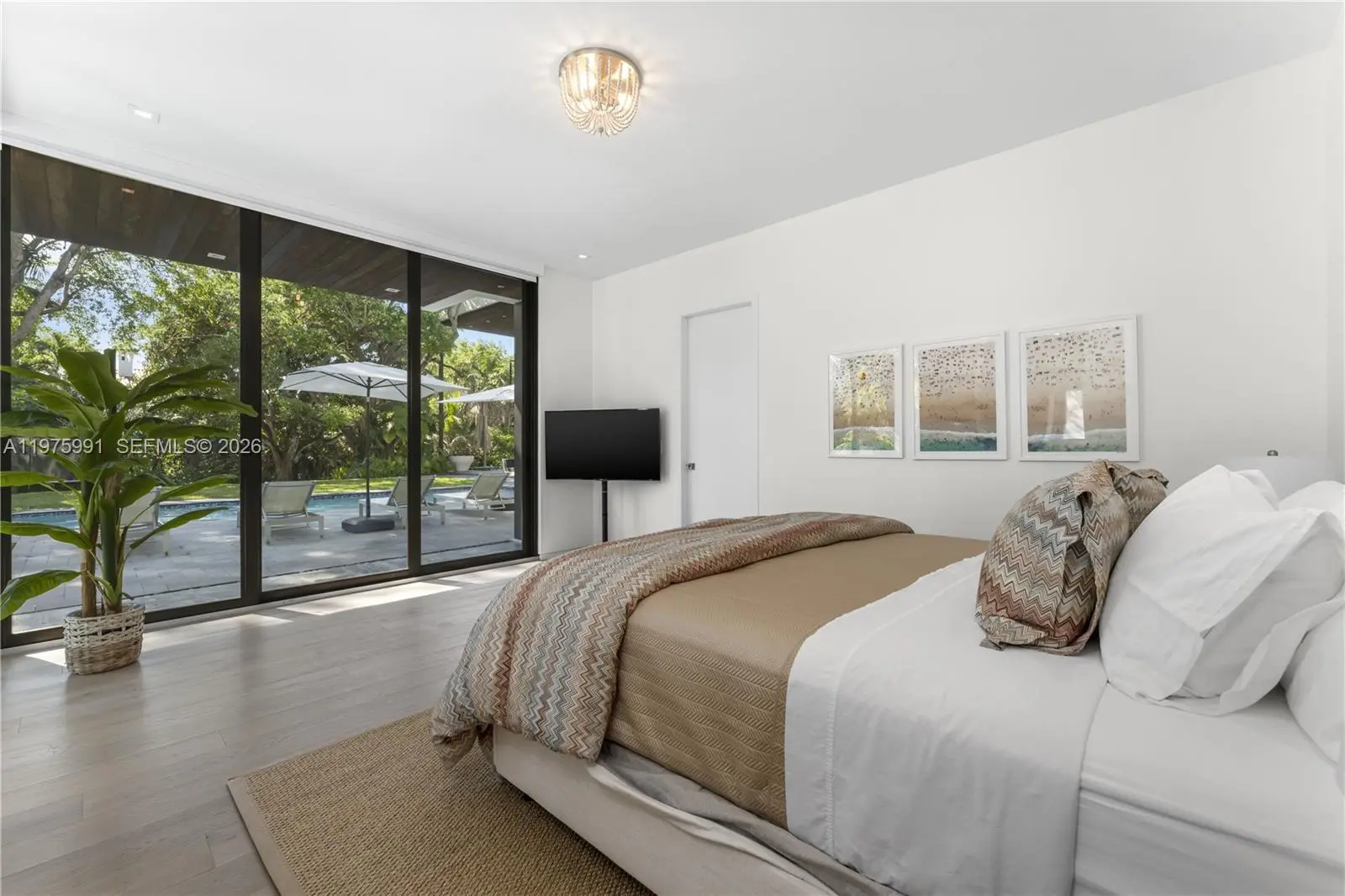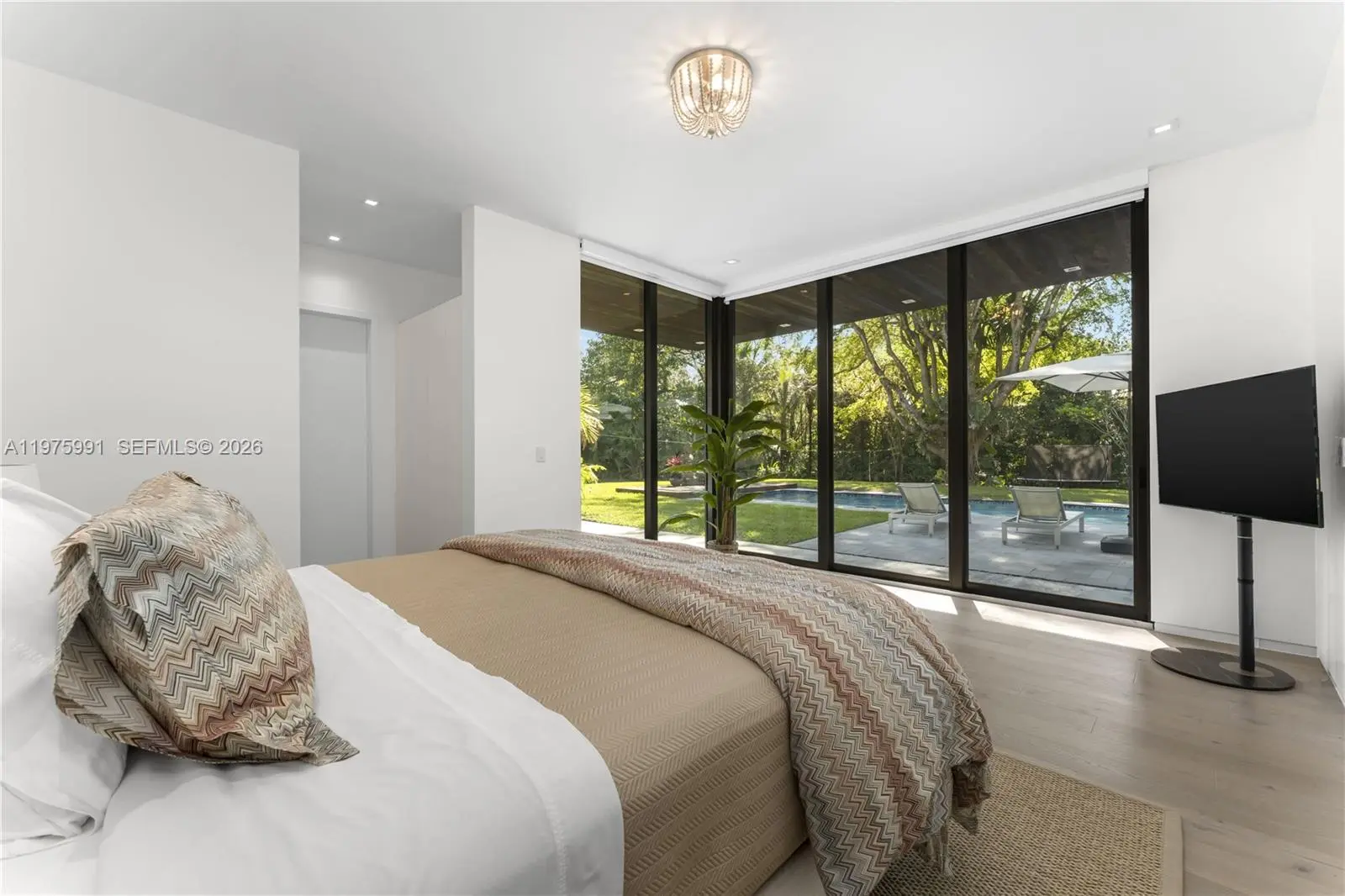 Completed in 2019 by Norway Builders, this exceptional residence sits on a coral ridge along a quiet, tree-lined street on a lush acre lot. Soaring 25+ ft ceilings and expansive open living areas are filled with natural light and overlook a professionally landscaped, resort-style backyard with sparkling pool. Upstairs offers 5 bedrooms, 4 baths, and a family room; the main level includes a VIP guest suite and staff quarters. High-end finishes feature an Italian kitchen and closets, Miele appliances, Spanish stone, oak floors, glass railings, and a dramatic pivot entry door. Per appraisal: 6,267 LA, 7,095 adjusted, 8,989 total. Includes 16kW solar and Tesla battery backup.