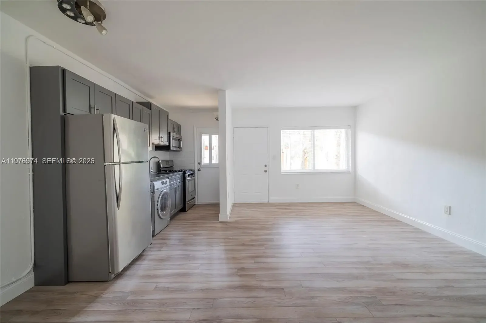 Modern 1-bed / 1 bath garden-style condo east of US-1 in South Miami. First-floor unit with no stairs. Fully renovated with ceramic wood-look floors, updated bathroom, and modern kitchen featuring subway tile backsplash, gas stove, and butcher block countertops. Spacious walk-in closet and washer/dryer in unit. Quiet, private building with a beautiful pool. 1 assigned parking space plus ample guest parking. Prime location minutes from Baptist Health, Sunset Place, MetroRail, Dadeland Mall, and the University of Miami.