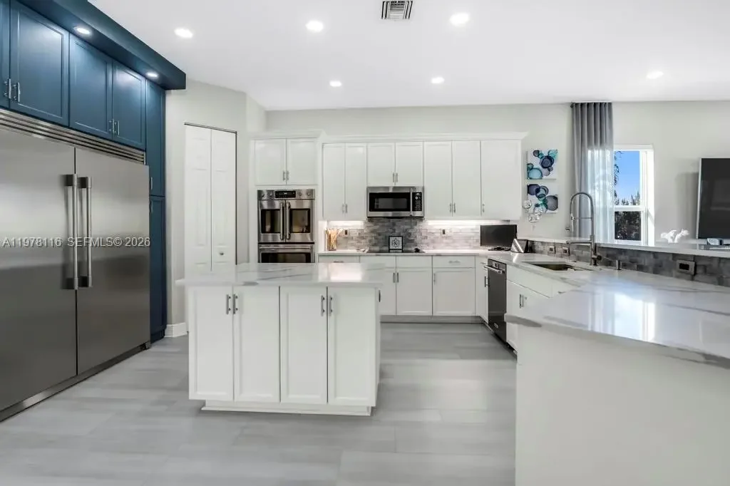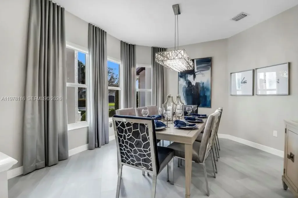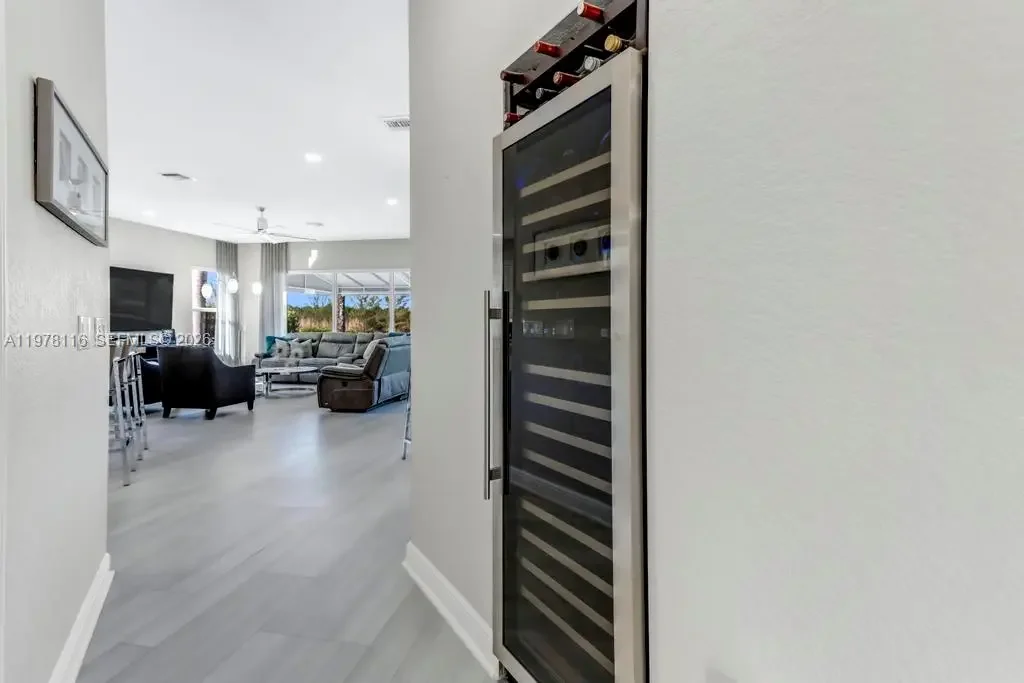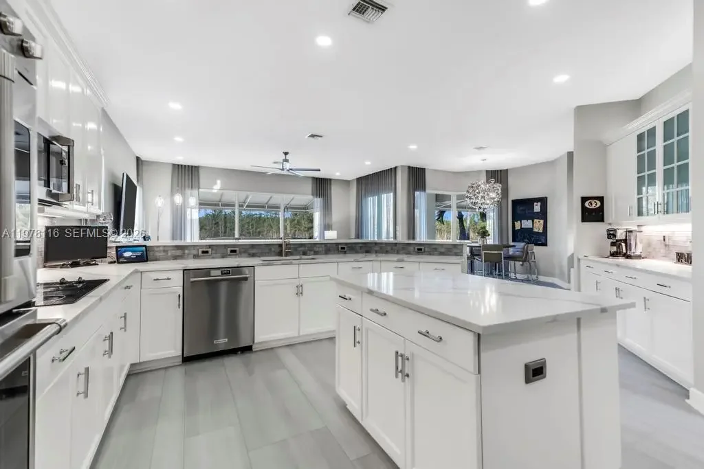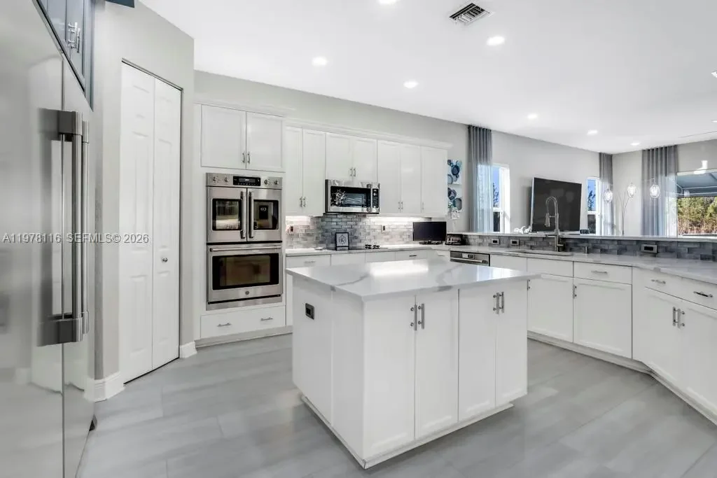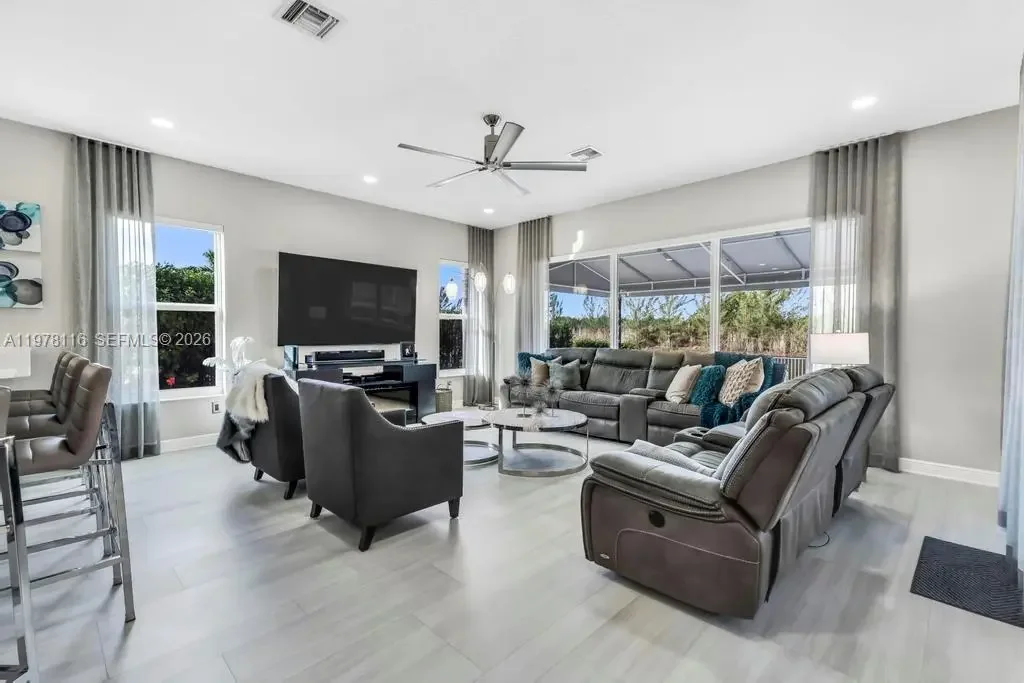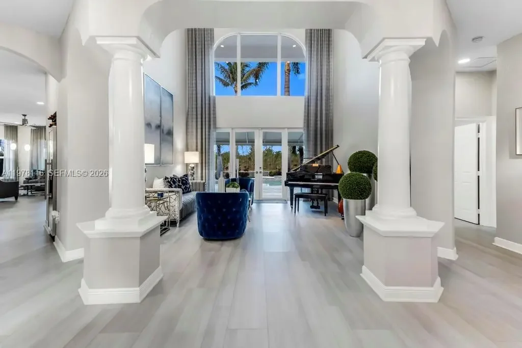 Fully remodeled Sonoma model from top to bottom, this extraordinary residence shows like a designer model home and offers an elevated living experience. High-end finishes and timeless design, including a brand new metal roof, newer AC systems, hurricane impact windows and doors, & a full-house generator for comfort and peace of mind. Oversized circular driveway finished with marble pavers, set on an expansive lot with fresh exterior paint and beautiful curb appeal. Step inside to a bright interior featuring brand new flooring throughout, soaring ceilings, and an abundance of natural light. Custom designer window drapes and treatments add a refined touch, complemented by modern lighting fixtures and fresh interior paint. The chef’s kitchen is a true showpiece, featuring luxurious marble countertops, top-of-the-line appliances, custom cabinetry, and an open layout overlooking the main living areas perfect for entertaining. Upstairs, a bright sitting area welcomes you with natural light, while the oversized primary suite offers a private balcony with beautiful pool and tranquil lake views. Additional guest bedrooms are generously sized and share an updated Jack-and-Jill bathroom. The garage features a custom golf simulator, and the home is fully integrated as a smart home allowing control directly from your phone. Step outside to a peaceful backyard retreat with a sparkling pool, serene lake views, and lush surroundings—creating the perfect setting for relaxing or entertaining.