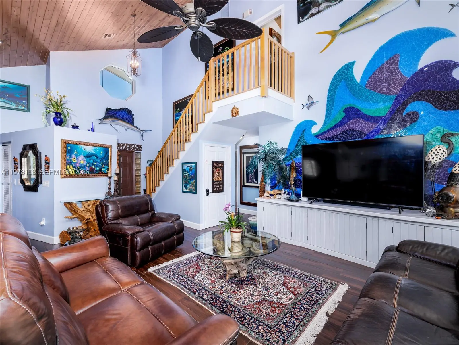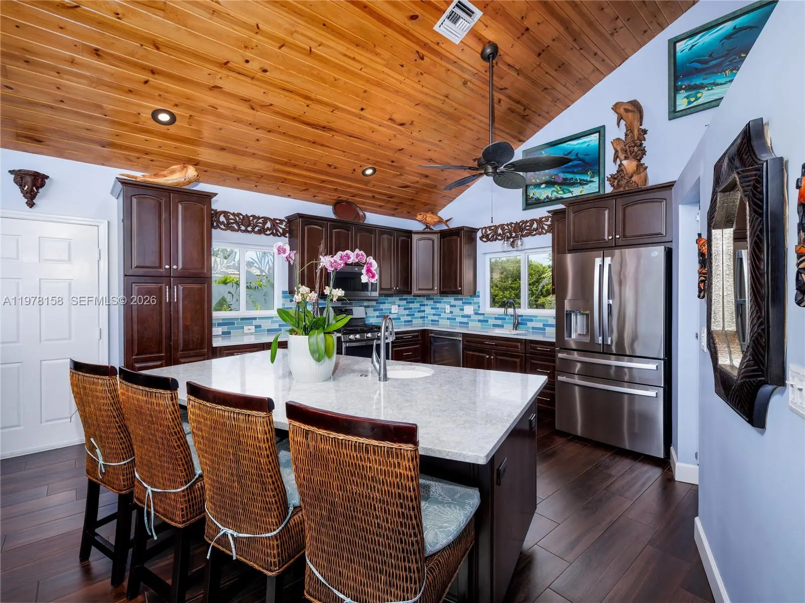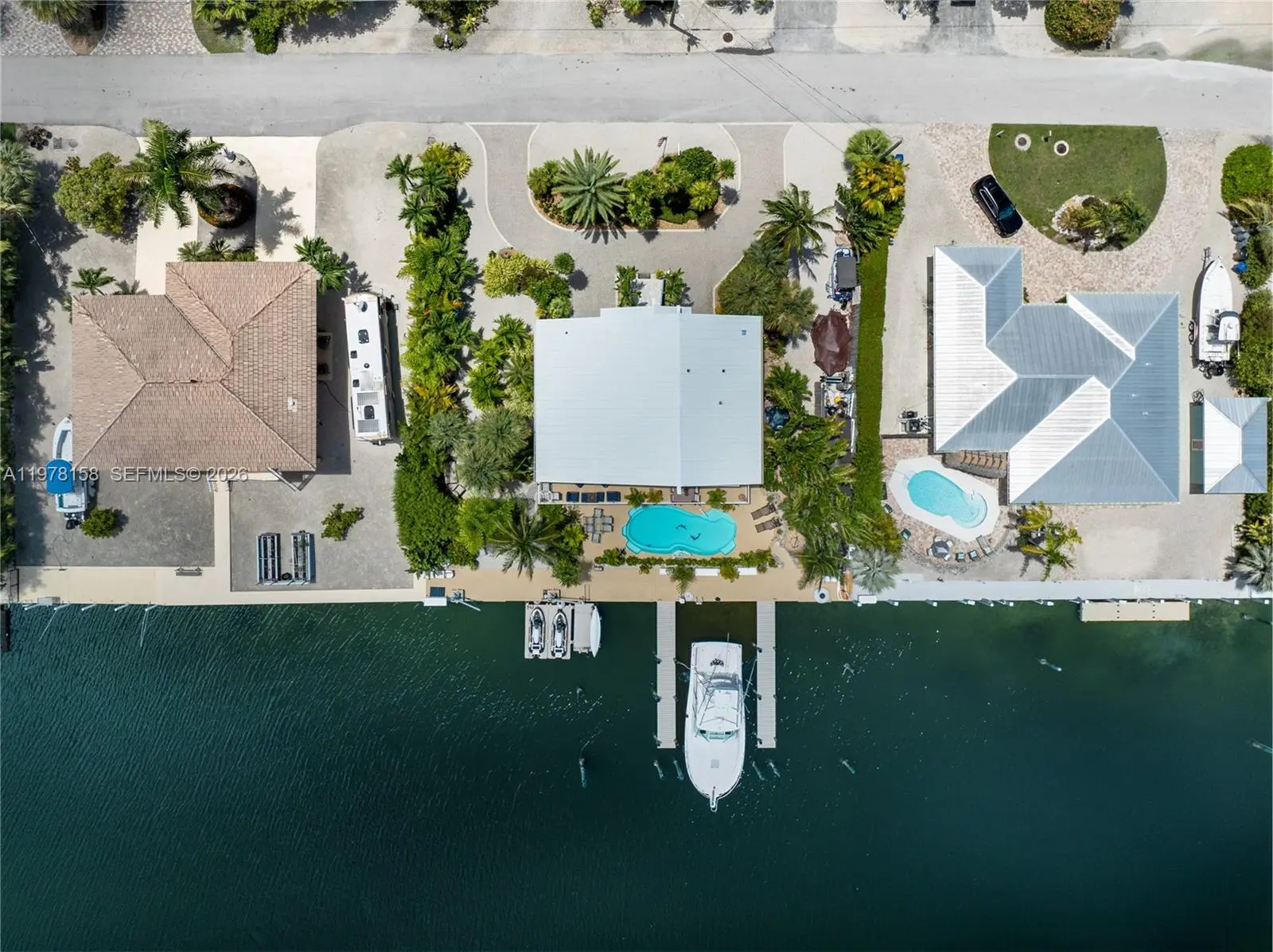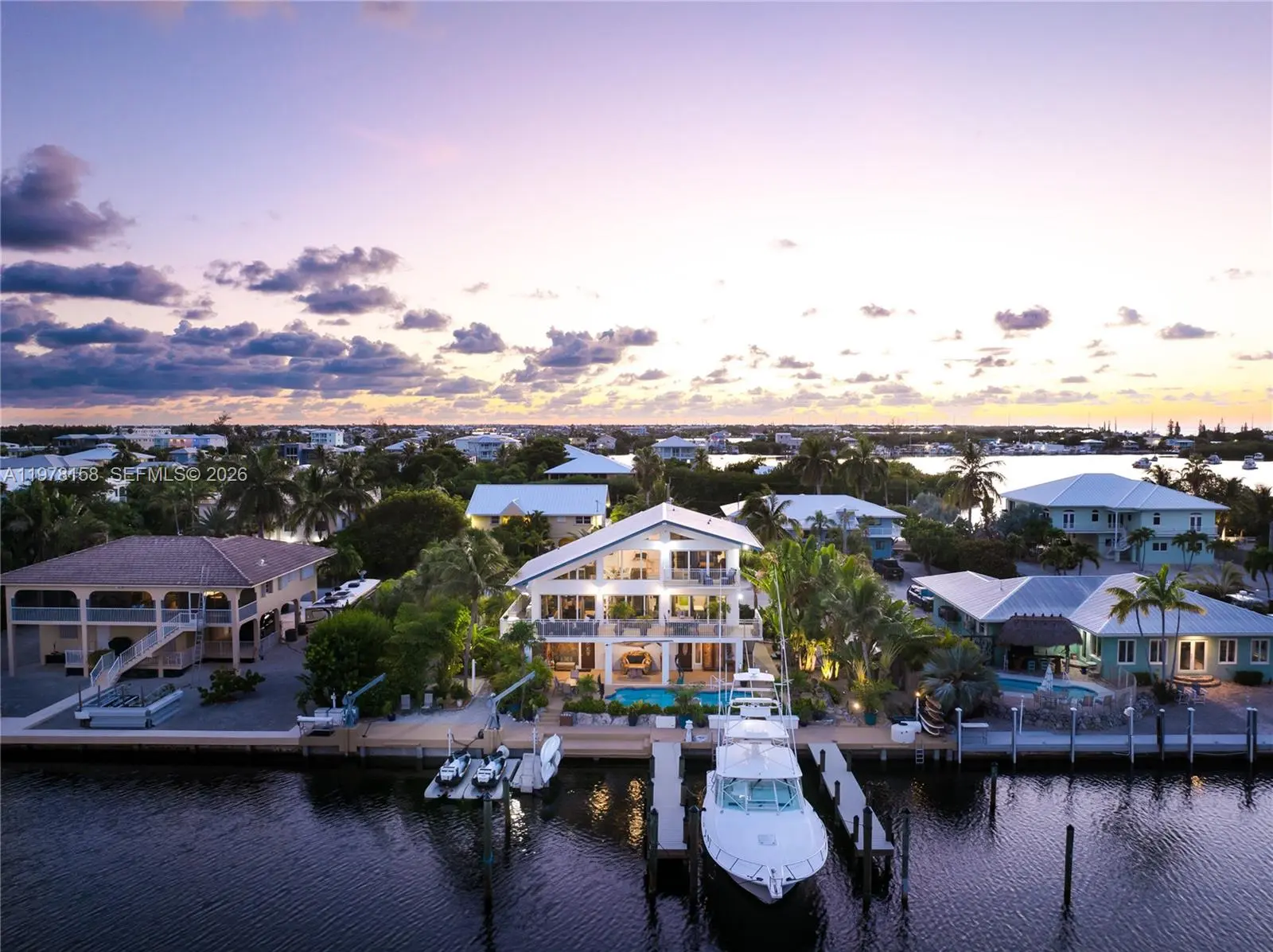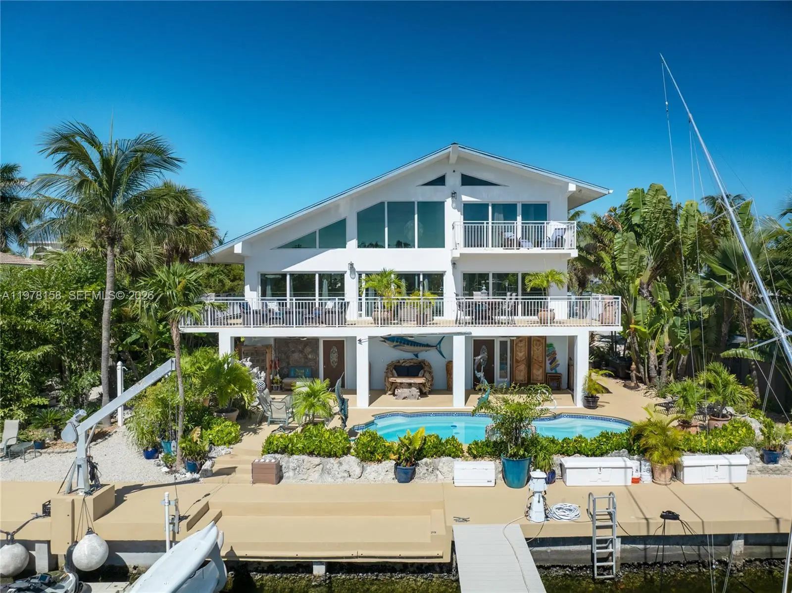 A rare waterfront estate along a 200-foot wide canal with a 110-foot dock and direct ocean access, capturing the essence of Florida Keys living. Spanning over 3,200 square feet, this residence features four bedrooms and three-and-a-half baths, ideal for hosting family and guests in true island style. Inside, a dramatic grand staircase and soaring two-story great room create an inviting yet refined atmosphere. Walls of windows frame tranquil water views and fill the space with natural light, providing the perfect setting for entertaining or relaxing after a day on the water. The kitchen offers granite countertops, stainless steel appliances, and an open layout that seamlessly connects the living and dining areas. Outside, your private waterfront retreat awaits. The 110-foot concrete dock with dual 40-foot finger piers provides exceptional deep-water dockage for multiple vessels, including large yachts, with quick Atlantic access. Boaters will appreciate the floating jet ski and kayak docks, davits, fish-cleaning station, and ice machine. Surrounded by lush tropical landscaping, the heated pool and spa create a secluded oasis where island breezes and sunshine define everyday living. Whether enjoying mornings on the water, afternoons poolside, or evenings under the stars, this property delivers the luxury and lifestyle of the Florida Keys.