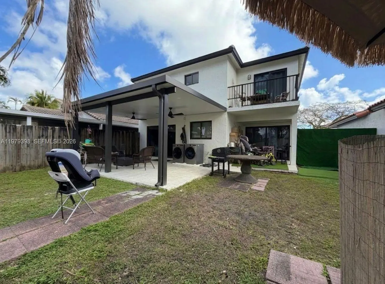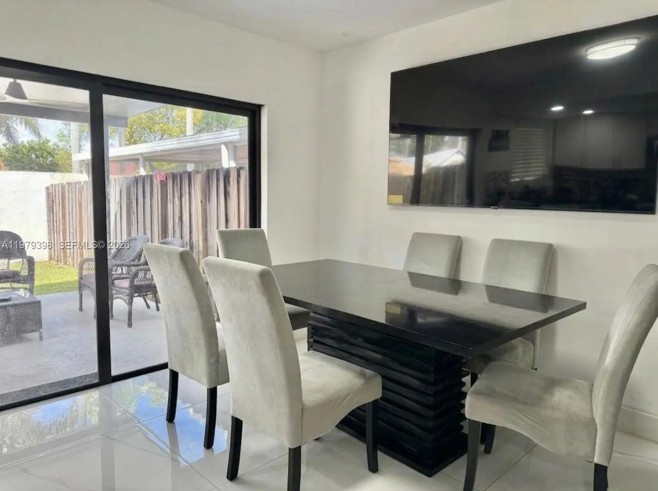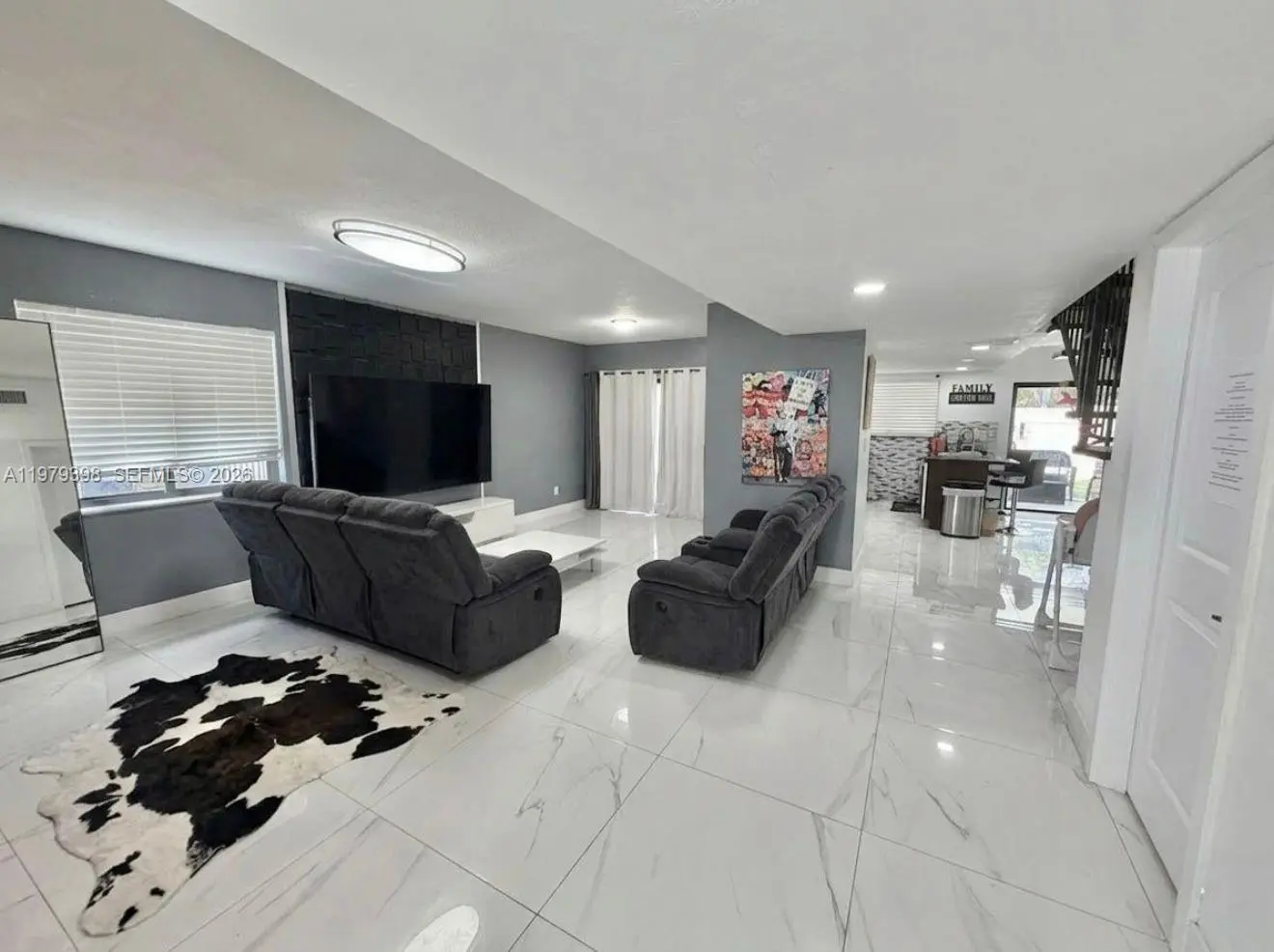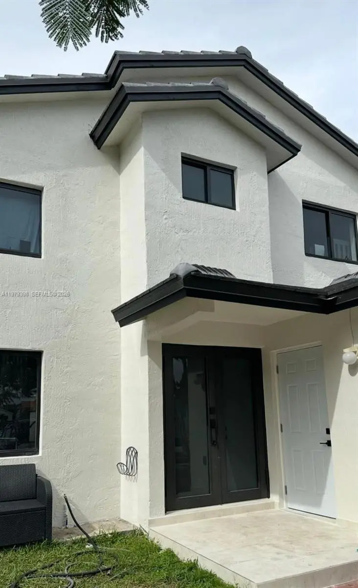 Beautiful single family home, fully remodeled and NO ASSOCIATION. This property features 4 Bed and 2.5 Bath, additional Garage - laundry room can be converted for an in-laws separate room or business office. Open floor plan with large living, dining, family, and spacious kitchen with quartz countertops and stainless steel appliances, porcelain tiled floor throughout the property. Updated in 2023 with new roof, impact windows and doors and AC. Ample backyard with pergola and space for a pool, convenient separate exit door in the patio allowing walking distance access to supermarkets and shops, near Sugarwood Park, Claude Pepper Elementary. Neat property, move in ready. No HOA.