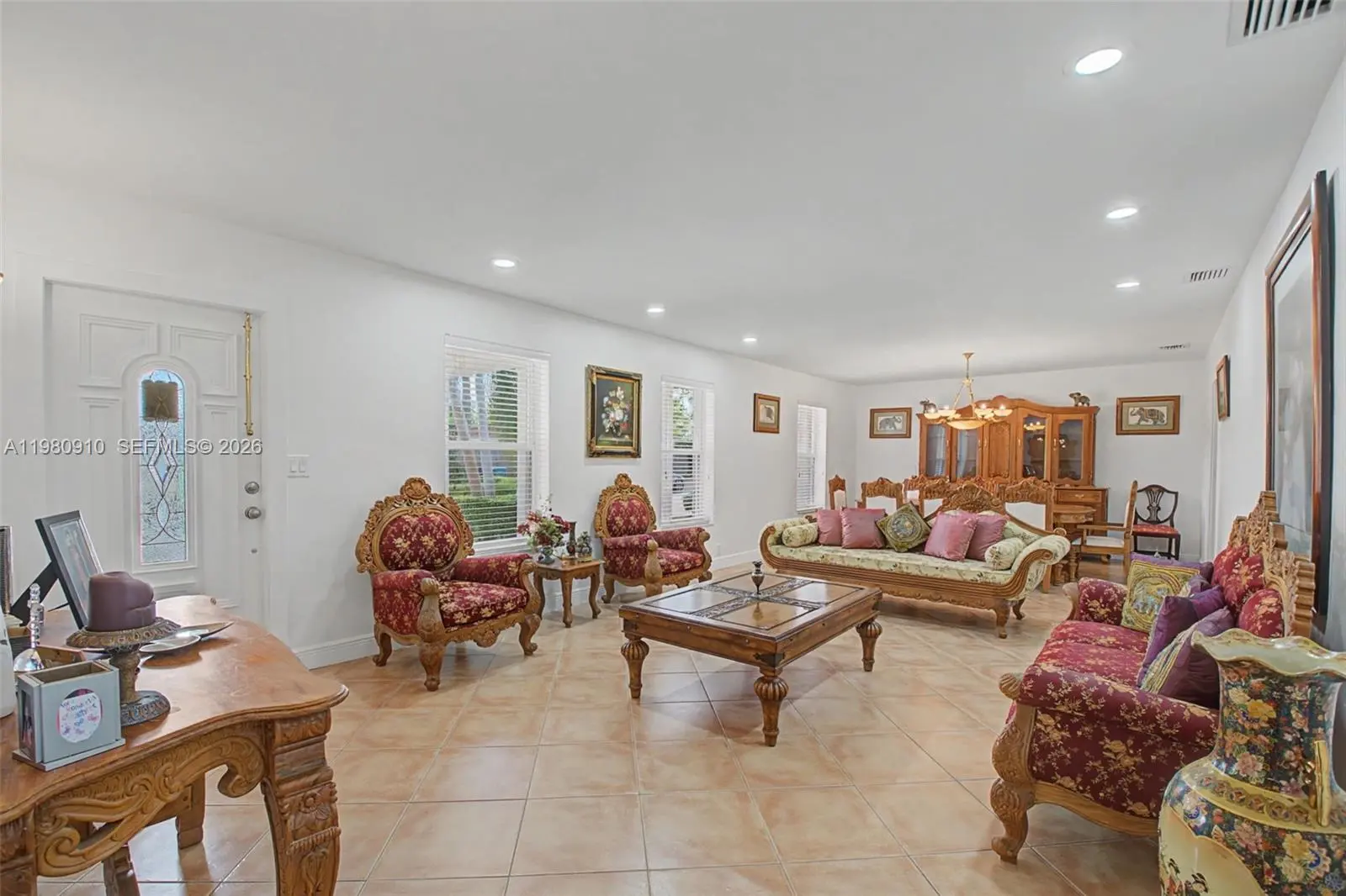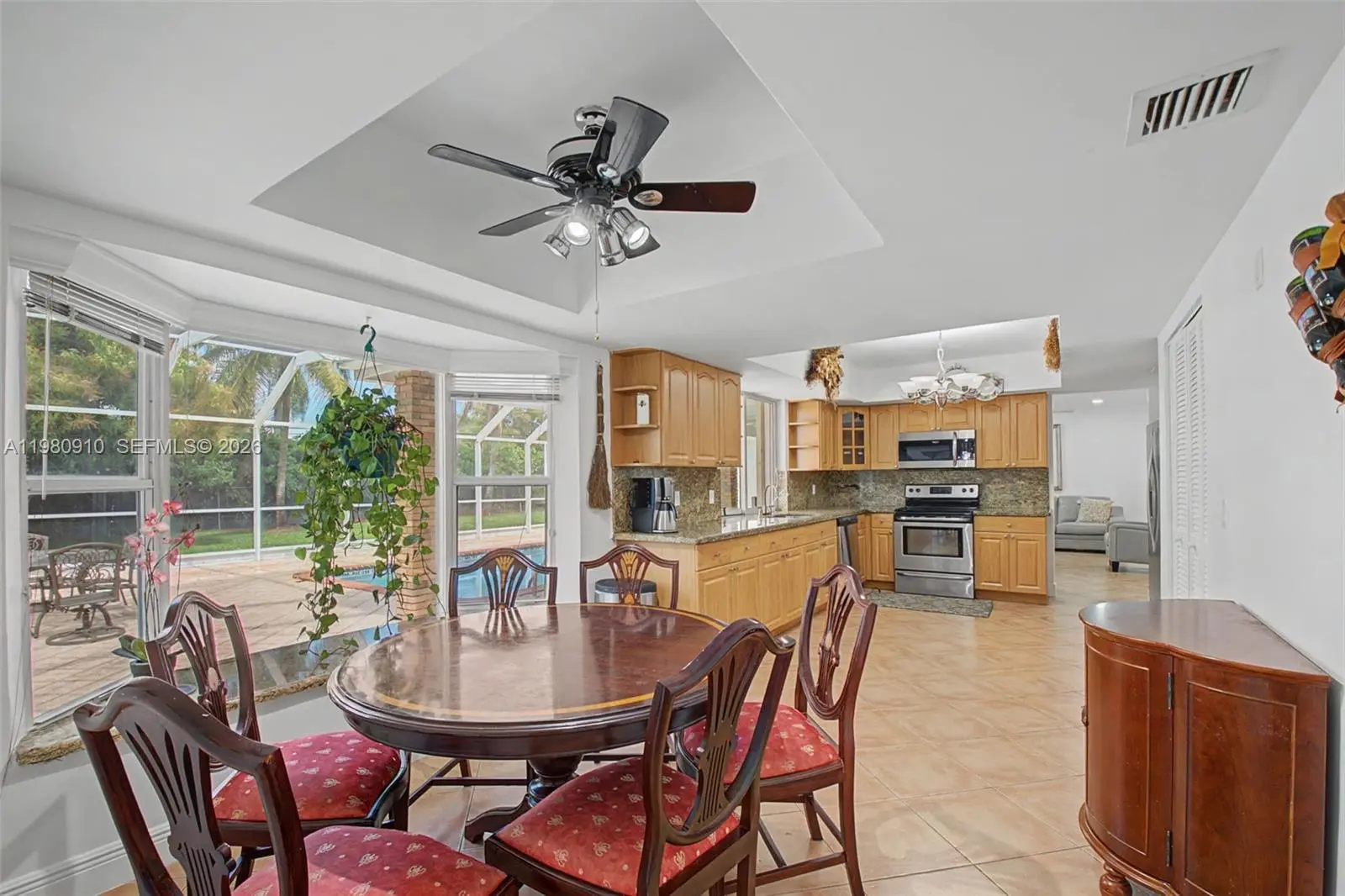 Well-maintained 4 bdrm/ 4 bath home in the unparalleled community of Mangowood in North Palmetto Bay. Charming front porch provides convenient covered entry. Open formal living/dining area. Eat-in kitchen with breakfast nook and a bay window overlooking the beautiful pool area connects to the family room. Tile and laminate flooring. Lovely primary suite with walk-in closets, marble primary bath, separate tub and shower. Spacious indoor laundry room w sink and cabinetry. Accordion hurricane shutters. Stamped concrete circular driveway. 2 car side entry garage. Fenced backyard with double gate and space for parking a boat. Screened pool and patio. A couple short blocks to Coral Reef Park complete with walking paths, youth sports, playground, community events and brand-new pickleball courts.