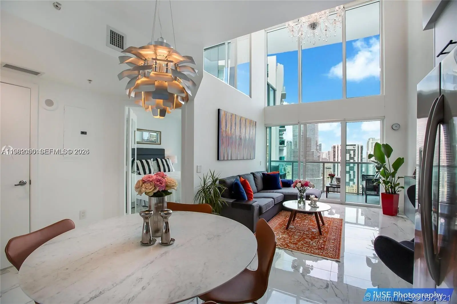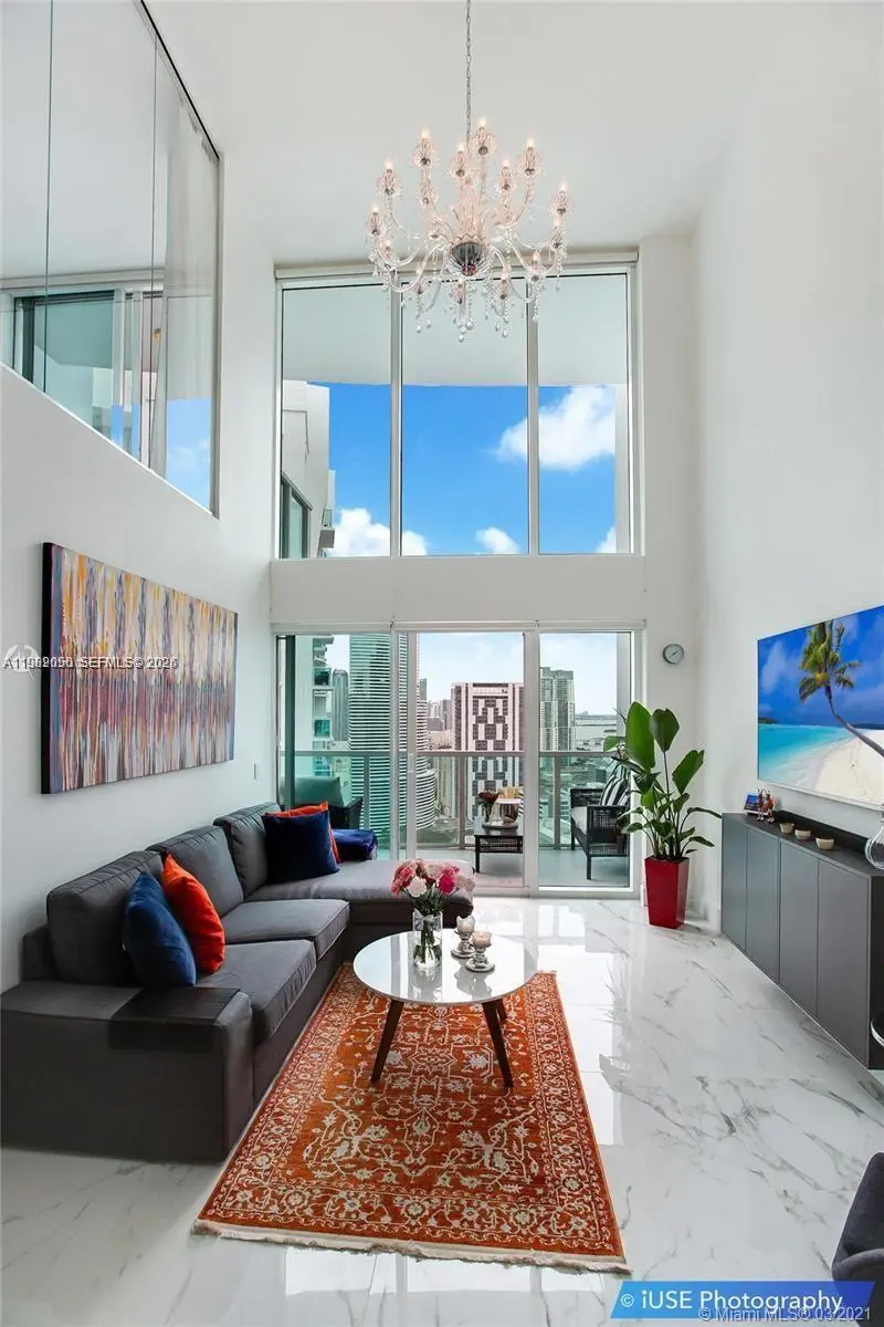Exceptional 2-story loft residence at Brickell on the River South Tower offering 1,510 SqFt of bright, open living space. This unique 2BD/2BA layout truly feels like a townhome in the sky, featuring dramatic double-height ceilings and floor-to-ceiling windows that fill the home with natural light. The main level offers an open living and dining area, modern kitchen with stainless steel appliances, and elegant designer chandeliers. Upstairs, the loft-style primary suite with glass walls overlooks the living area, creating a striking architectural feature. Enjoy beautiful city and Miami River views from the private balconies. Located in the heart of Brickell, just steps from dining, shopping, the riverwalk, and Brickell City Centre.