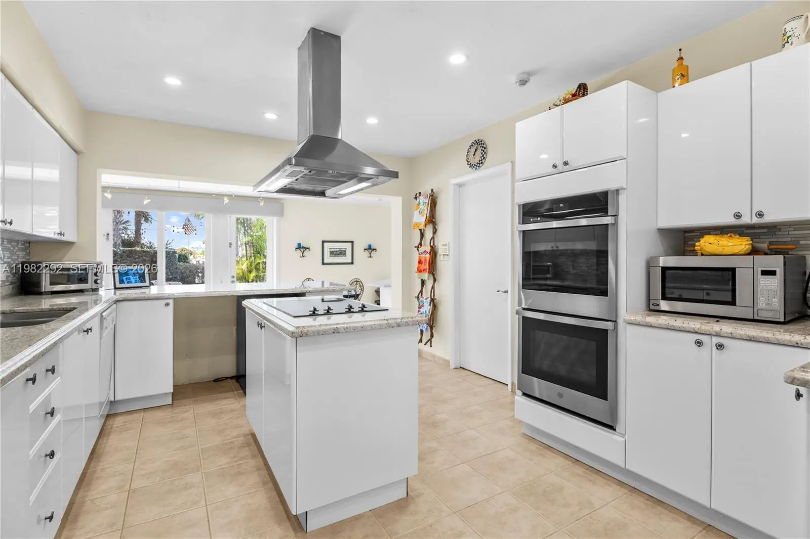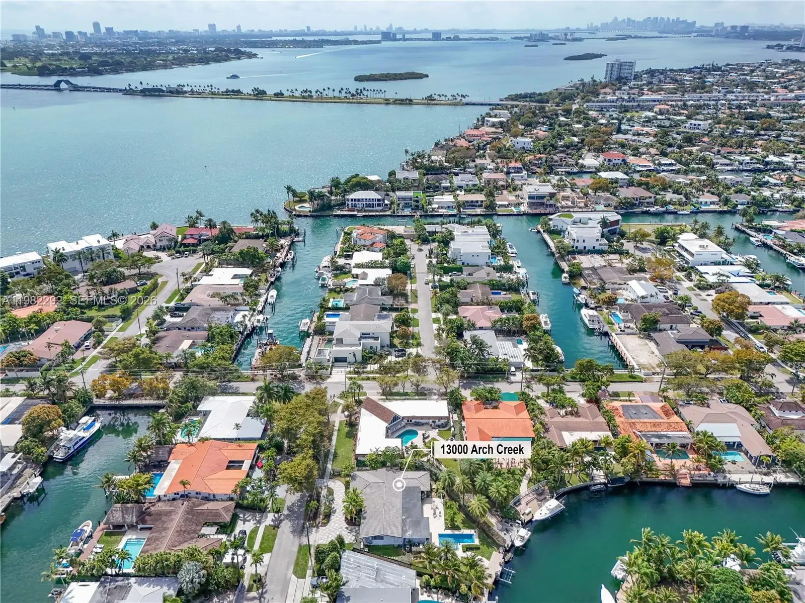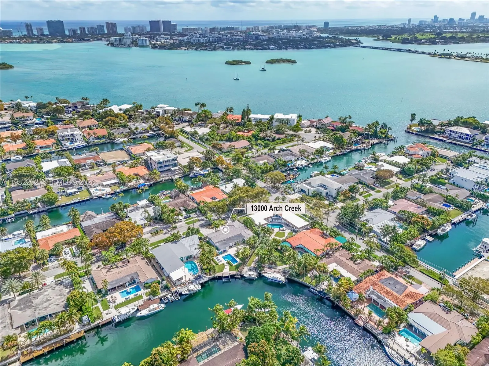 Welcome to Island 5 in prestigious Keystone Point, where this 4-bedroom, 4.5-bath waterfront home sits on an oversized 13,020 sq ft lot designed for enjoying beautiful sunset views. The backyard offers the perfect setting for relaxed waterfront living, featuring a custom heated pool with a built-in in-water table for shaded lounging, an expansive pool deck, and a large grassy area ideal for entertaining. With 47 feet on the water, the property includes a newer seawall, a 30-foot dock, and a working 13,000-lb boat lift—perfect for boaters seeking quick access to open water with just one turn to the bay. Inside, natural light fills the living spaces. The open dining area overlooks the circular driveway, and all four bedrooms are generously sized with ample closet space. The spacious primary suite features two walk-in closets and a large bath. A two-car garage completes the home. Ideally located near Bal Harbour, premier shopping, Whole Foods, and I-95, this property offers a rare opportunity to renovate or reimagine your dream waterfront oasis in one of Keystone Point’s most desirable islands.