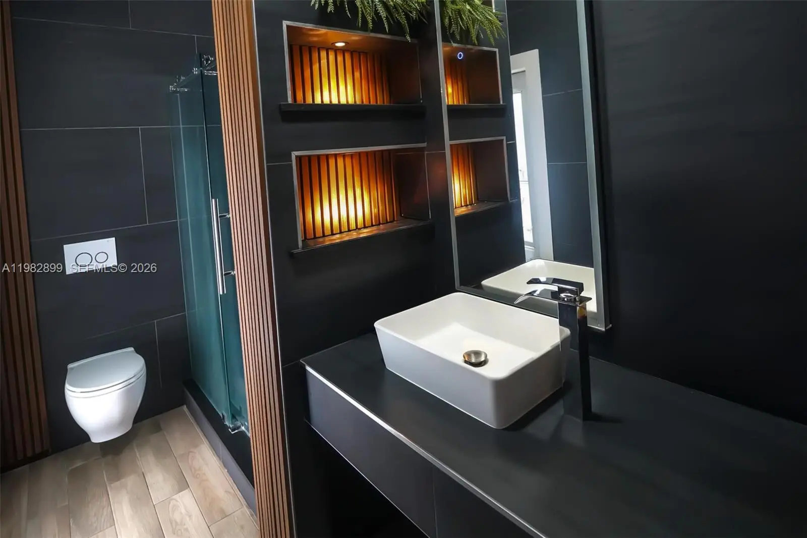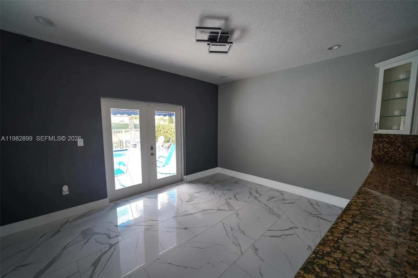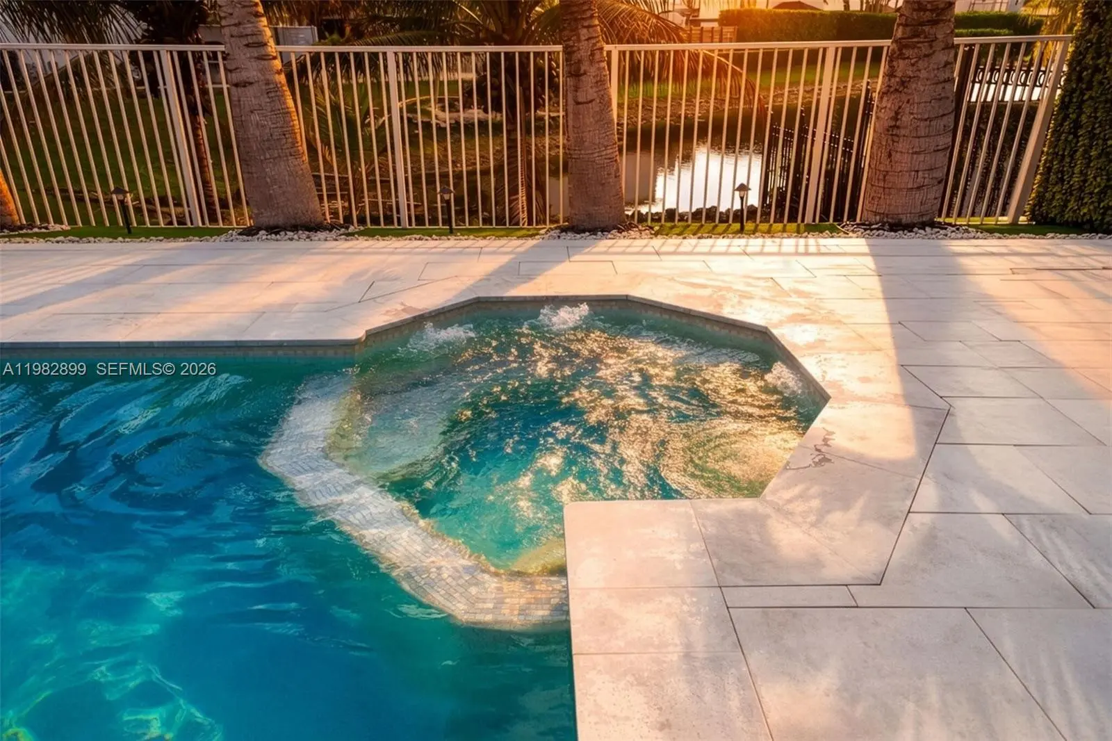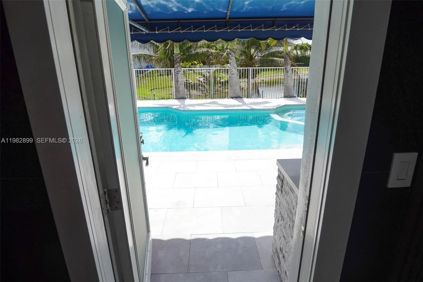 Fully renovated lakefront pool home with modern finishes and a resort-style backyard. Interior renovation completed in 2023 with large-format porcelain tile flooring throughout, updated kitchen with new cabinetry and appliances, and two remodeled bathrooms with floor-to-ceiling tile, frameless glass showers, floating toilets, and modern vanities. The backyard overlooks the lake and features premium marble sand tile decking, a saltwater pool with integrated spa and sundeck, new pool heater, artificial grass landscaping, and a covered outdoor kitchen. Additional features include gated side access with space for RV or boat parking, impact doors leading to the pool area, Titan tankless water heater, and a new central A/C system installed in 2024. Located near shopping, restaurants.