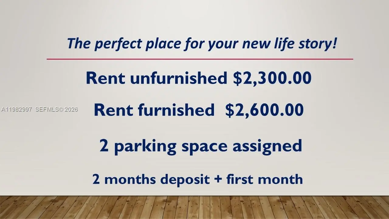 2 bedroom unit, painted, lake view, pool, gym, clubhouse and playground. Close to malls, main highways and restaurants. 2 Assigned parking lots. Unfurnished $2,300.00 Furnished $2,600.00.