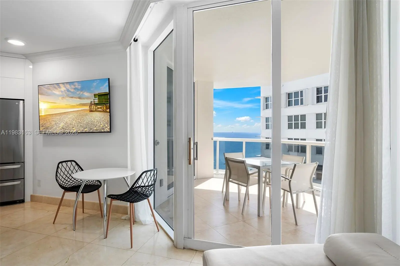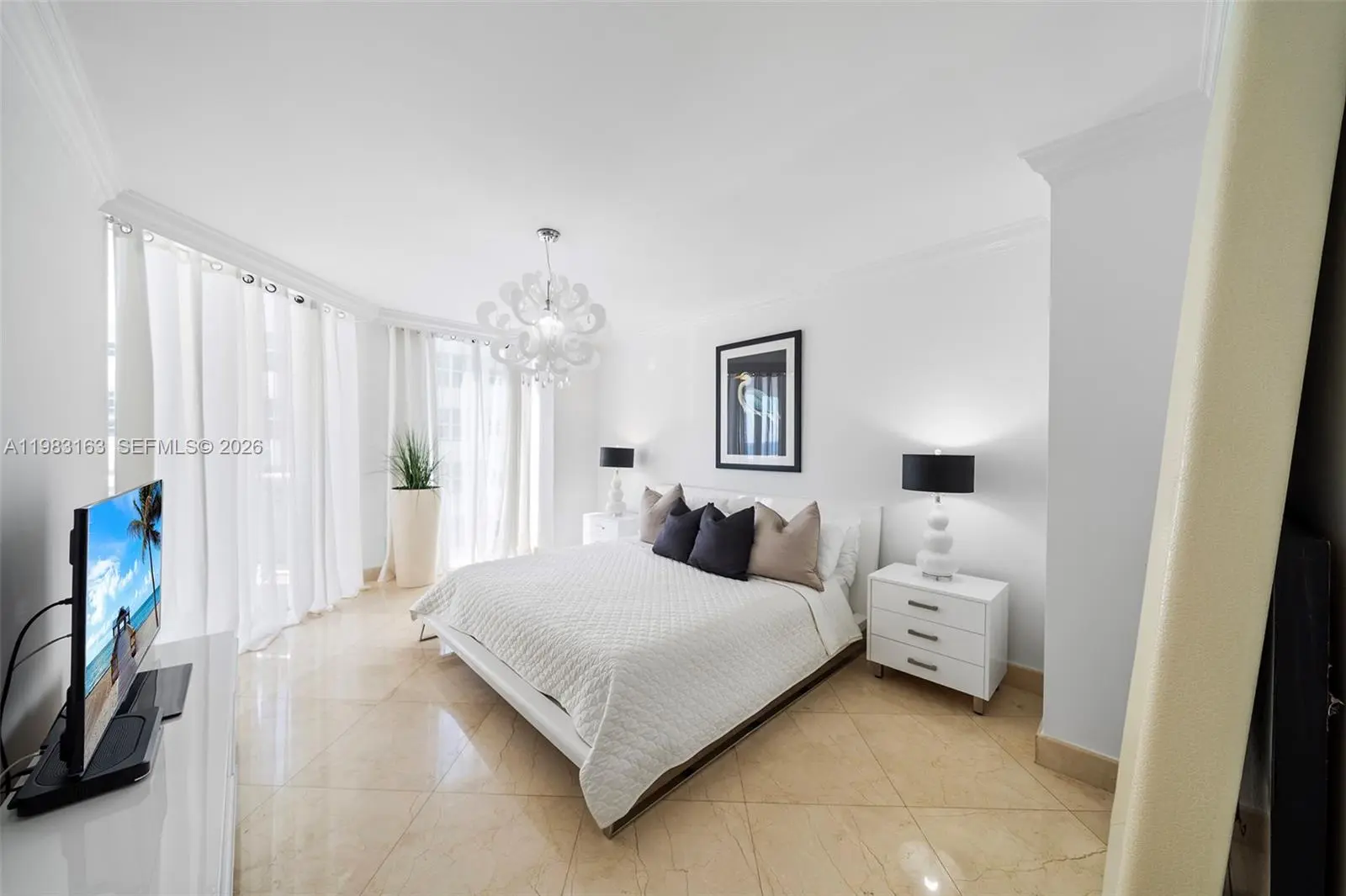 Beautiful 2-bed, 2-bath residence with modern finishes and marble floors, offering ocean and bay views. The open kitchen flows into spacious living/dining areas. The primary suite features a custom walk-in closet and a separate tub/shower. Both bedrooms open to a large terrace with great ocean views. Beautifully furnished, this unit is in a building with top-tier amenities, including direct beach access, a resort-style pool, fitness center, and spa. Surrounded by dining, shopping, and entertainment, it perfectly blends comfort and convenience in a highly sought-after location.