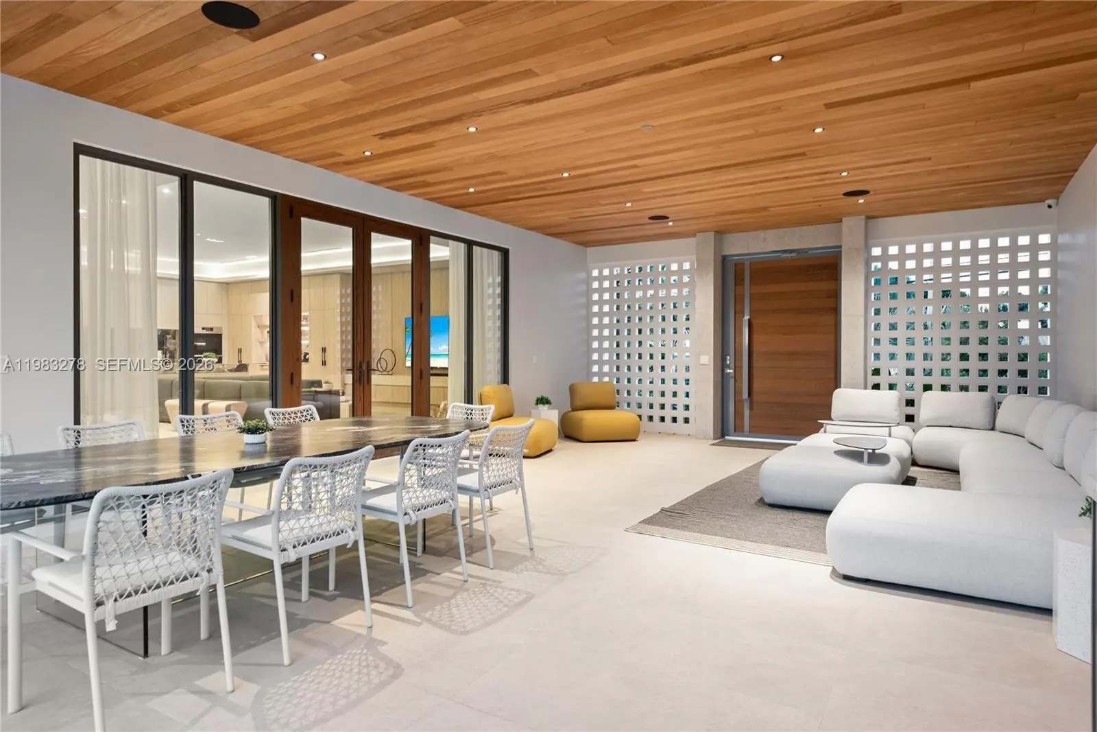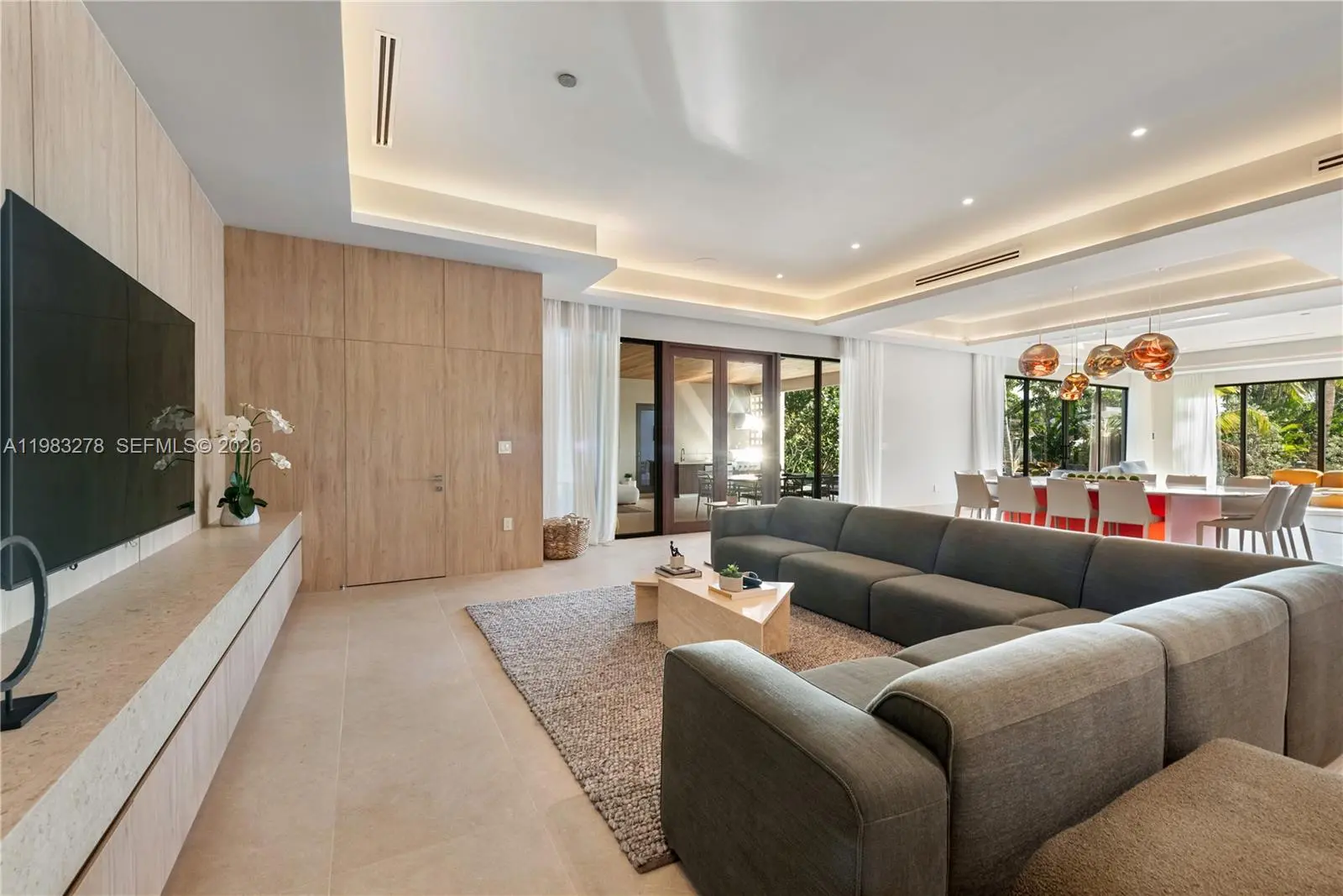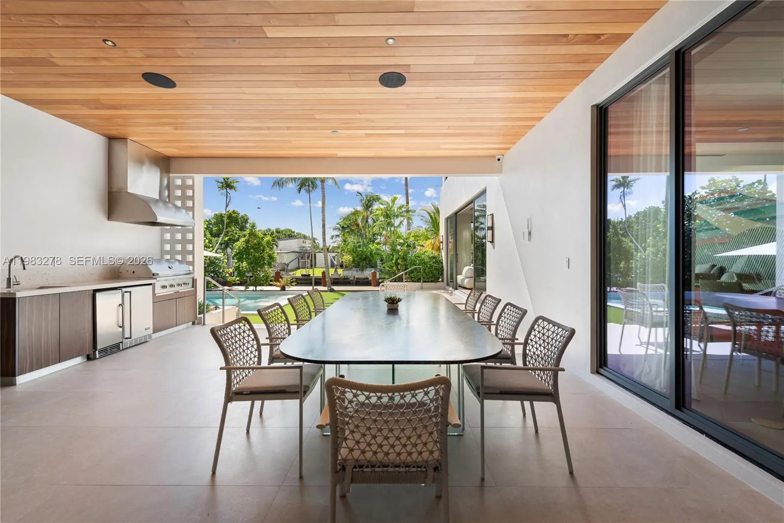 New construction, completed in 2023, offering the utmost in luxury and comfort. Boasting seven spacious bedroom suites and seven bathrooms, this home ensures ample space for family and guests. One of the seven bedrooms is located in a connected guest house, providing privacy and convenience. Inside, you'll find a beautifully designed living room, dining room, and family room, perfect for relaxing and entertaining. For outdoor dining and entertaining, there is an additional dining room. Each bedroom and the family room are equipped with televisions for your entertainment, and a laundry room. The outdoor amenities are truly exceptional, featuring a refreshing pool and relaxing hot tub, an outdoor kitchen for culinary delights, and a massive covered terrace with yet another outdoor kitchen.