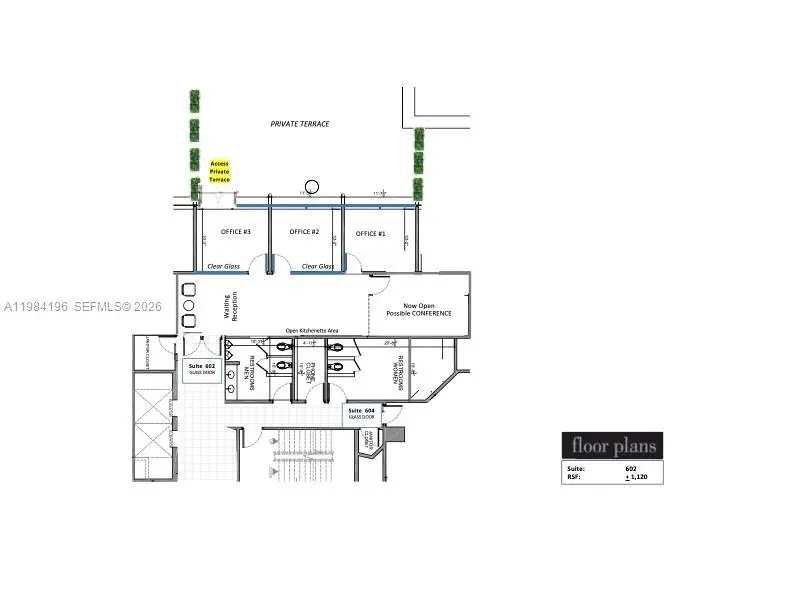 Suite 602 offers 1,120 RSF of thoughtfully designed office space, complemented by an expansive private terrace. The suite features a stunning double glass main entrance, three executive window offices enclosed with elegant glass partitions and glass doors, and a generous open area ideal for a conference room, reception/waiting area, and additional workstations. Elegant porcelain flooring and roller shades complete the sophisticated aesthetic throughout. Flooded with natural light, this premier suite is a rare find. Contact the listing agent for more details. Easy to show!