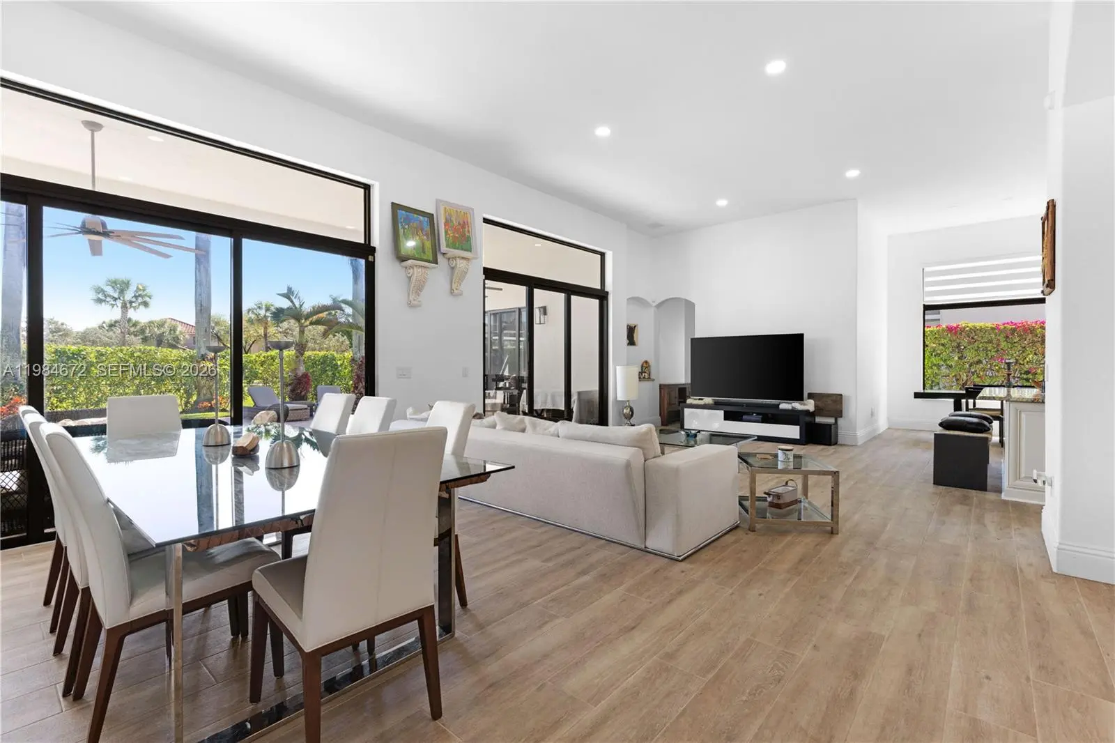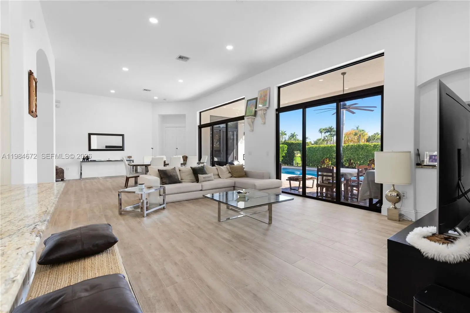 Where elegance meets effortless South Florida living. Stunning 4-bedroom, 3-bath residence in desirable Pembroke Shores, backing onto the golf course with lush landscaping providing exceptional privacy. Bathed in natural light, this open-concept home features wood-look tile in social areas and warm wood floors in bedrooms. The Italian-style kitchen showcases white cabinetry, granite countertops, stainless steel appliances, wine cooler, and double ovens. Impact windows and expansive sliding doors open to a private tropical backyard with pool, perfect for entertaining or relaxing under the palms. Custom California closets throughout. New roof (2023). Garage equipped with electric vehicle charging outlet. A refined and inviting retreat.