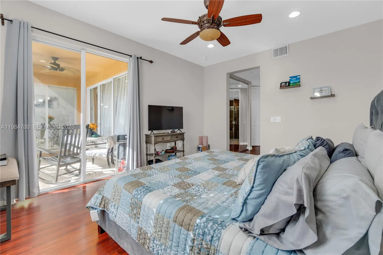 Spacious and well-maintained 3-bedroom, 2-bath home featuring a desirable split-bedroom layout and bright open living areas designed for comfort and functionality. The updated kitchen offers granite countertops, stainless steel appliances, and a convenient breakfast bar that opens to the main living and dining spaces. Tile flooring runs throughout the living areas, while the bedrooms feature rich wood floors and custom closet systems. The primary suite includes dual vanities and a walk-in shower. Enjoy indoor-outdoor living with a screened-in patio overlooking a peaceful lake, ideal for relaxing or entertaining. Additional highlights include a separate laundry room with full-size washer and dryer. The garage has been converted into a versatile flex space, perfect for storage, a home gym, or additional usable area. Community amenities include a resort-style pool and playground.