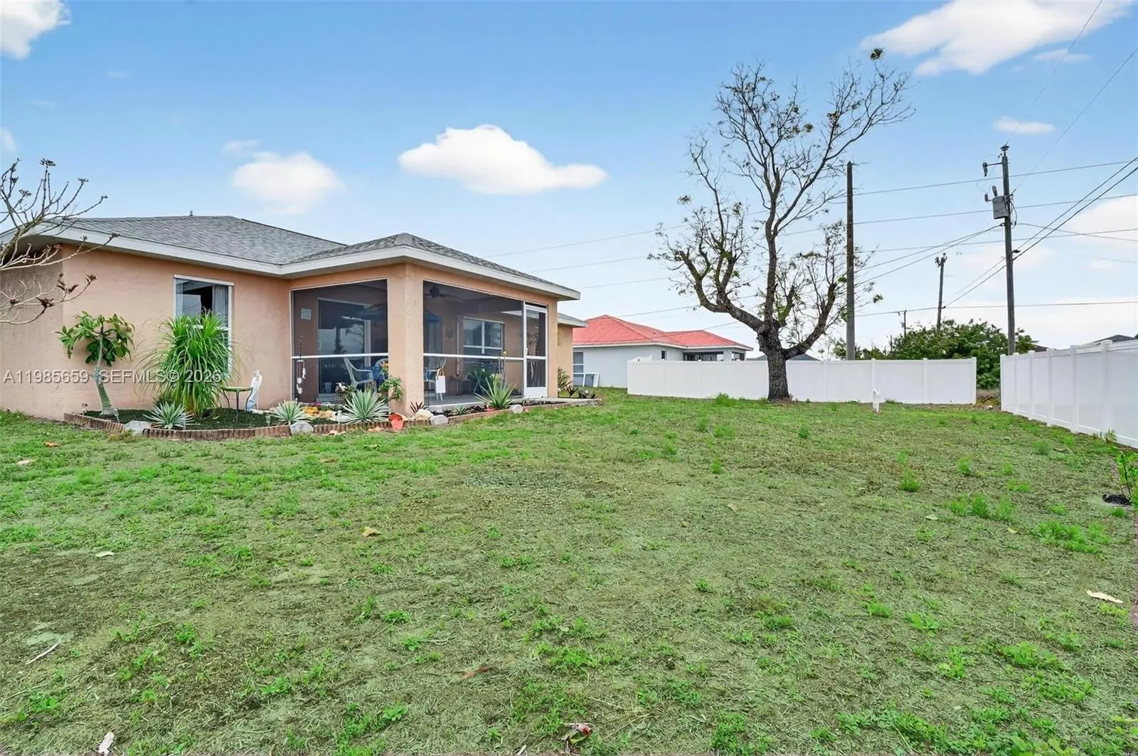 Welcome to this spacious 3-bedroom, 2-bath home with a versatile DEN in a great Cape Coral location. Thoughtfully designed with an open-concept layout, vaulted ceilings, and split-bedroom floorplan, this home offers both privacy and functionality—guest bedroom features direct access to full bathroom. This property is NOT in a special flood zone, NO HOA and offers plenty of room for a pool. A dedicated dining area flows seamlessly into the living room, making entertaining effortless. The triple glass door sliders open wide to a covered, screened patio with a ceiling fan. Recent updates include:•New roof (2023) • New A/C (2023) • New water softener (2023) • Well pump (2022) • New durable waterproof wood look flooring (2024) in all bedrooms and the den • New patio screen and ceiling. The kitchen features stainless steel appliances, including a newer refrigerator (2023), dishwasher, microwave, and stove/oven (2021), plus a reverse osmosis system under the sink (2023). Tile flooring runs through the main living areas for easy upkeep. The home has been well maintained with many major updates already completed. Enjoy a spacious backyard with room for a future pool. Prime Cape Coral location near major roads, top shopping, and dining. Minutes from beaches, boat ramps, and outdoor recreation. Convenient to schools, parks, and medical facilities. Live close to everything—restaurants, retail, parks, and waterfront activities—while still enjoying the comfort of a residential neighborhood