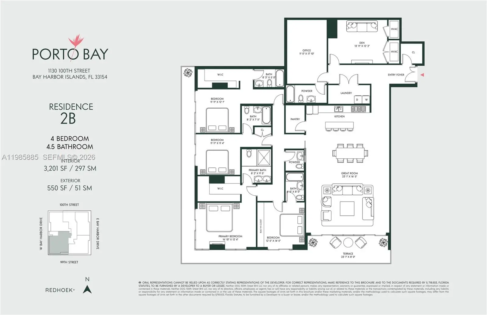 Welcome to Residence 2B at Porto Bay, a thoughtfully designed 4-bedroom, 4.5-bath home offering 3,201 interior square feet and an additional 550 square feet of private outdoor space in the exclusive Bay Harbor Islands. This expansive residence is defined by its seamless layout and generous proportions, with a wide great room that opens to a private terrace, creating an effortless flow for both everyday living and entertaining. The open kitchen is complemented by a dedicated pantry and adjacent laundry room, offering both functionality and discretion. The primary suite is privately positioned and features a spacious bedroom, walk-in closet, and a well-appointed bath. Three additional bedrooms are thoughtfully laid out, each with close access to full baths, providing comfort and flexibility for guests, family, or workspace needs. A separate den and dedicated office further enhance the home’s versatility. Additional highlights include a formal entry foyer, powder room, and ample storage throughout. Experience serene island living in a boutique 18-residence building featuring a gym, sauna, cold plunge, elegant lobby, and rooftop pool with panoramic views.
