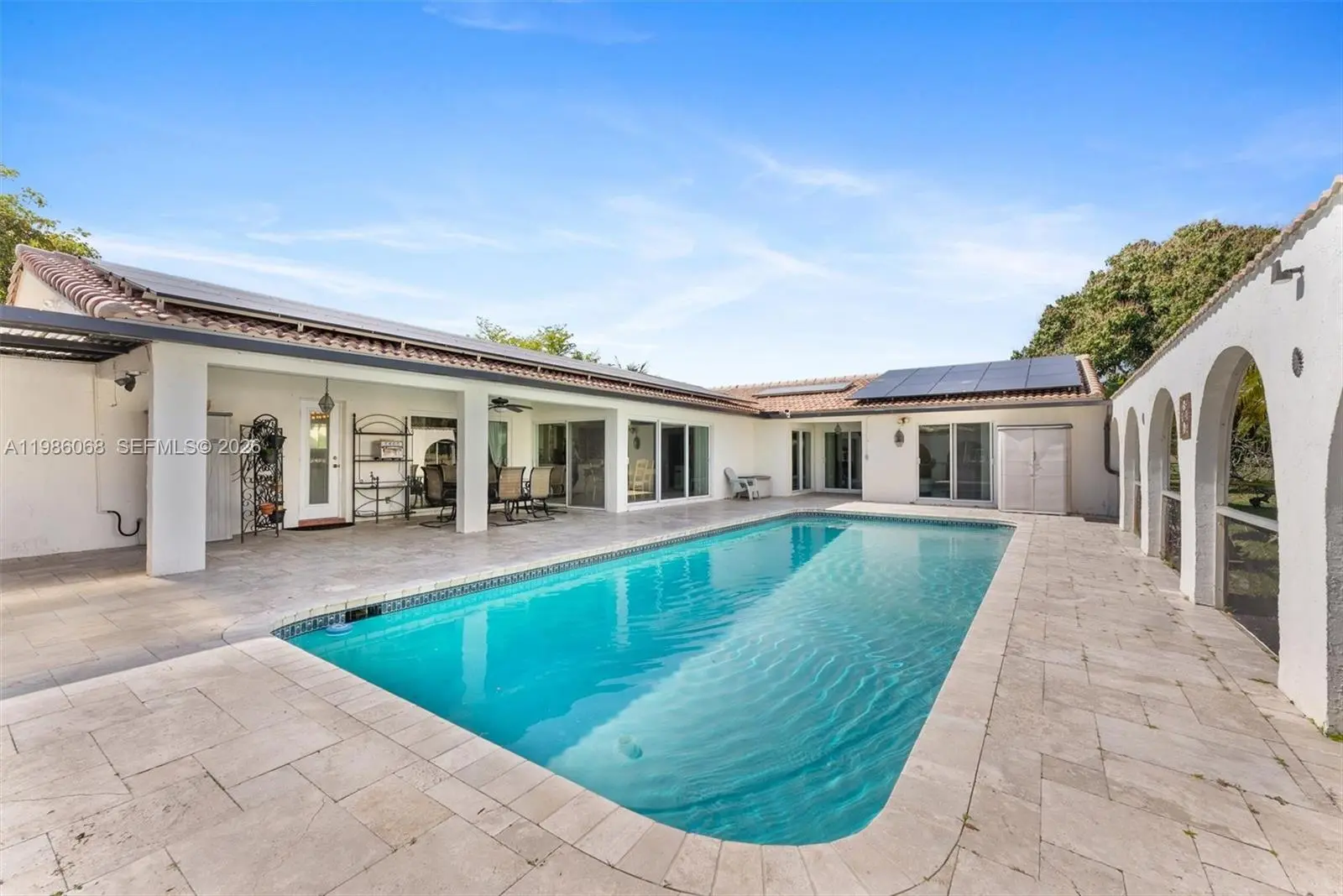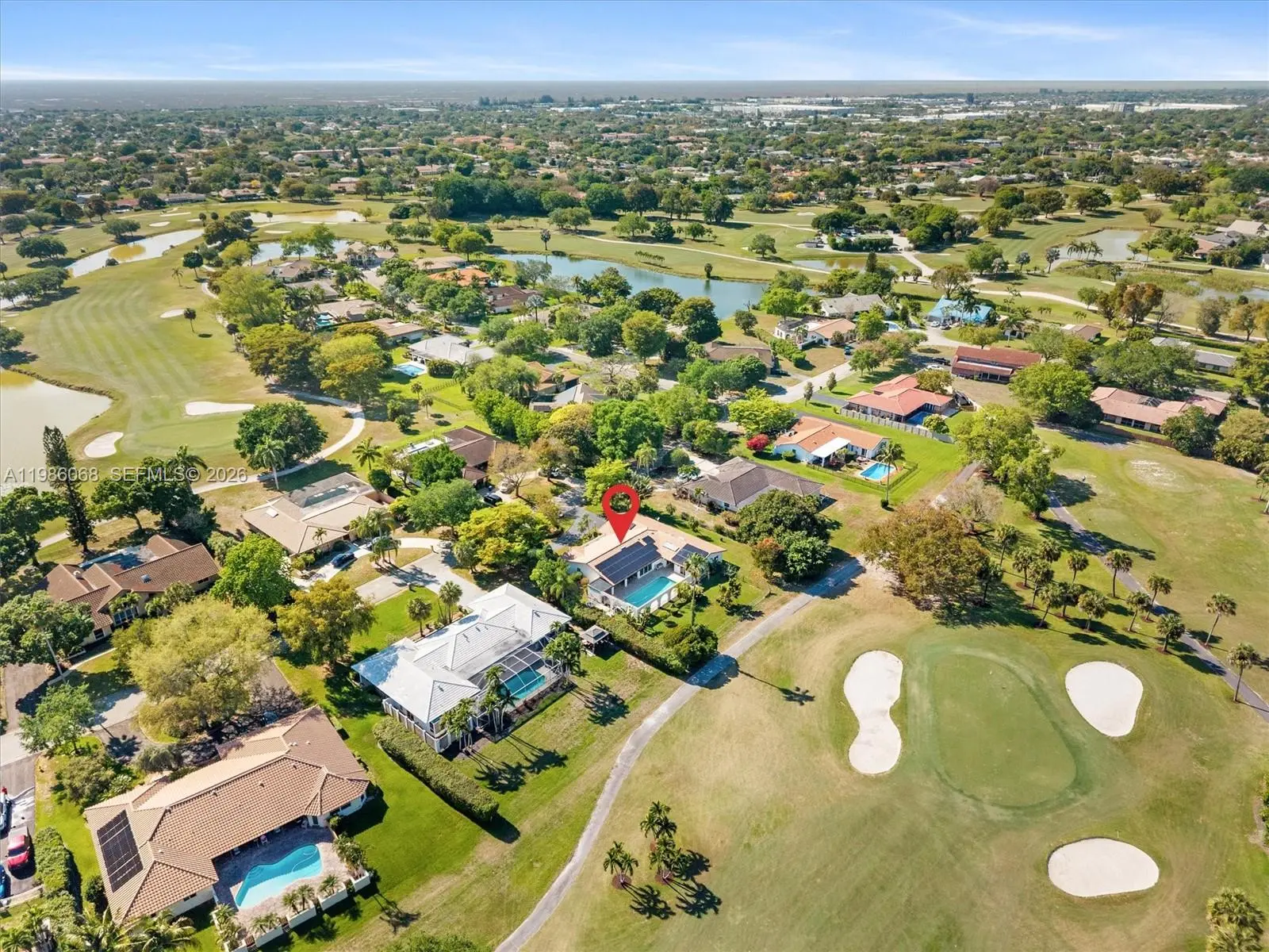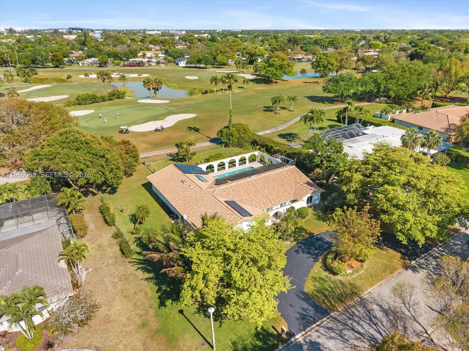 An energy-independent retreat on a quiet dead-end street in the Country Club of Coral Springs, offering private resort-style living with no HOA or mandatory membership. A fully paid 16.77 kWp solar system covers all electricity needs, eliminating power bills, while solar water heating and a private irrigation well further reduce costs. Includes a 220V EV outlet and separate A/C for the primary suite. Inside, enjoy granite countertops, a center island, Jenn Air grill, and walk-in pantry. Finishes include oversized tile, engineered hardwood, and marble bathrooms. Solar tubes provide natural light, and a central vacuum adds convenience. The highlight is the expansive 35.9' x 14.8' pool with an energy-efficient pump, perfect for relaxing or entertaining while taking in stunning sunset views over the private golf course. The property also features a fruit orchard with avocado, mango, and banana trees, plus an included electric golf cart. Additional amenities include clubhouse access, fitness center, pro shop, pickleball courts, and a bar/grill, along with homeowner only walking privileges on the course during off peak times. A New Tile Roof and full Impact Windows and Doors for your peace of mind. Close to top-tier schools like Parkside Elementary and Coral Glades High, as well as premier shopping nearby.