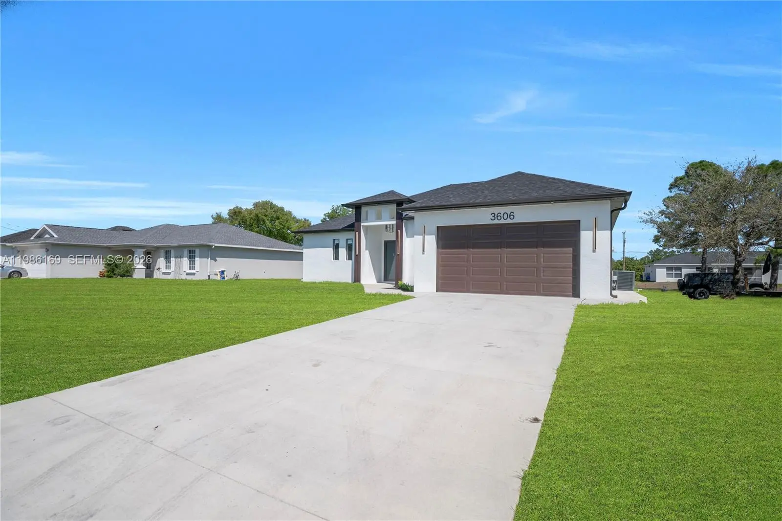 Amazing opportunity to own this new construction in a prime Lehigh Acres location! This meticulously designed 3-bedroom, 2-bathroom home plus DEN features high ceilings, porcelain tile throughout, modern lighting fixtures, and a gourmet kitchen with a waterfall island and high-end appliances. Additional highlights include impact windows and doors, a 2-car garage, and an expansive lanai perfect for entertaining. This property won’t last. Schedule your showing today!