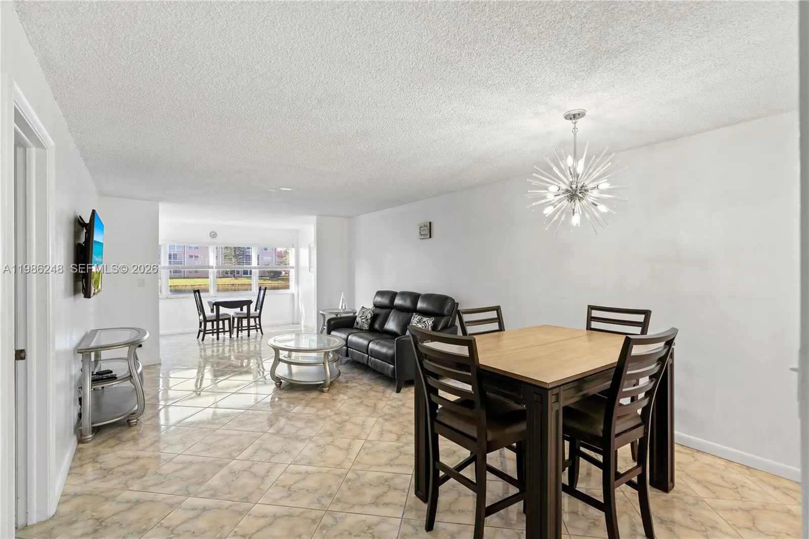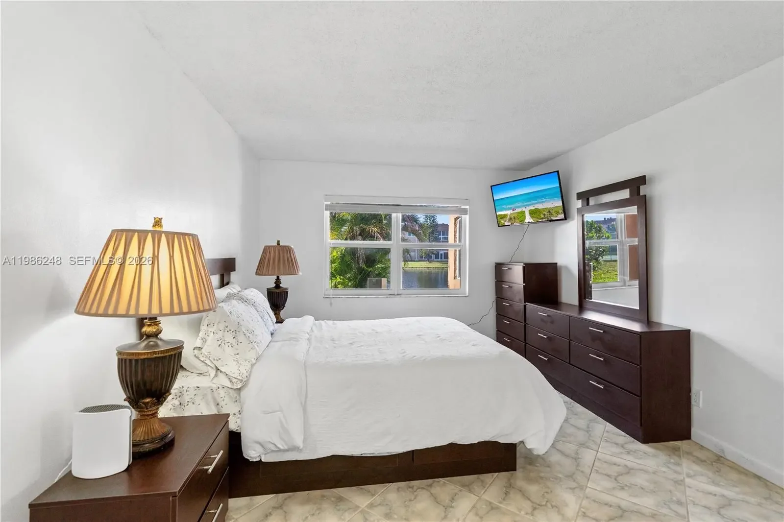Beautiful spacious updated first-floor unit featuring eat-in kitchen with stainless steel appliances, granite countertops, high shine tile flooring throughout, and plenty of natural light. Enjoy the Florida Room with extra windows and a picturesque serene lake and fountain views. Features include hurricane impact windows, new AC, and 3 closets in the primary bedroom. Located in an active 55+ community with resort-style amenities including heated pools, golf, tennis, pickleball, fitness centers, clubhouse, and more. Close commute to airport and major routes of transportation