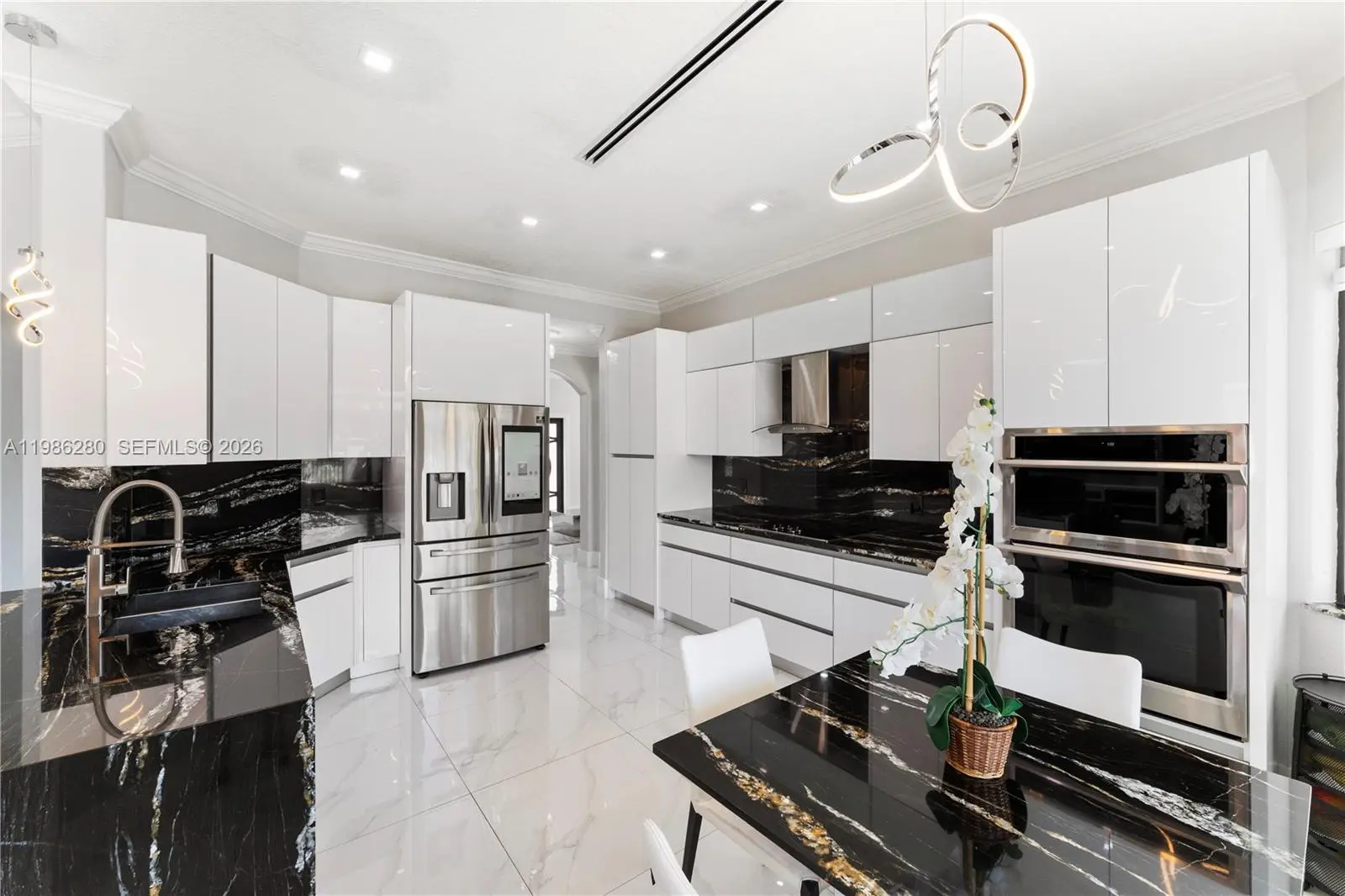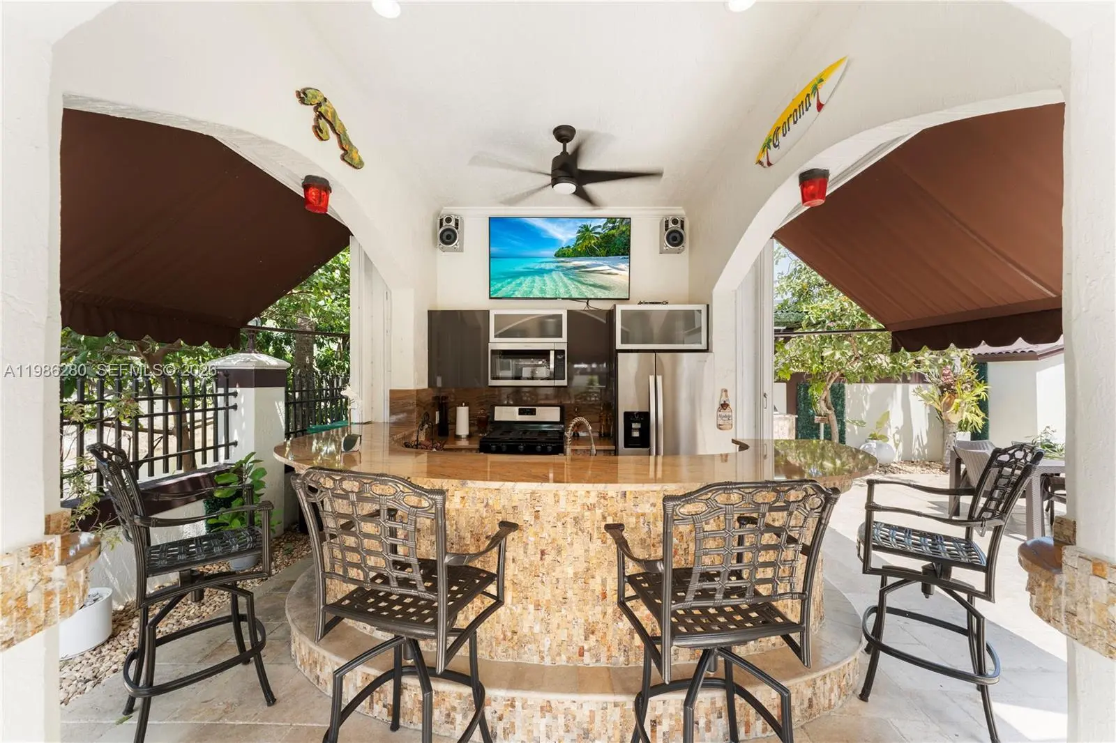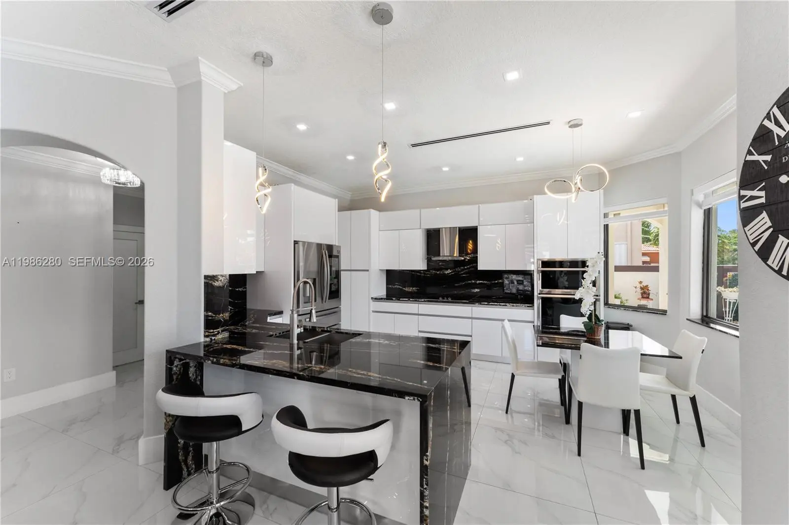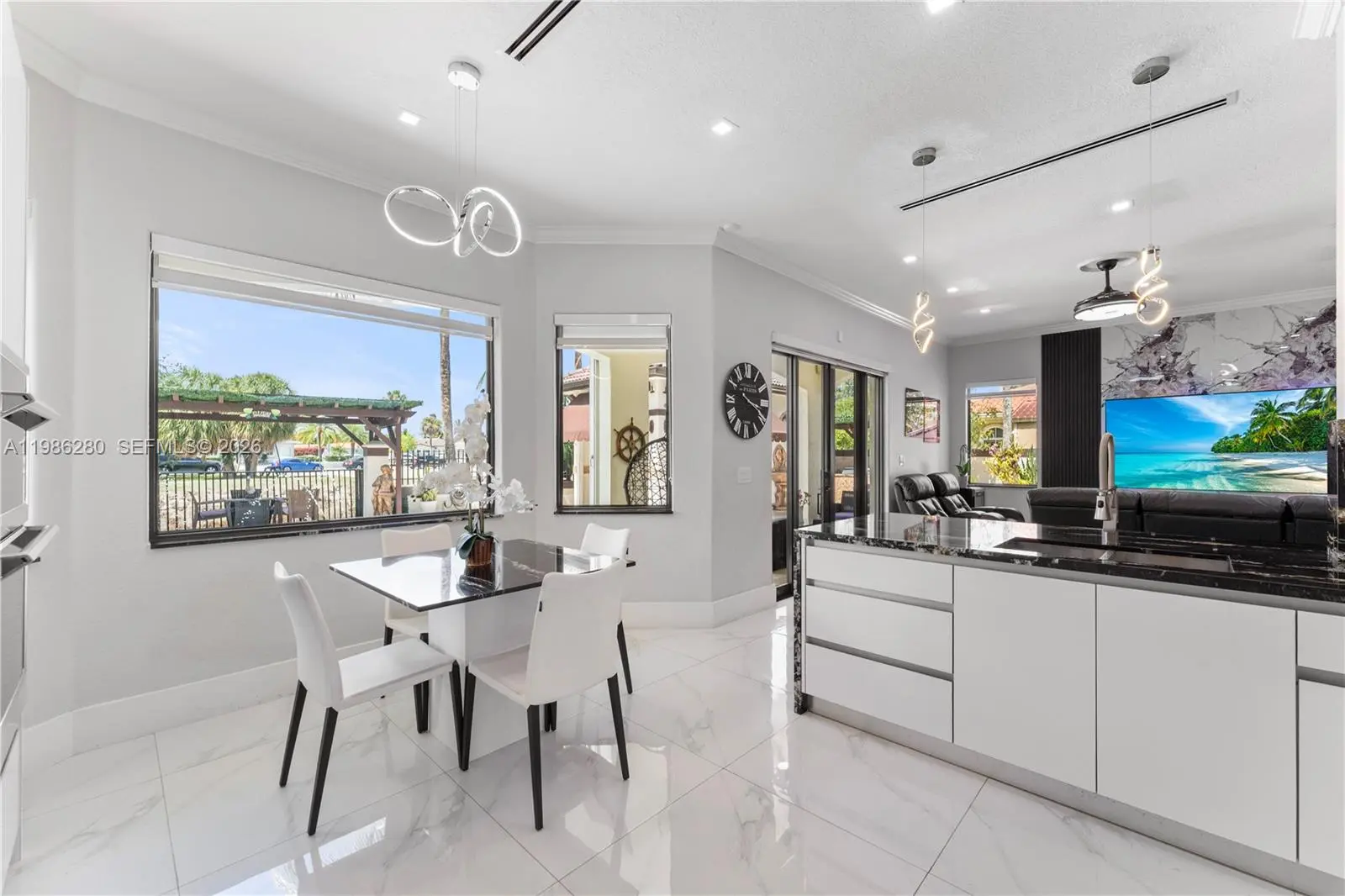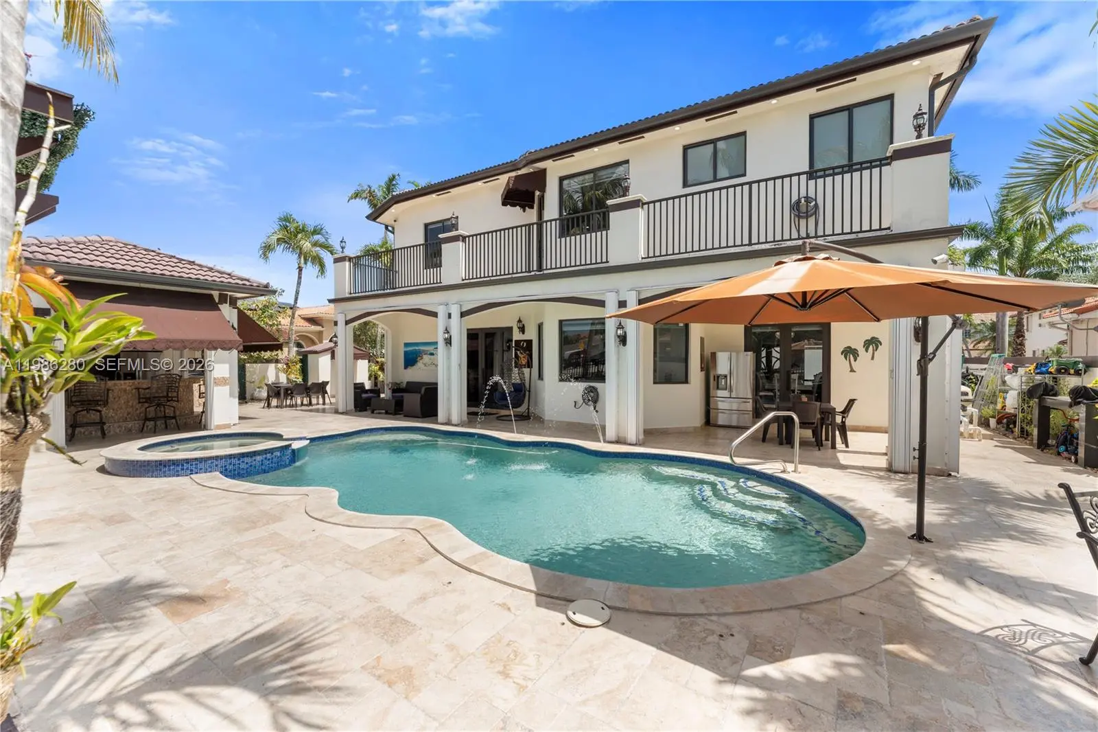 Welcome to 7777 NW 169th Terrace, a true gem located in the highly sought-after gated community of Royal Oaks in Miami Lakes. This impressive two-story single-family residence is one of the first fully fenced homes in the neighborhood, boasting a grandfathered electric triple driveway gates - a rare and valuable safety feature. Meticulously remodeled from floor to ceiling and front to back, this 5-bedroom, 3 1/2 bathroom home is move in ready and designed to impress. Enjoy serene canal views, a lushly landscaped front yard, and entertainer's dream backyard. Step outside to your private resort-style retreat featuring a saltwater heated swimming pool with spa, brand new pool pump, elegant pergolas and a fully loaded concrete gazebo complete with gas range, refrigerator, granite countertops, and custom cabinetry. Entertain effortlessly with a second outdoor grill station, pig roaster, outdoor sinks, surround sound system, two storage sheds and a fully remodeled pool bathroom with walk in shower. The entire driveway, side yard and backyard are mud-set travertine for maximum convenience and aesthetics. Inside, discover refined modern living with 24x24 designer tiles, zebra blinds, impact glass panel staircase, and custom closet cabinetry in every bedroom. The kitchen is a chef's dream, outfitted with high-end imported Italian acrylic cabinetry and stone, a striking waterfall island, Smart Samsung refrigerator and premium Samsung appliances.