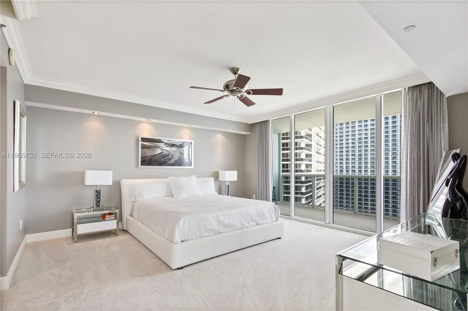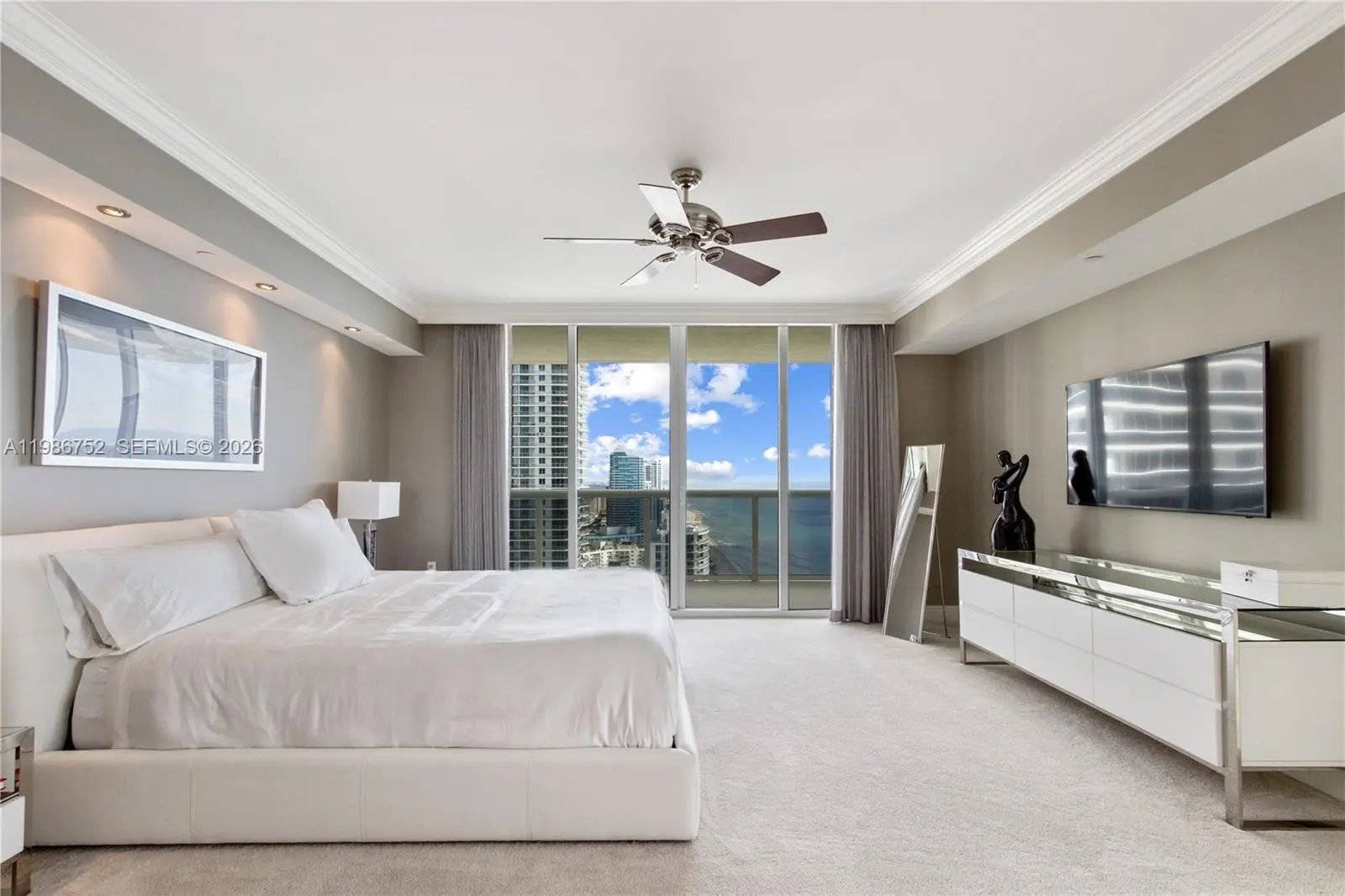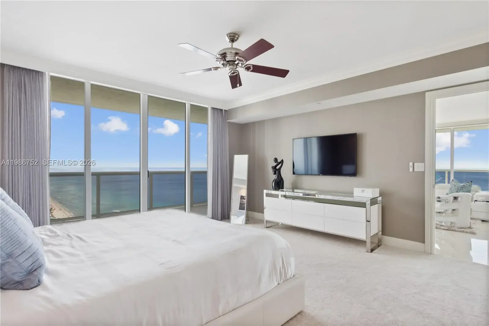Experience the allure of this fully remodeled and professionally designed northeast corner residence, showcasing breathtaking direct ocean views and a spacious wraparound balcony. This exceptional 3-bedroom, 3-bathroom unit features marble flooring throughout and a luxurious Jacuzzi tub in the primary suite. The residence is thoughtfully appointed with custom lighting, built-in closets, and refined furnishings, including king-size beds in the primary and second bedrooms, and a double bed in the third bedroom. The European-style kitchen is equipped with premium KitchenAid appliances, a wine cooler, and sleek quartz countertops, offering both style and functionality. Residents enjoy access to world-class, resort-style amenities, including a grand two-story lobby, full-time concierge and security, 24-hour valet service, multi-level covered parking, five heated pools, and a state-of-the-art spa and fitness center.