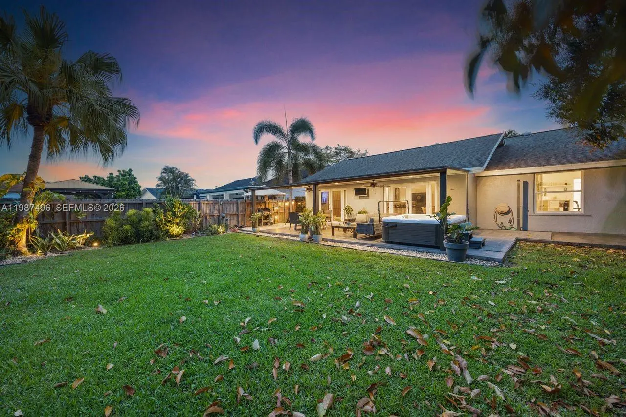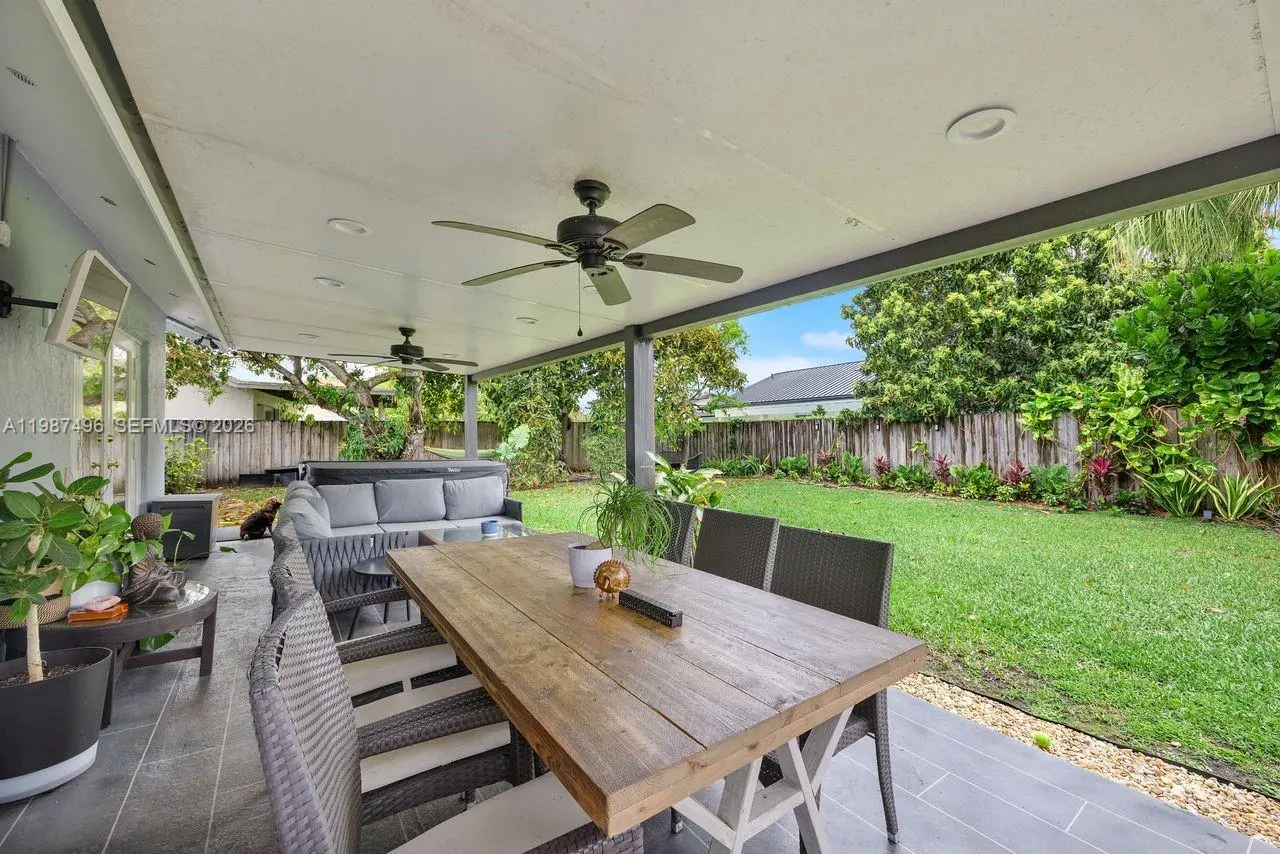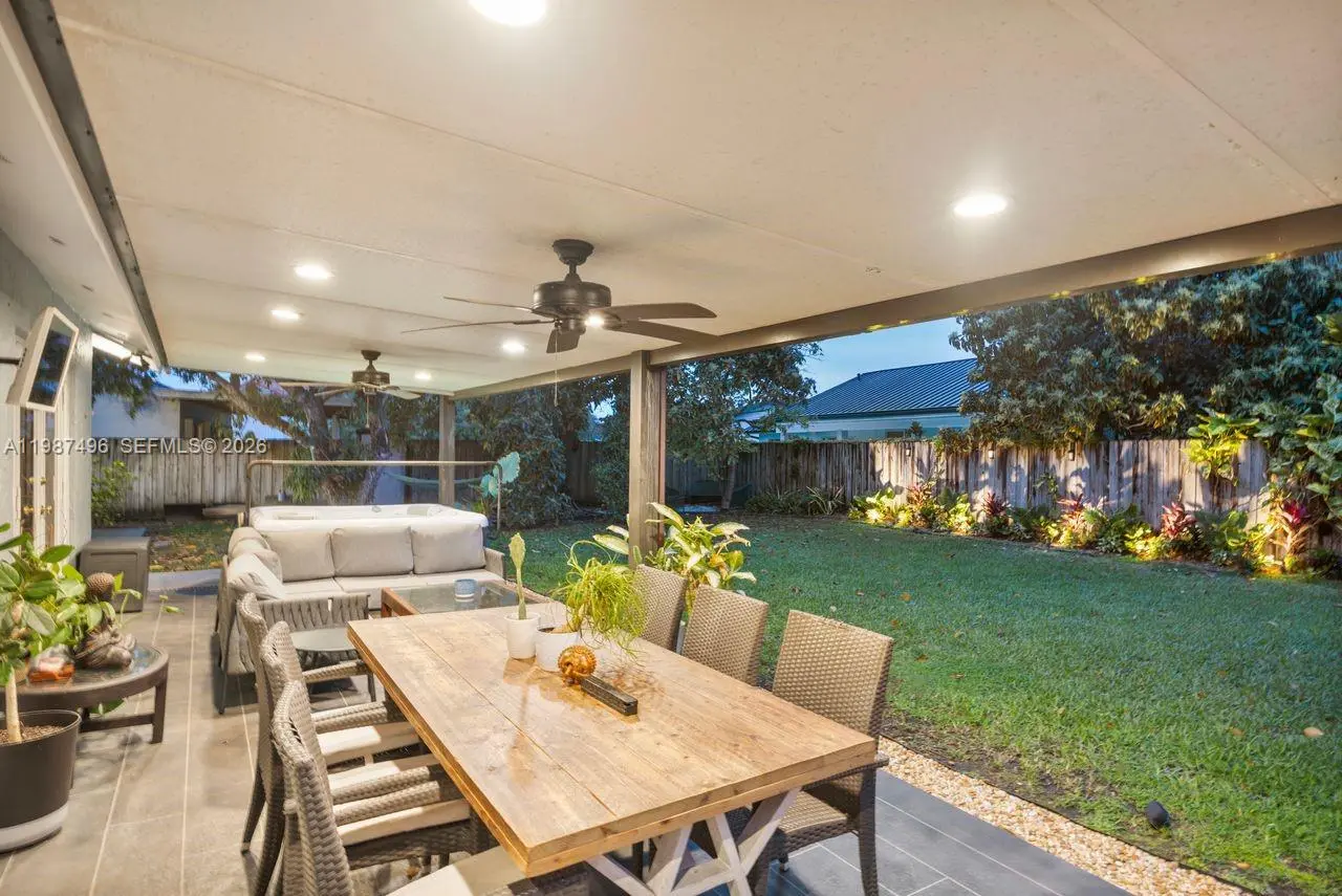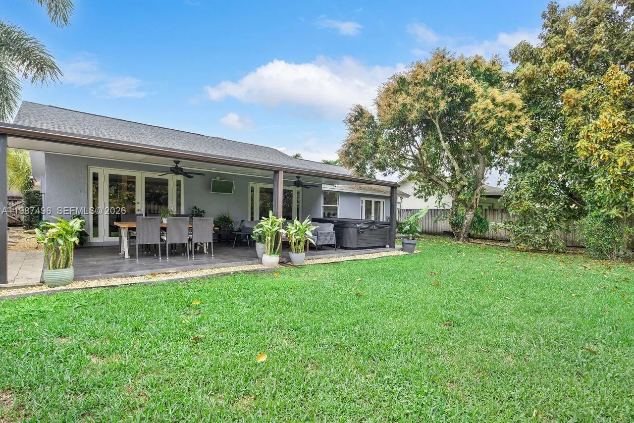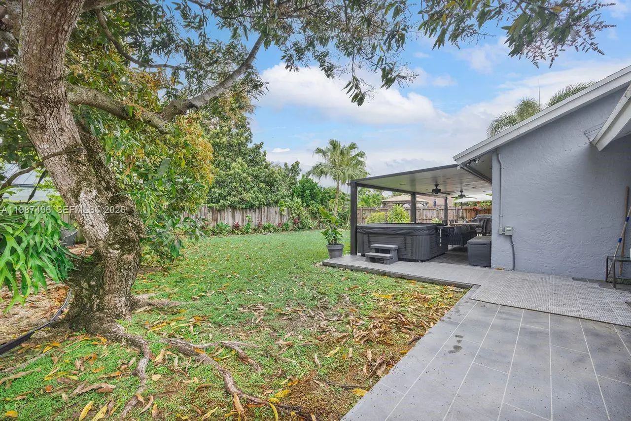 Very well maintained and move-in ready, this 3-bedroom, 2.5-bath home plus a versatile den/office offers comfort, flexibility, and a prime location with no HOA. The home features volume ceilings, laminate flooring throughout, and custom lighting, creating a bright and welcoming atmosphere. A new upscale German kitchen with Bosch appliances opens seamlessly to the main living areas, enhancing both functionality and design. The flexible den is ideal as a home office, gym, or playroom. Enjoy indoor-outdoor living with a covered patio equipped with ceiling fans, lighting, and TV setup—perfect for entertaining. The backyard is a private oasis featuring a jacuzzi, outdoor shower, and fruit trees including mango and avocado, with ample space to add a pool. Additional features include impact windows, security cameras, Ring alarm system, digital temperature control, and automated irrigation. Bathrooms have been tastefully updated, and the fenced yard with lush landscaping offers both privacy and charm. Conveniently located near top-rated schools, Costco, Publix, and major conveniences, this home delivers space, upgrades, and an unbeatable Kendall location.