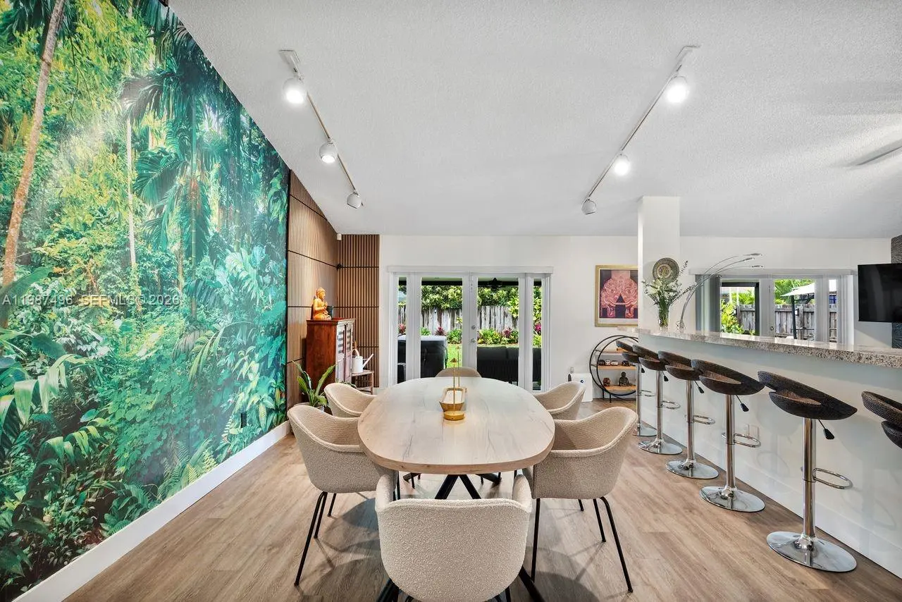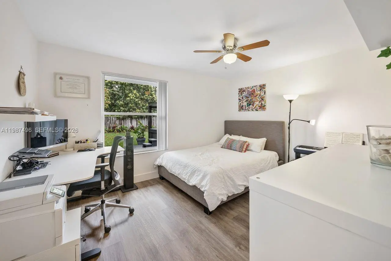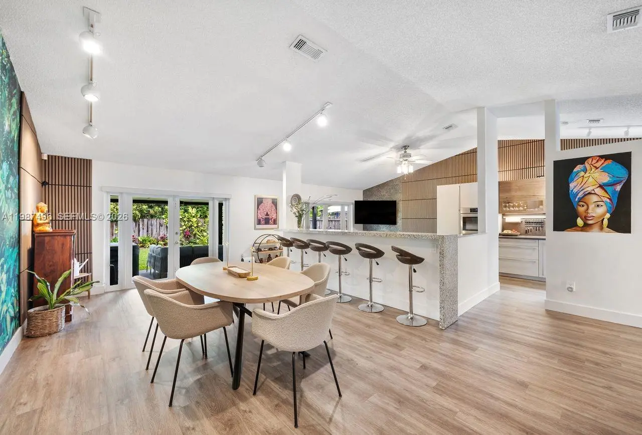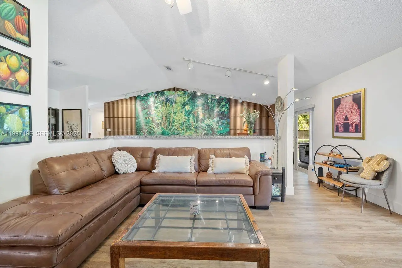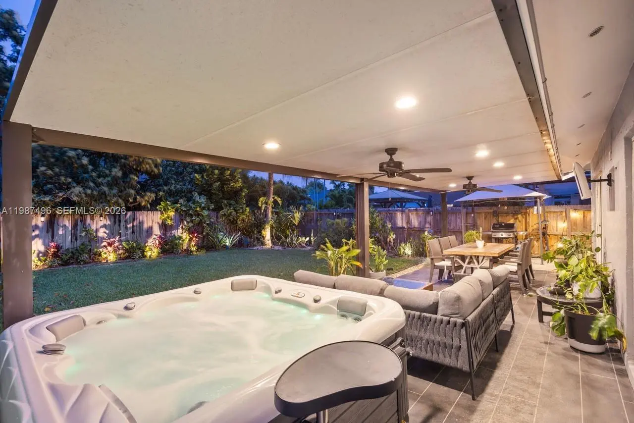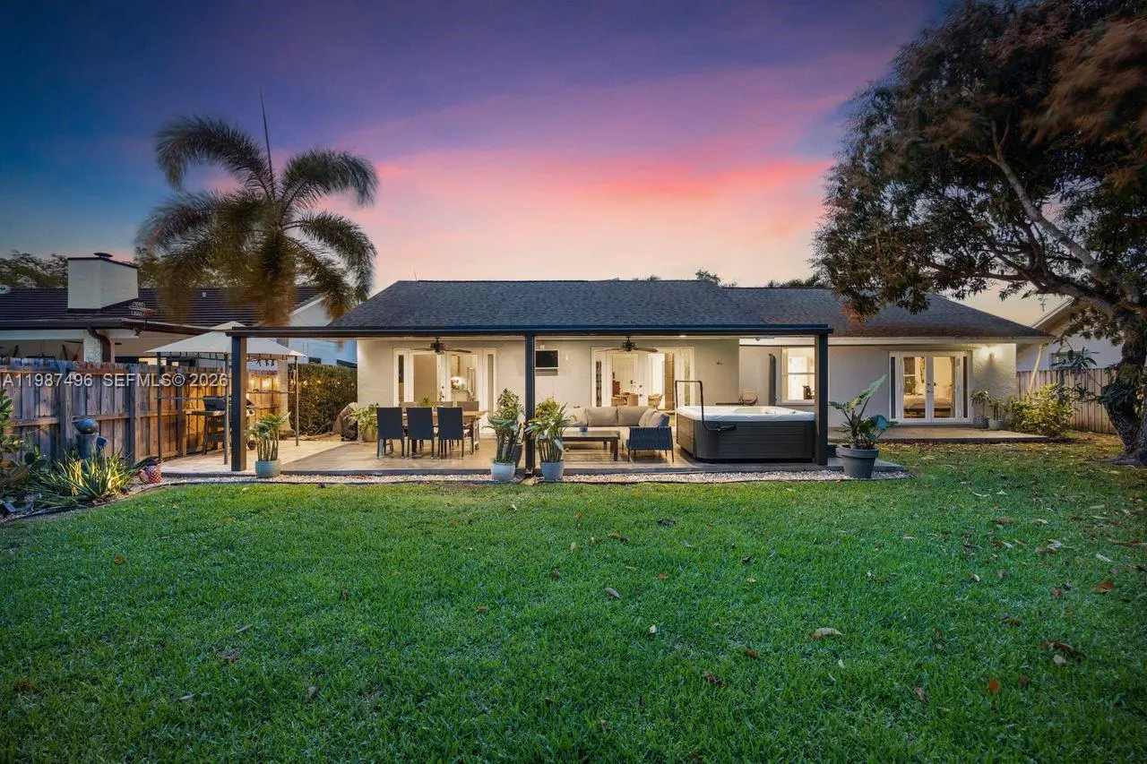 Very well maintained and move-in ready, this 3-bedroom, 2.5-bath home plus a versatile den/office offers comfort, flexibility, and a prime location with no HOA. The home features volume ceilings, laminate flooring throughout, and custom lighting, creating a bright and welcoming atmosphere. A new upscale German kitchen with Bosch appliances opens seamlessly to the main living areas, enhancing both functionality and design. The flexible den is ideal as a home office, gym, or playroom. Enjoy indoor-outdoor living with a covered patio equipped with ceiling fans, lighting, and TV setup—perfect for entertaining. The backyard is a private oasis featuring a jacuzzi, outdoor shower, and fruit trees including mango and avocado, with ample space to add a pool. Additional features include impact windows, security cameras, Ring alarm system, digital temperature control, and automated irrigation. Bathrooms have been tastefully updated, and the fenced yard with lush landscaping offers both privacy and charm. Conveniently located near top-rated schools, Costco, Publix, and major conveniences, this home delivers space, upgrades, and an unbeatable Kendall location.