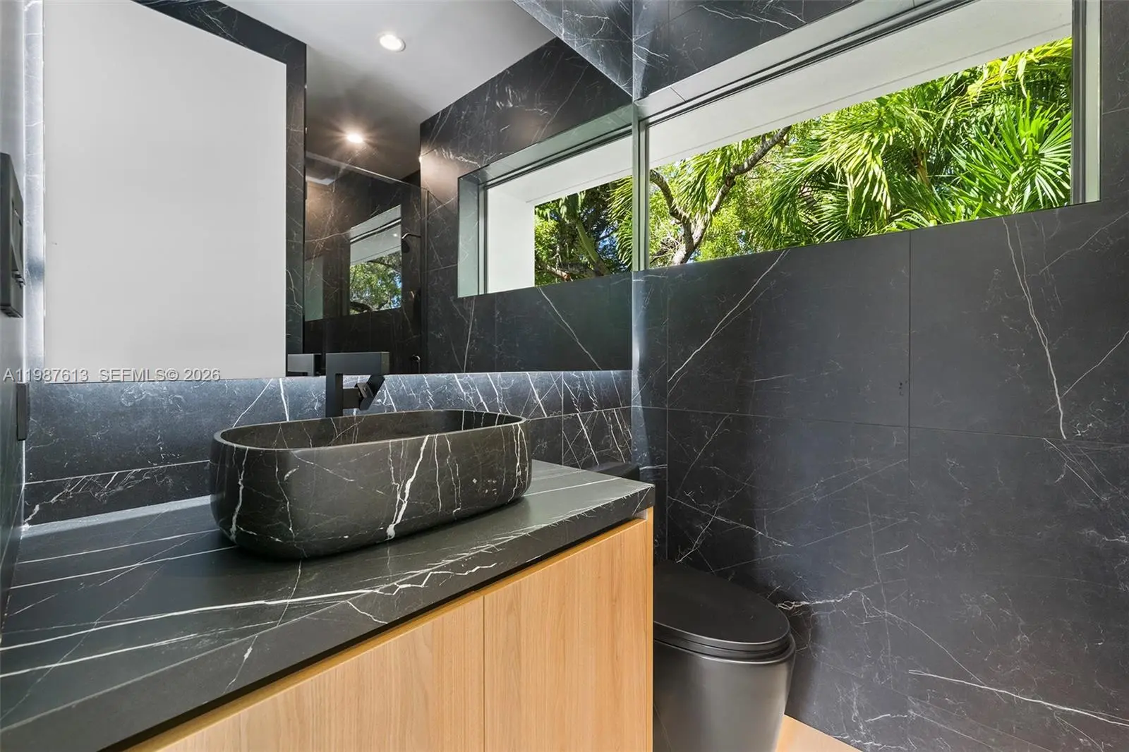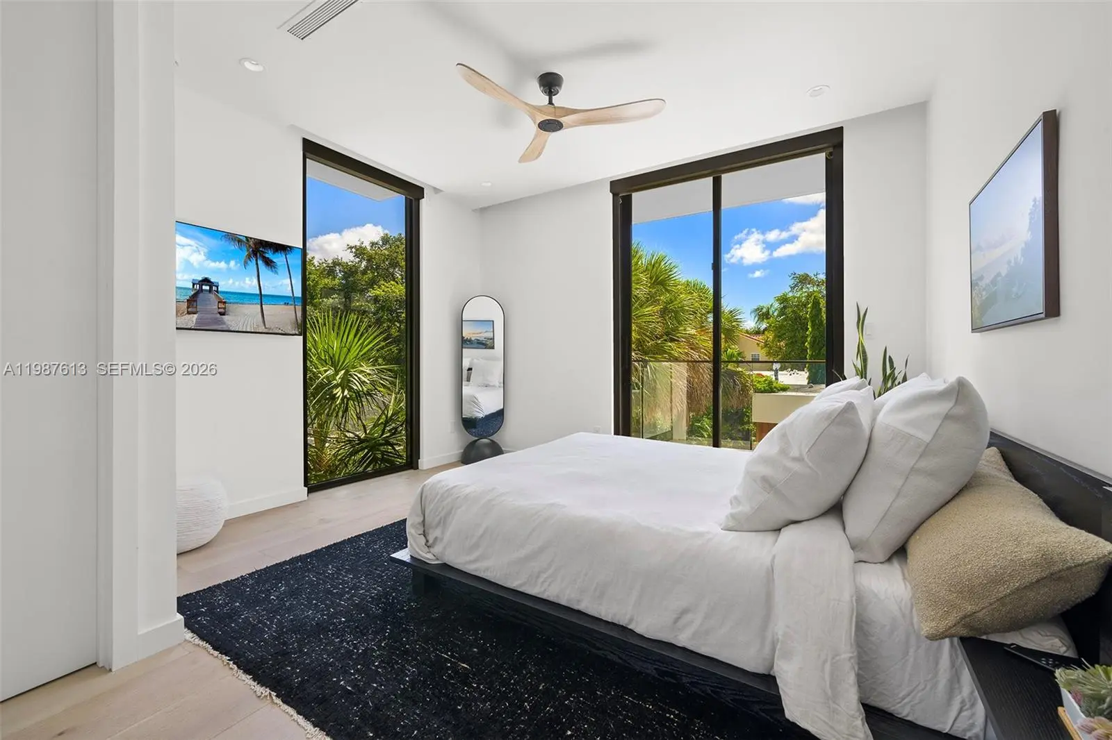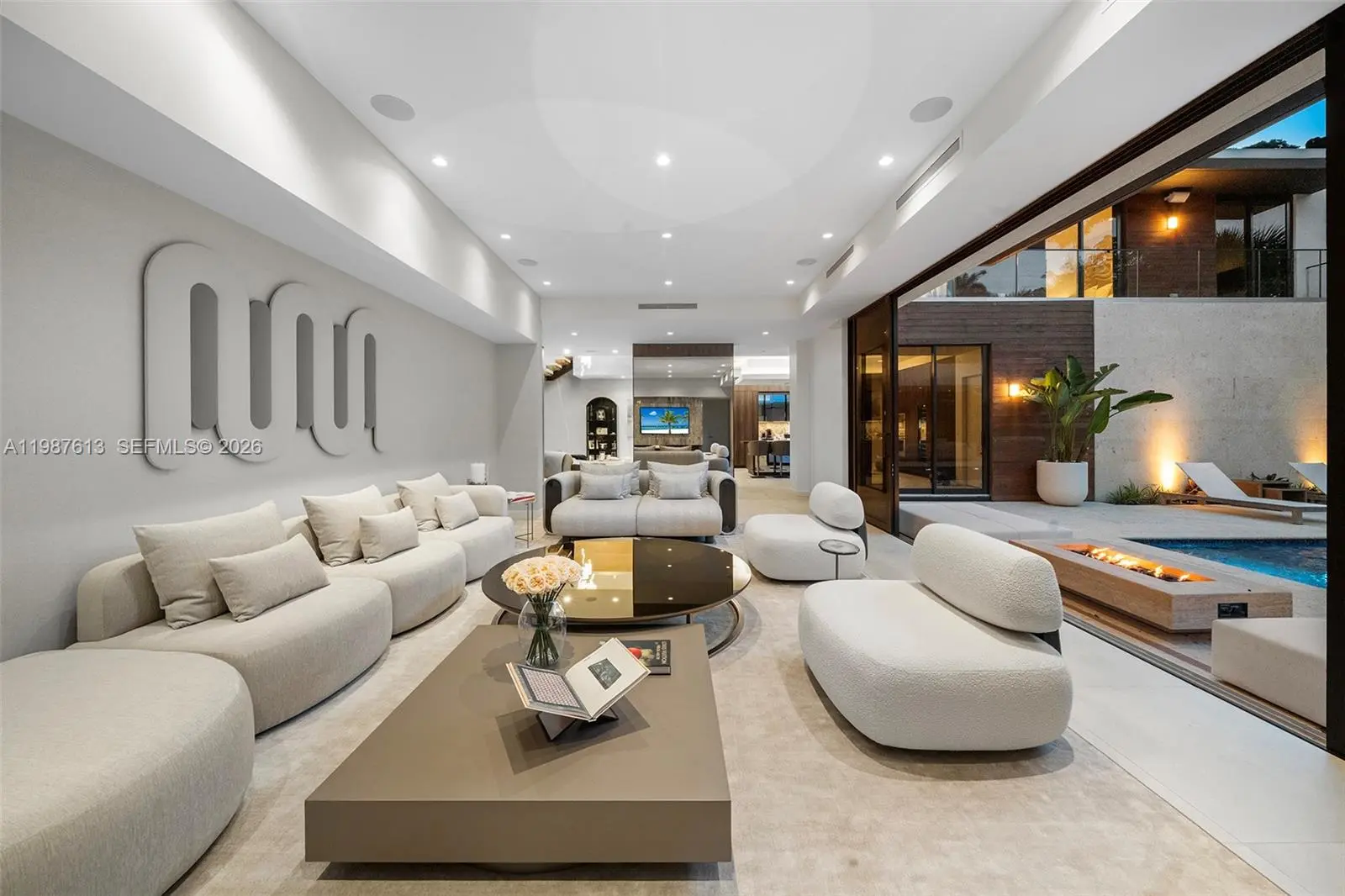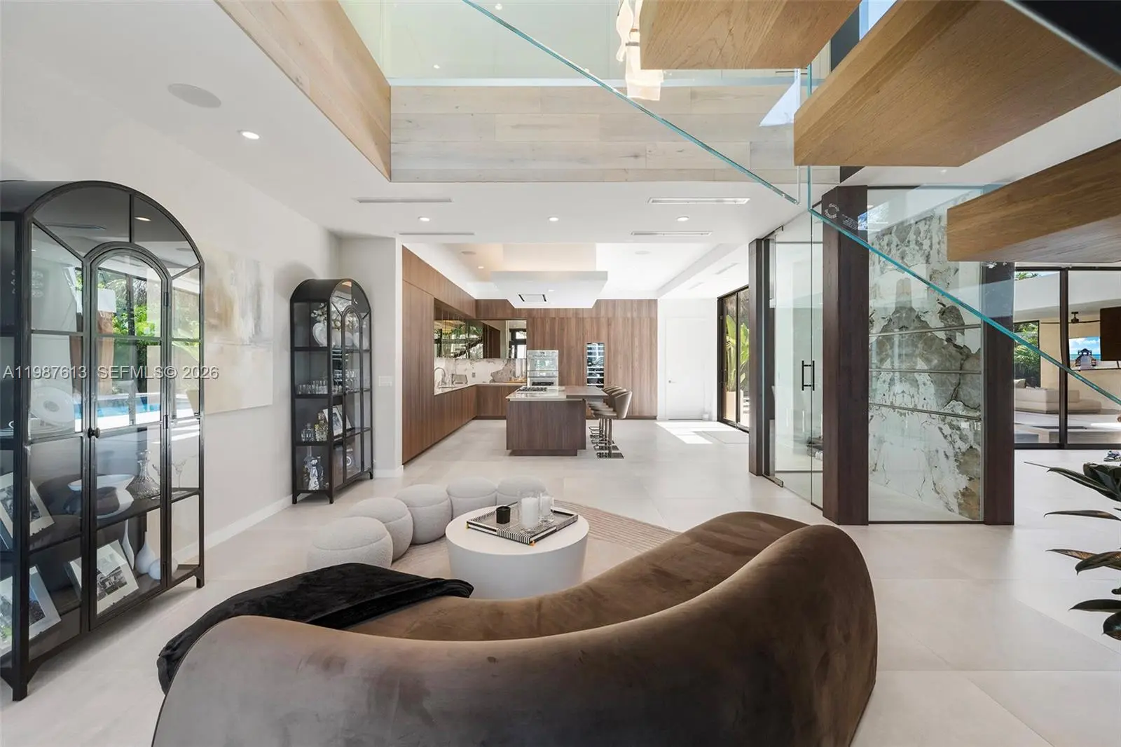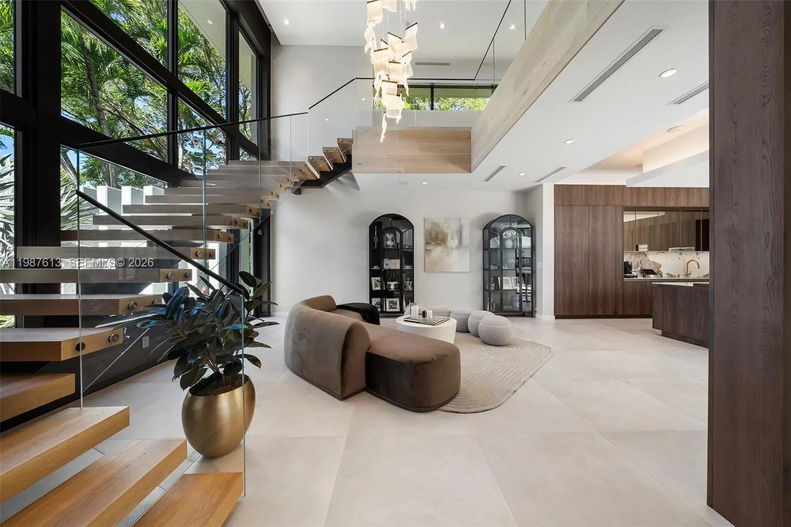 This luxurious 5-bedroom, 6-bath Florida Modern residence boasts over 5,500 square feet of elegantly designed indoor and outdoor living space, nestled among lush tropical landscaping for ultimate privacy and tranquility. Floor-to-ceiling windows bathe the interiors in natural light, highlighting an open-concept layout that effortlessly blends indoor sophistication with outdoor serenity—ideal for entertaining. A dramatic dining area with soaring 22-foot ceilings and a striking floating staircase sets the tone for the home’s impressive design. The impeccably curated Armazem kitchen—with a custom wine cellar—flows into a spacious great room that opens to a covered poolside terrace featuring a fully equipped outdoor kitchen with an icemaker.