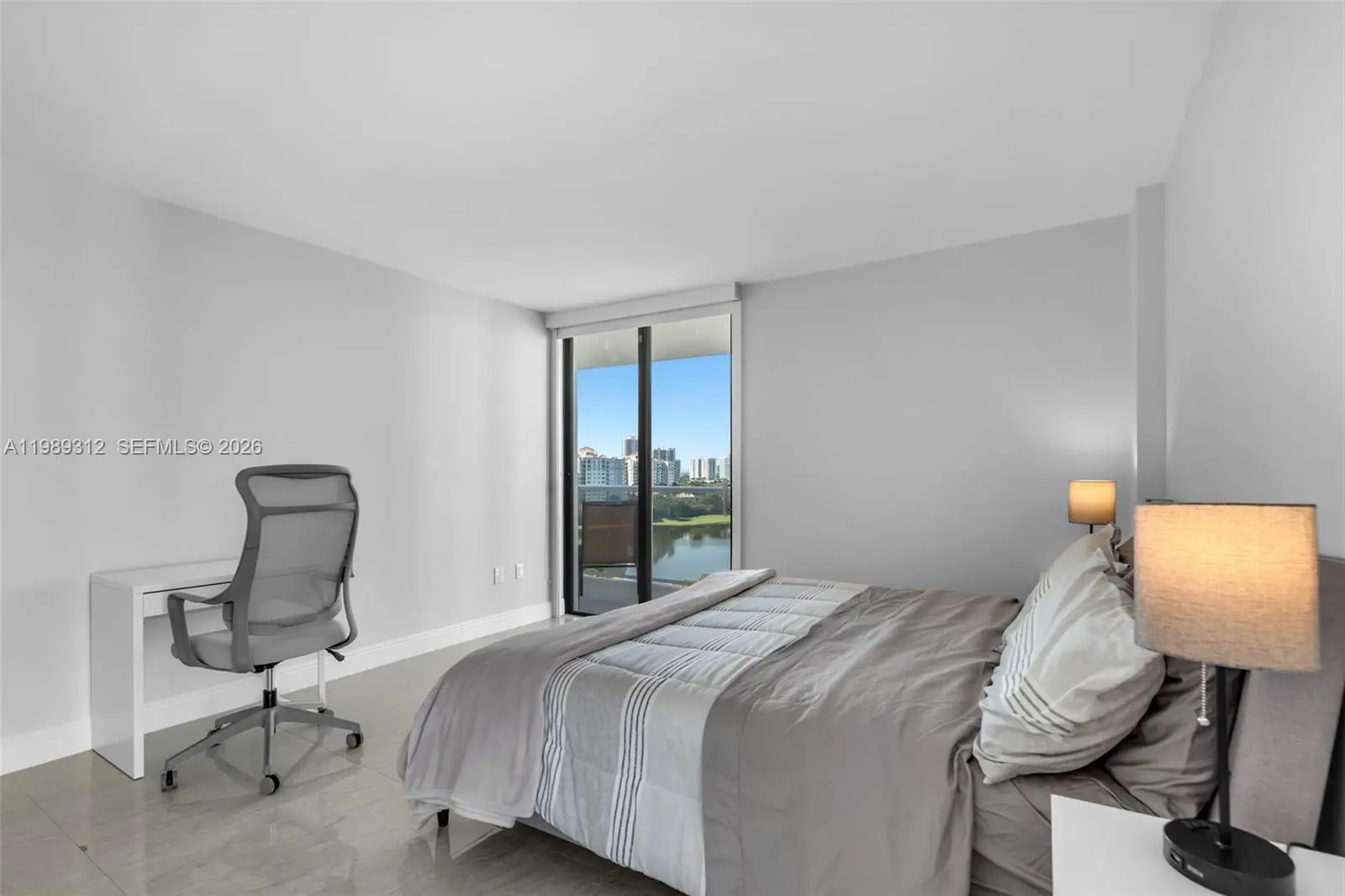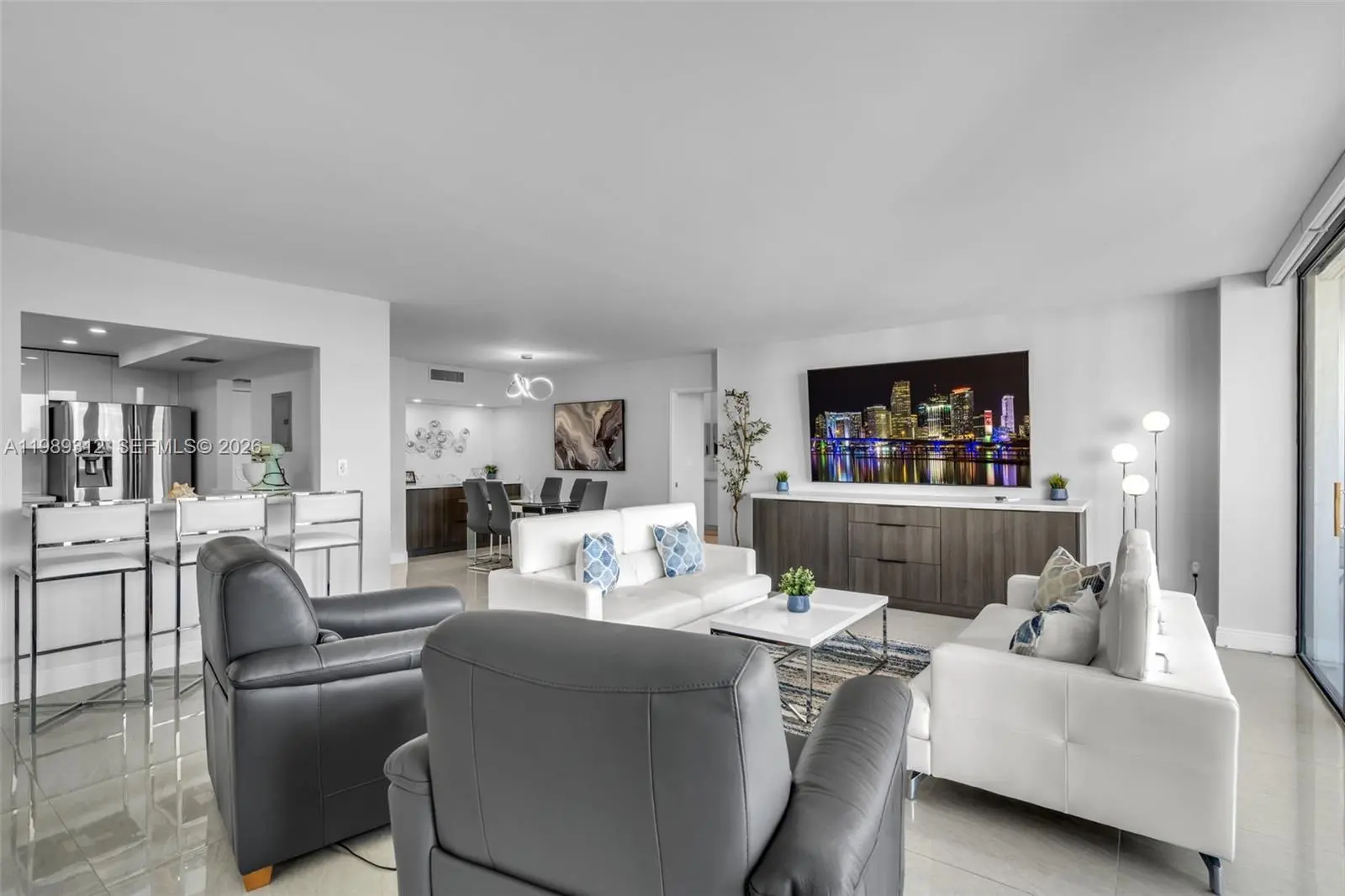 Stunning legal 3-bedroom, 3-bath residence offering 1,465 SF in the heart of Aventura. Converted as a 2 bedroom - 3 bath this spacious unit features a bright, open-concept layout with floor-to-ceiling windows showcasing water, Turnberry Isle Country Club Golf course, and skyline views of Aventura & Sunny Isles. The kitchen features modern white cabinetry, quartz countertops, & stainless steel appliances, seamlessly flowing into the living & dining areas—perfect for entertaining. Recent renovations includes full painting, new light fixture, automatic blinds in the living room, and manual black out in the bedrooms, new custom cabinets & quartz stone in the living room as well as a wet bar by the dining area. The expansive primary suite includes a walk-in closet and direct access to the balcony, while all bedrooms offer ample space and natural light. Enjoy living just minutes from Aventura Mall, Gulfstream Park, and the beaches of Sunny Isles Beach. Conveniently located near top-rated schools, dining, shopping, and major highways. Sold fully furnished with quality modern furniture and appliances - this is South Florida living at its finest waiting for you. Building has completed all of it renovations: common areas, pool, gym, facade, impact balconies, seawall, elevators, and lobby. Assessment will be paid in full at closing.