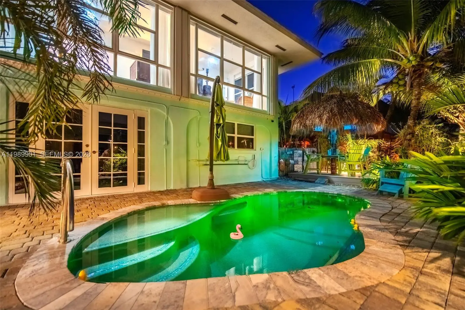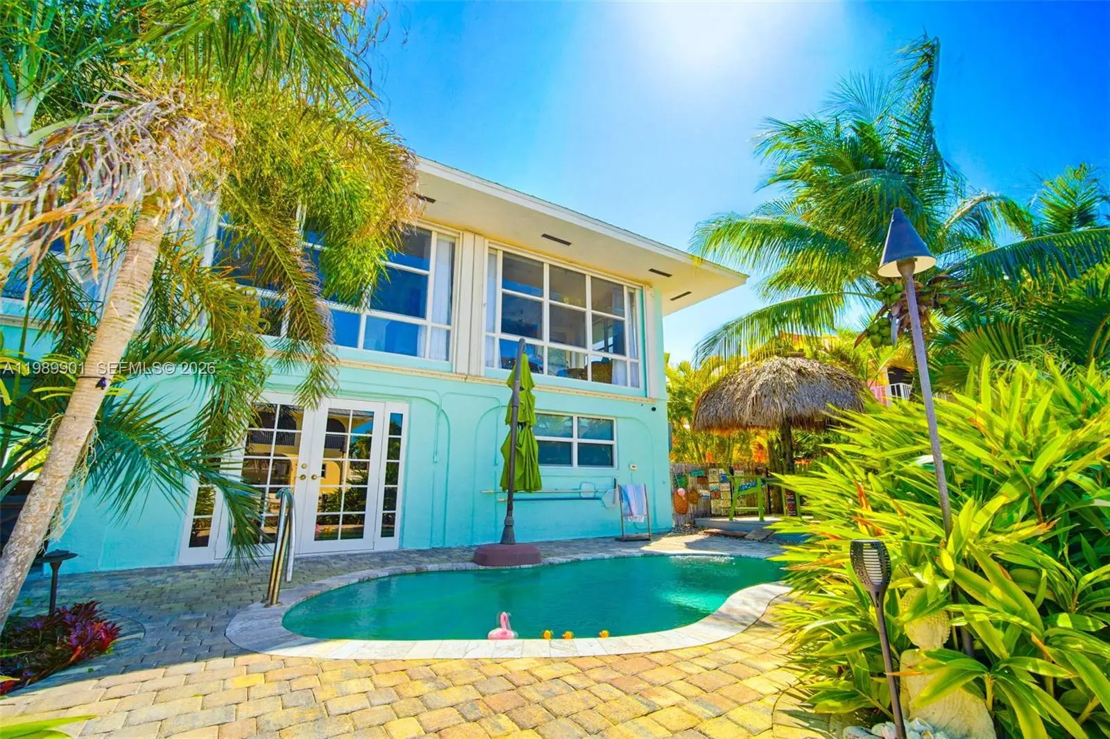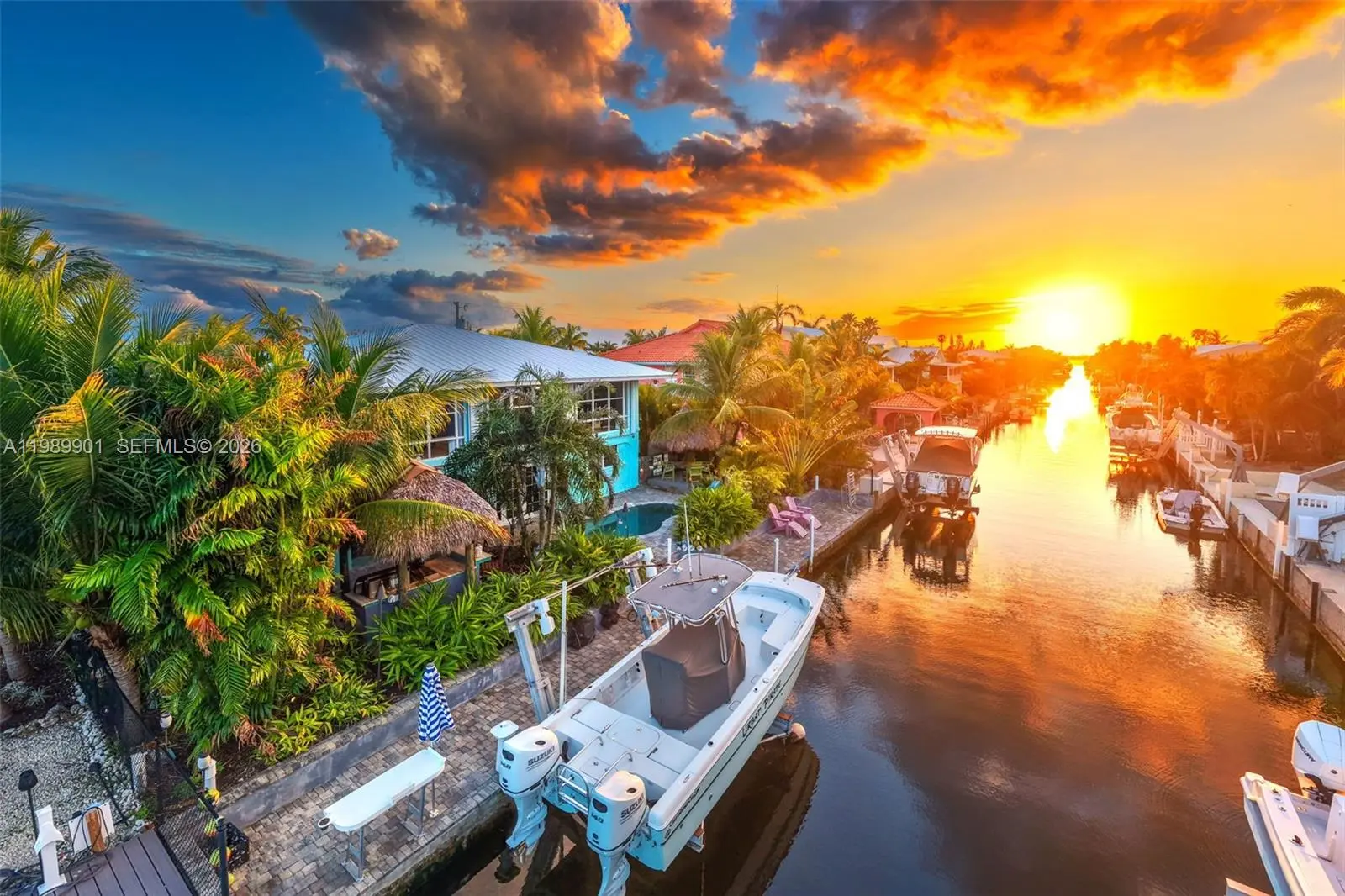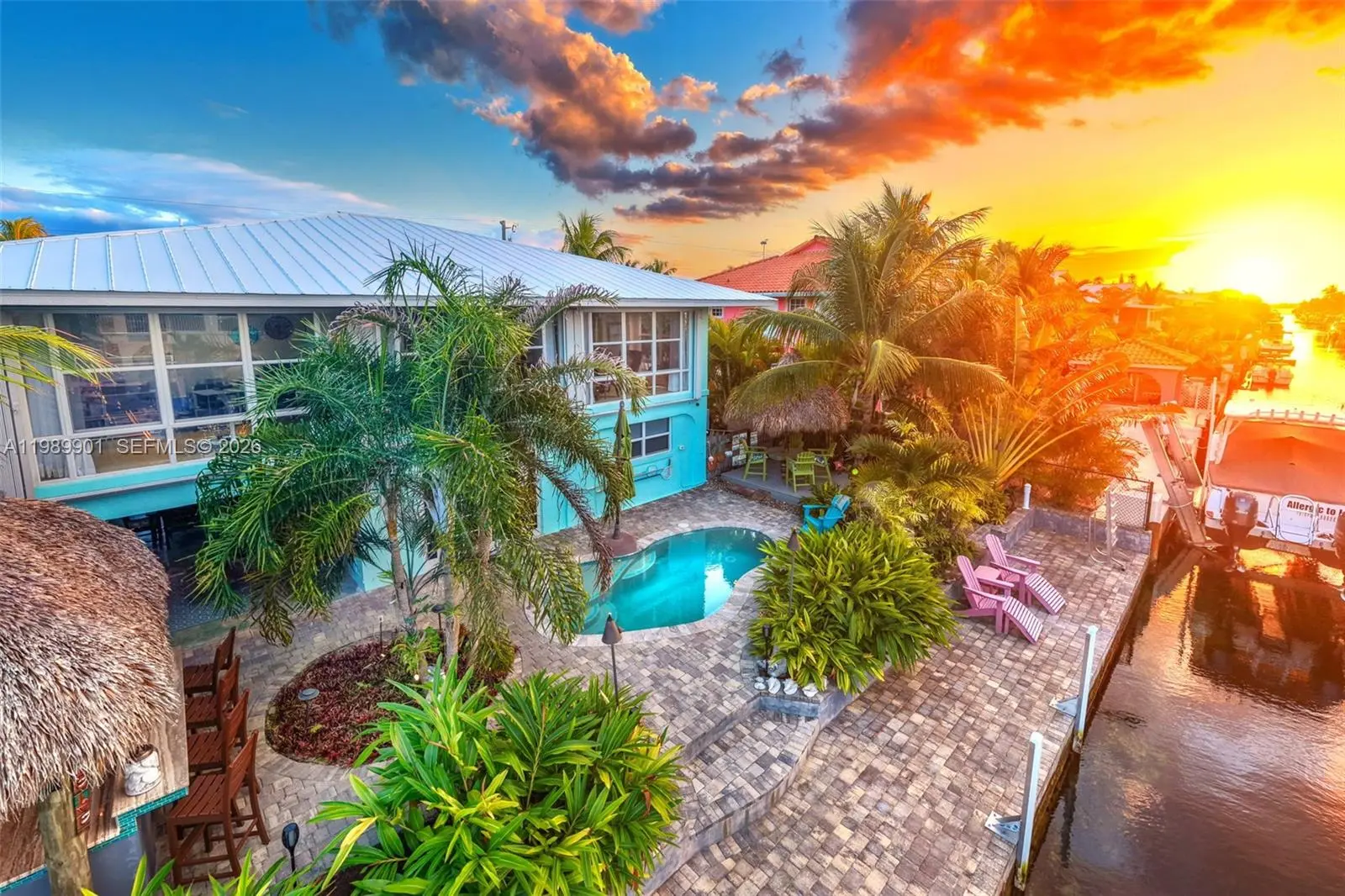 Looking for your piece of paradise in the Keys? You've found it! This property feels like a lush private resort. The exceptional features include pavers on deck and dock, heated/chilled pool, tiki hut and tiki bar, chef's outdoor kitchen, 10k boat lift, landscape irrigation with separate water meter, and landscape lighting. The entire yard is fenced and gated. The 1596 sq. ft. concrete block home is very bright and light with hardwood and travertine floors. Floor-to-nearly-ceiling height windows in the large sunroom create a wonderful sitting room and office. A focal point in the kitchen, the stunning oak table island provides storage and seating for 6; stainless steel appliances include a chef's oven and 5-burner gas cooktop. The primary bedroom has a large closet, armoire and renovated ensuite bath with a tiled shower and tile inset shelf, customized vanity and wood tile floor. Also renovated, the second bath includes a bathtub with a tiled surround and inset shelf. On the ground level are the garage and storage enclosure with a convenience bath and ice machine hookup, and an inviting sitting area for relaxing and entertaining. The upstairs windows are impact-resistant except for the sunroom windows which are protected by accordion shutters. Additional features include a 20KW whole house generator, passenger elevator, paver-drive. Don't hesitate - this won't last long!