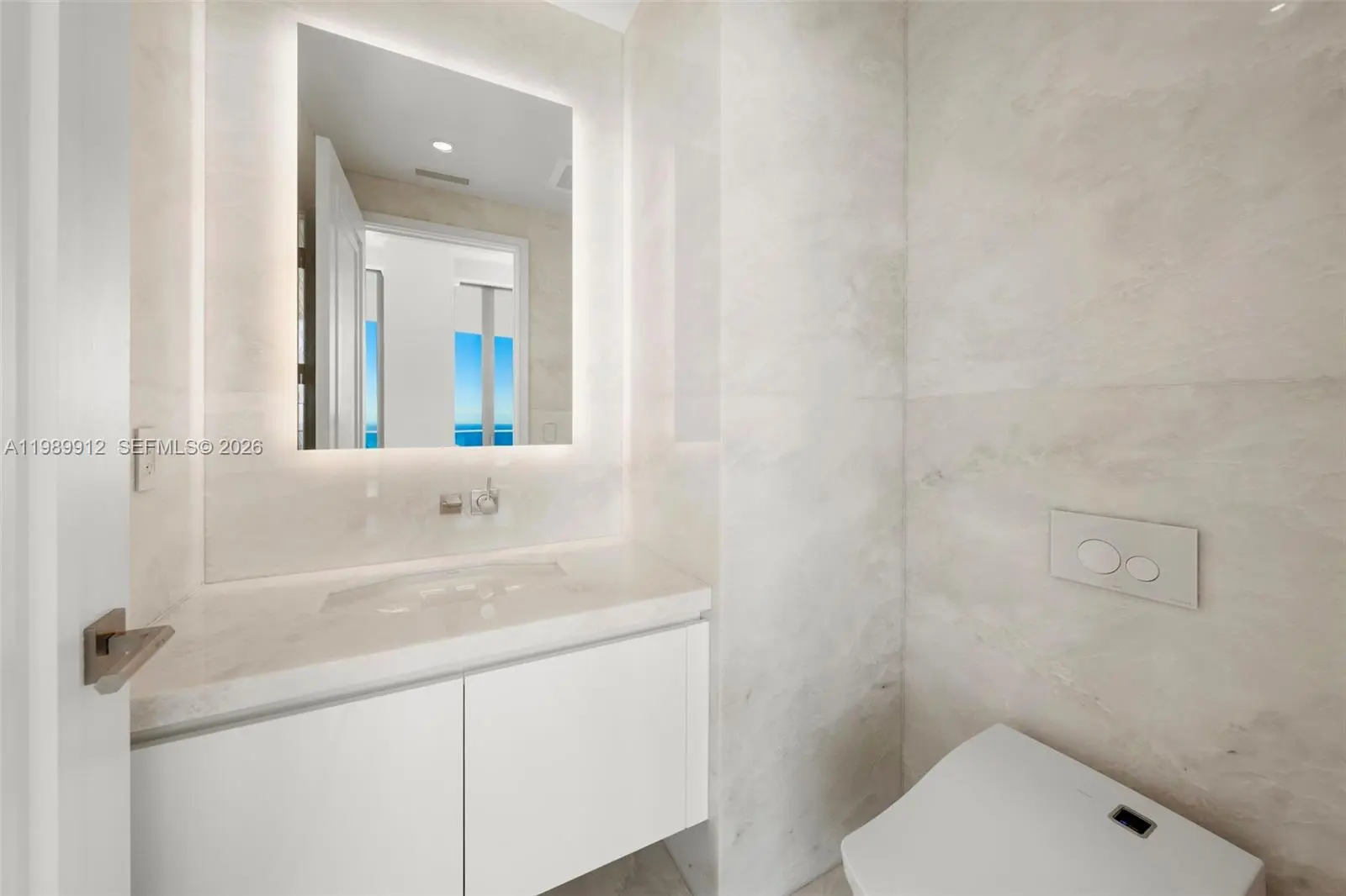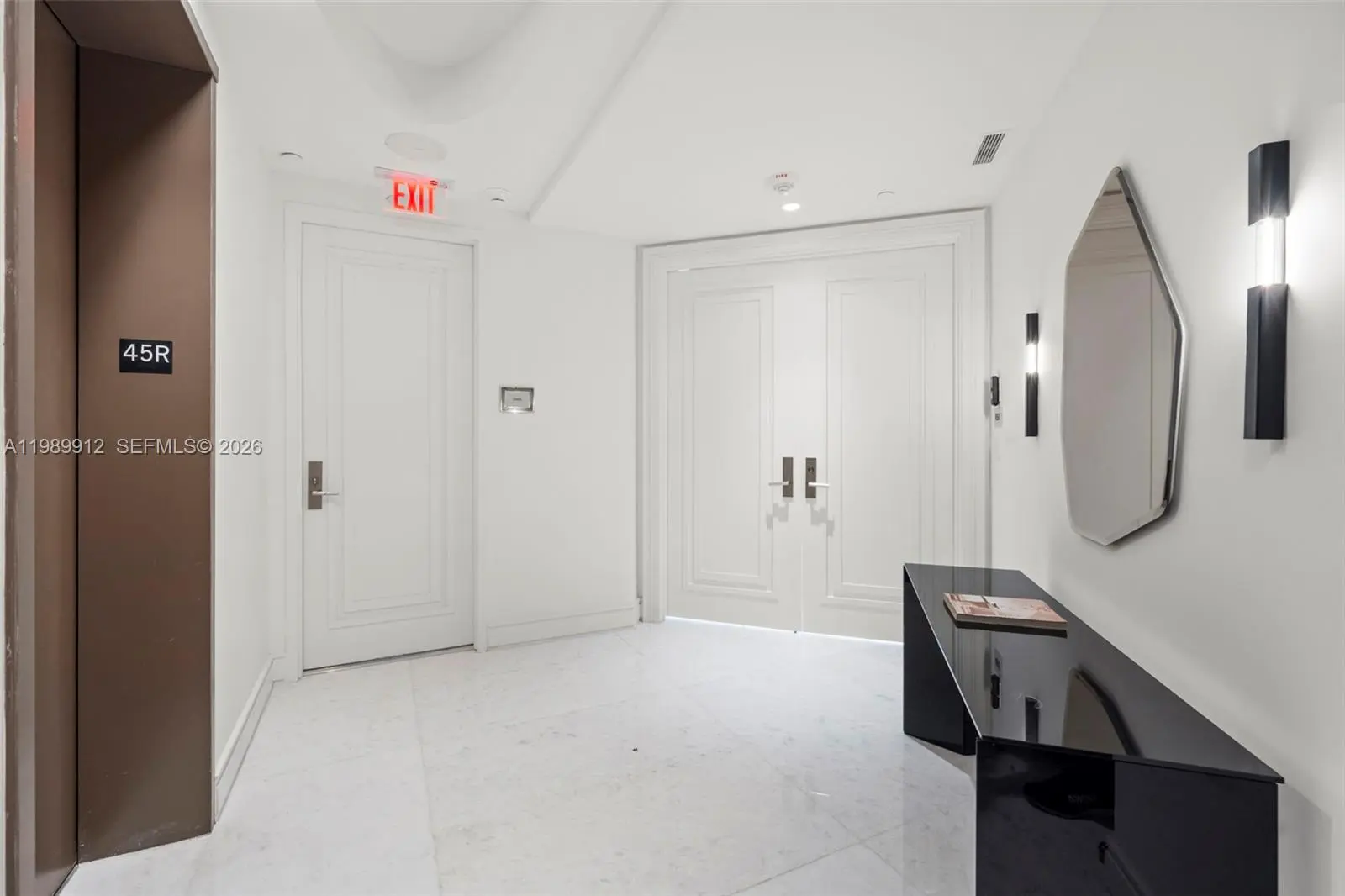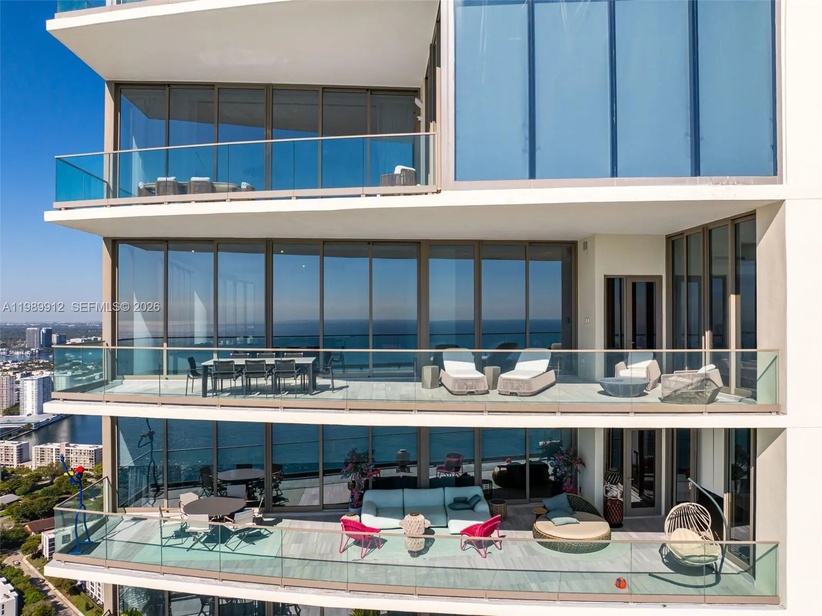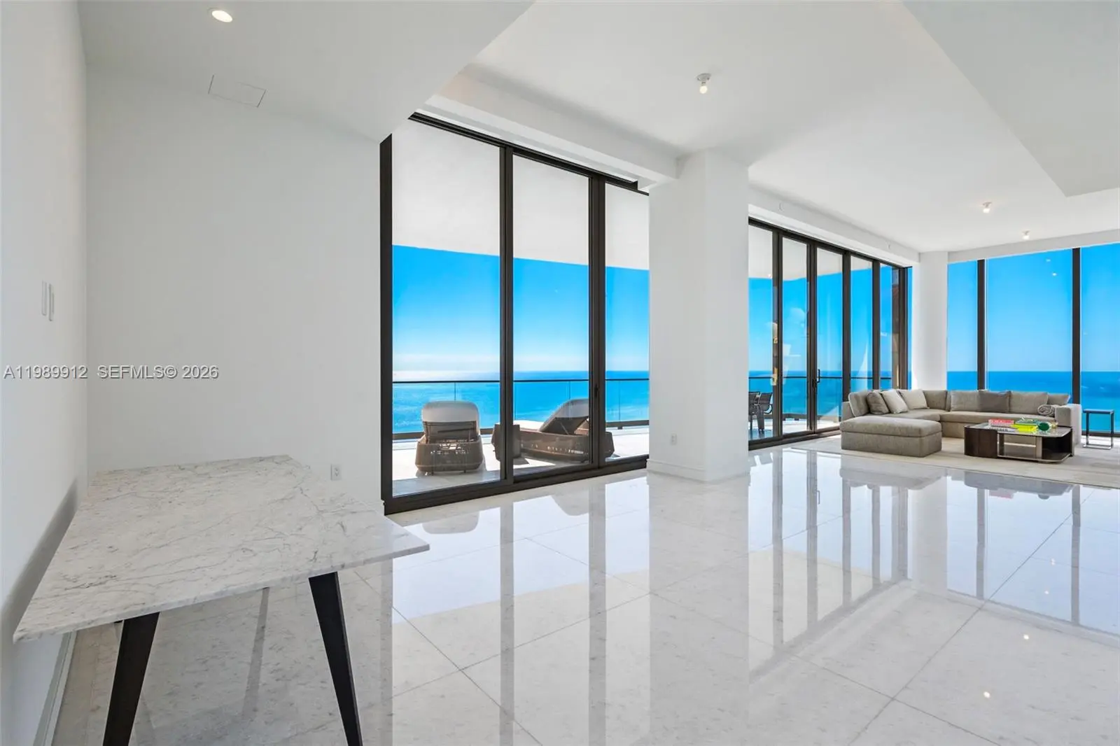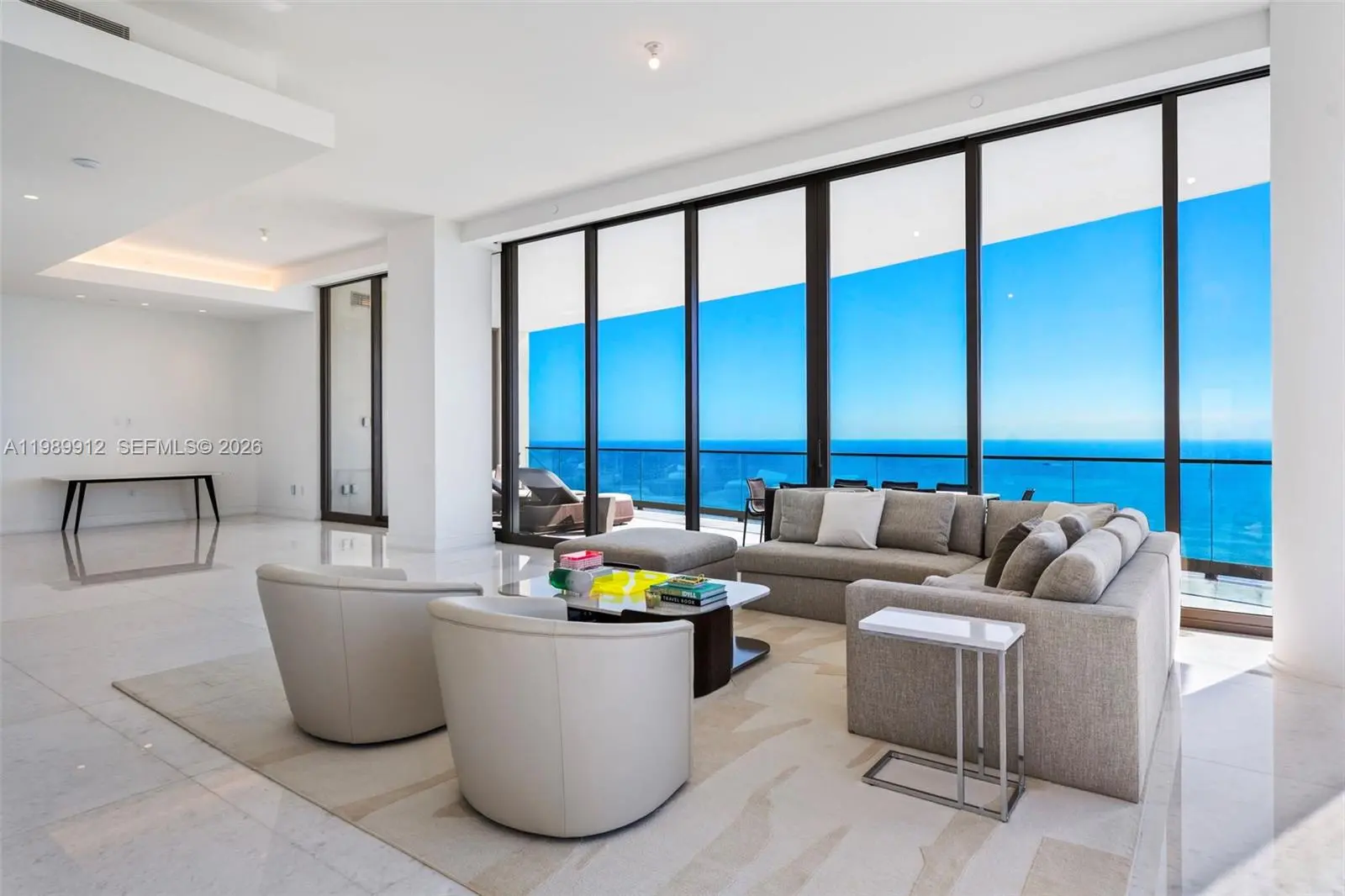 Discover the most coveted residence within "The World's Finest Residences", The Estates at Acqualina. Perched on the 45th floor, this rare south-corner trophy home is defined by soaring 12-foot vaulted ceilings—a unique architectural feature that amplifies its grand proportions. The views are boundless, stretching across the turquoise Atlantic to the glittering Miami skyline. Designed for both intimate family life and large-scale entertaining, the expansive layout includes a majestic great room and a separate family room. The residence offers four bedrooms with the flexibility for a fifth. The chef's kitchen is a masterpiece, anchored by dual La Cornue gas ranges and a full suite of Sub-Zero and Miele appliances. Throughout the home, the finishes are peerless: rare white onyx wraps every bathroom, complemented by Dornbracht fixtures and Toto washlets. Over 1,100 square feet of private terraces complete with an oceanfront sauna. Full smart-home automation for lighting, climate, audio-visual, and window treatments. Enjoy a lifestyle of unparalleled service. Five-star amenities include a private Rolls Royce fleet, five signature restaurants—including Estiatorio Avra, Il Mulino, and KeUh—and three distinct pools featuring a FlowRider and waterslide. From the ice-skating rink and bowling alleys to the F1 and golf simulators, every desire is anticipated by a dedicated concierge team.