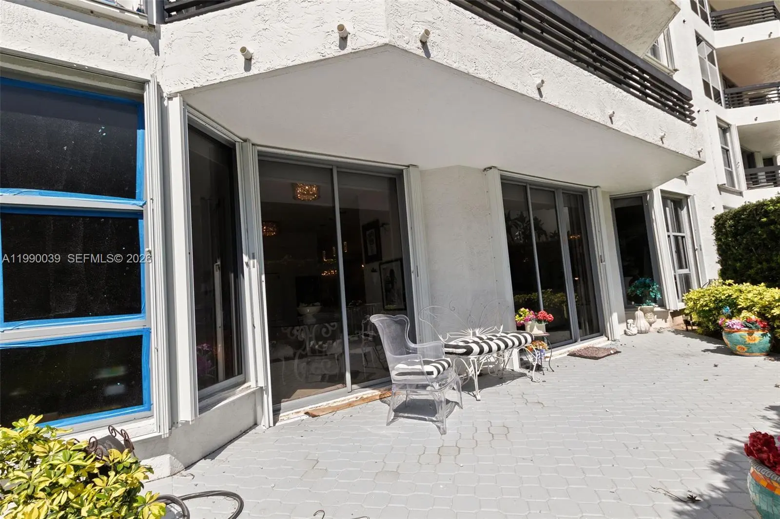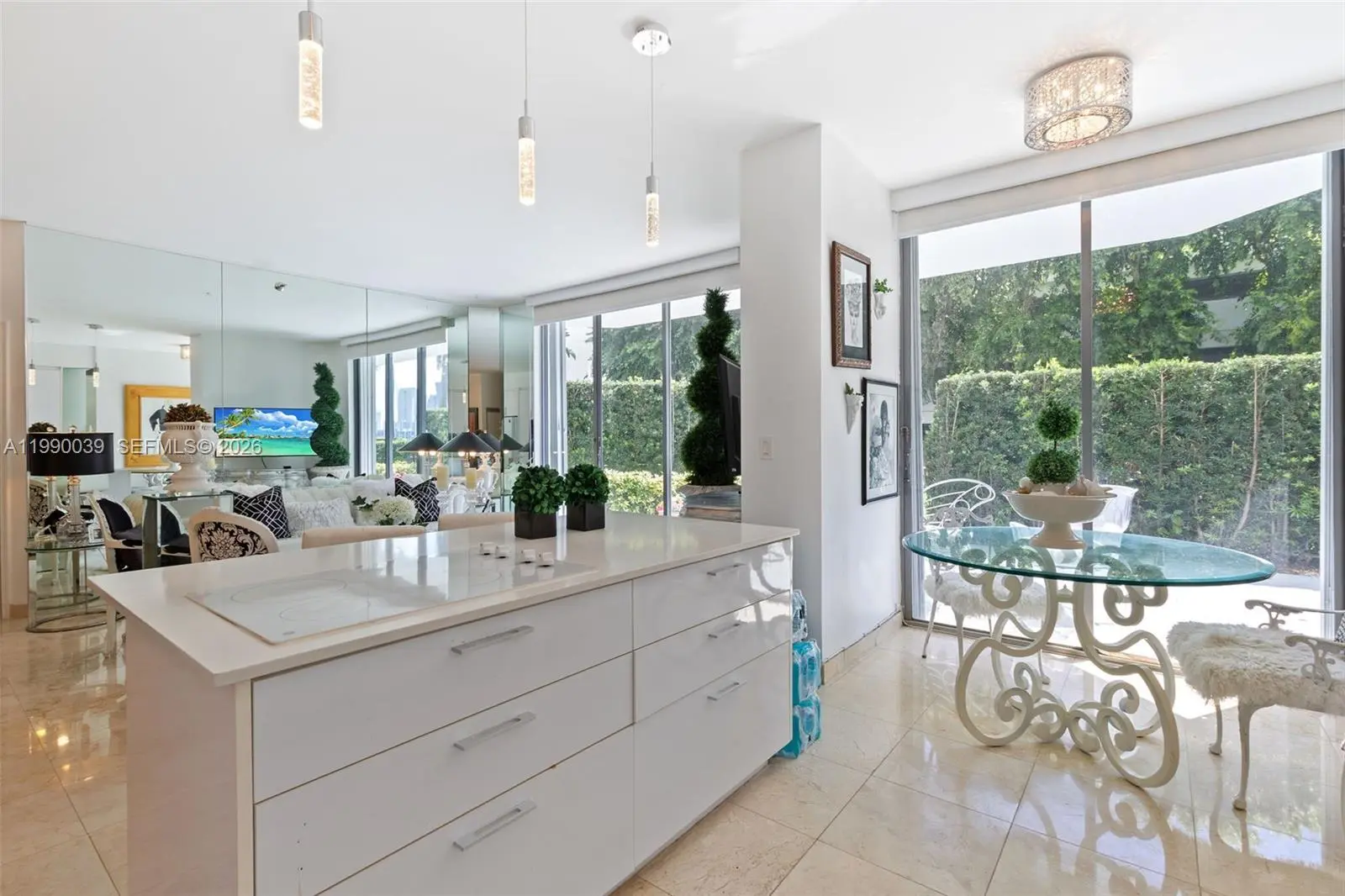 Welcome to your Own Oasis! Once you enter this magnificent unit, you immediately feel you are in a meticulously kept House or Townhouse. This exceptional property is beyond apartment living with 12 ft high ceilings (exclusive to ground floor and penthouse), marble floors, and an open remodeled eat-in kitchen. The entire space is filled with natural light, all showcasing designer high-end touches. There are upgrades throughout the Primary Bathroom and 2 additional bathrooms. Both bedrooms are quite large with walk-in closets. The outdoor space is just as exceptional with an extra expansive lanai, complete with privacy hedges and stunning view of the Intracoastal right beyond your patio, just perfect for relaxing or get-togethers. This is a wonderful opportunity to own this very unique, lovely home in one of Mystic Pointe's Best Buildings.