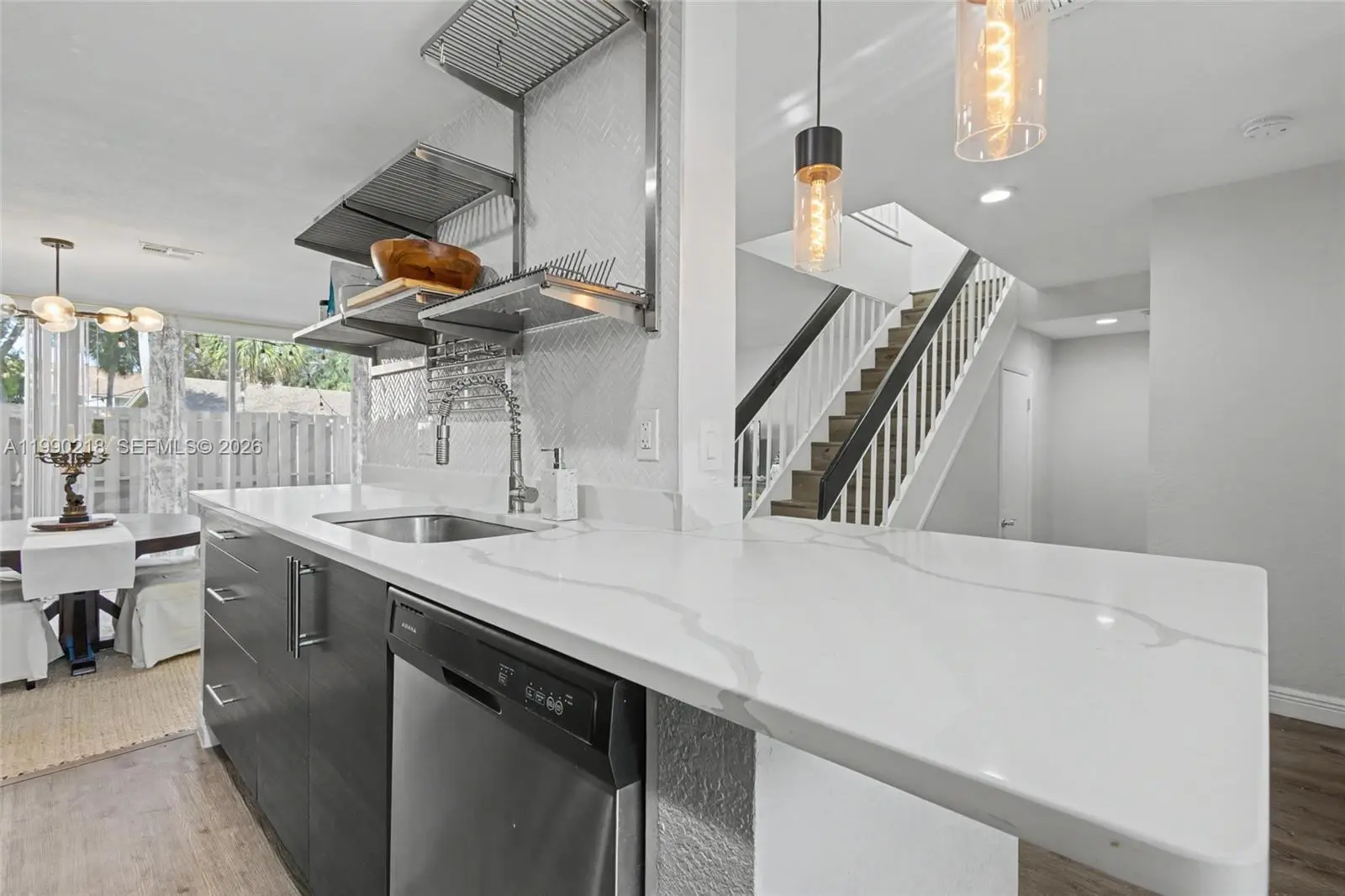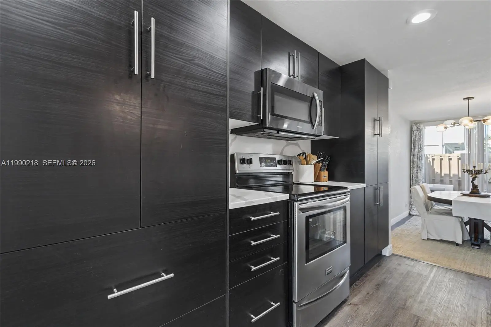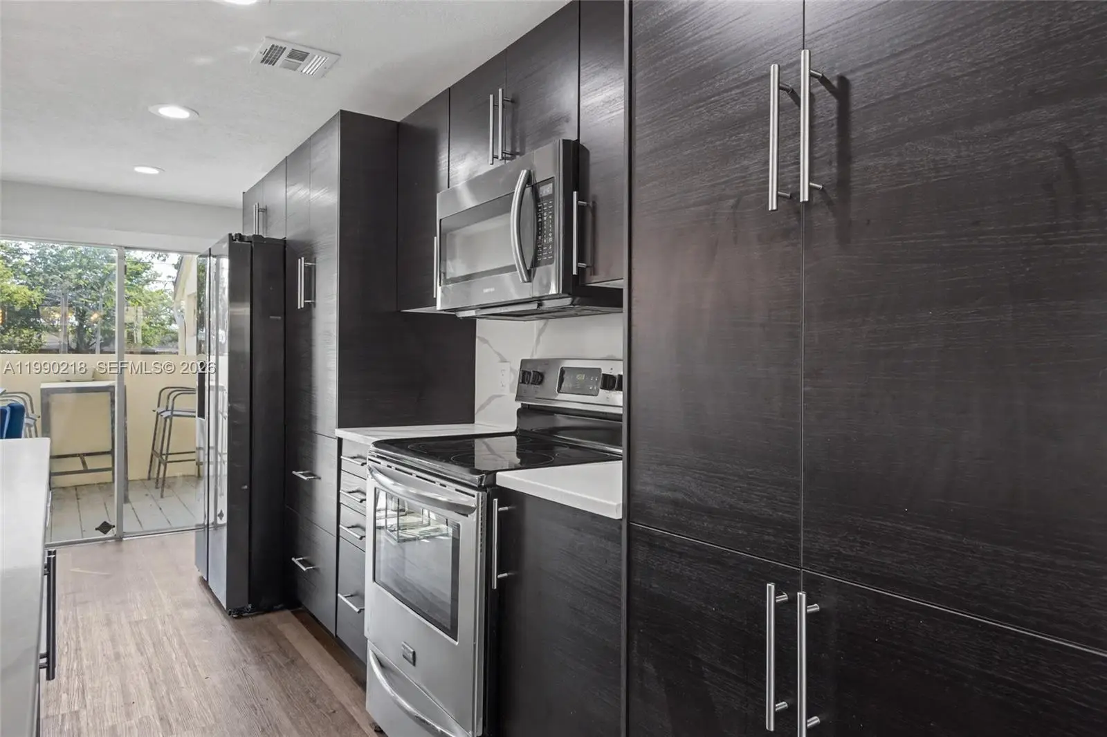 ASSESSMENT PAID IN FULL! This beautifully remodeled townhouse has been completely updated inside and out, including new roof and exterior walls. The 40 year inspection was completed and there is no special assessment. 2.5 BATHS. The interior features two spacious suites with impact windows/doors and a large open balcony. Walk-in closets. New waterproof vinyl flooring, modern lighting, and a stunning redesigned kitchen with sleek cabinetry, quartz counters & backsplash, upgraded smoked stainless appliances. The expansive living/dining area opens to a fenced patio through multiple sliding doors. Enjoy a charming front garden with seating, a laundry room with new washer/dryer, and a 1-car garage plus extra parking. Association allows converting the garage into an additional bedroom. Unit is located next to the pool.