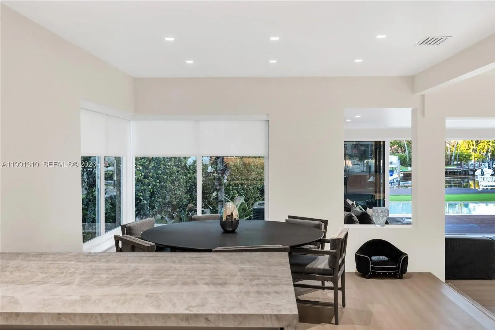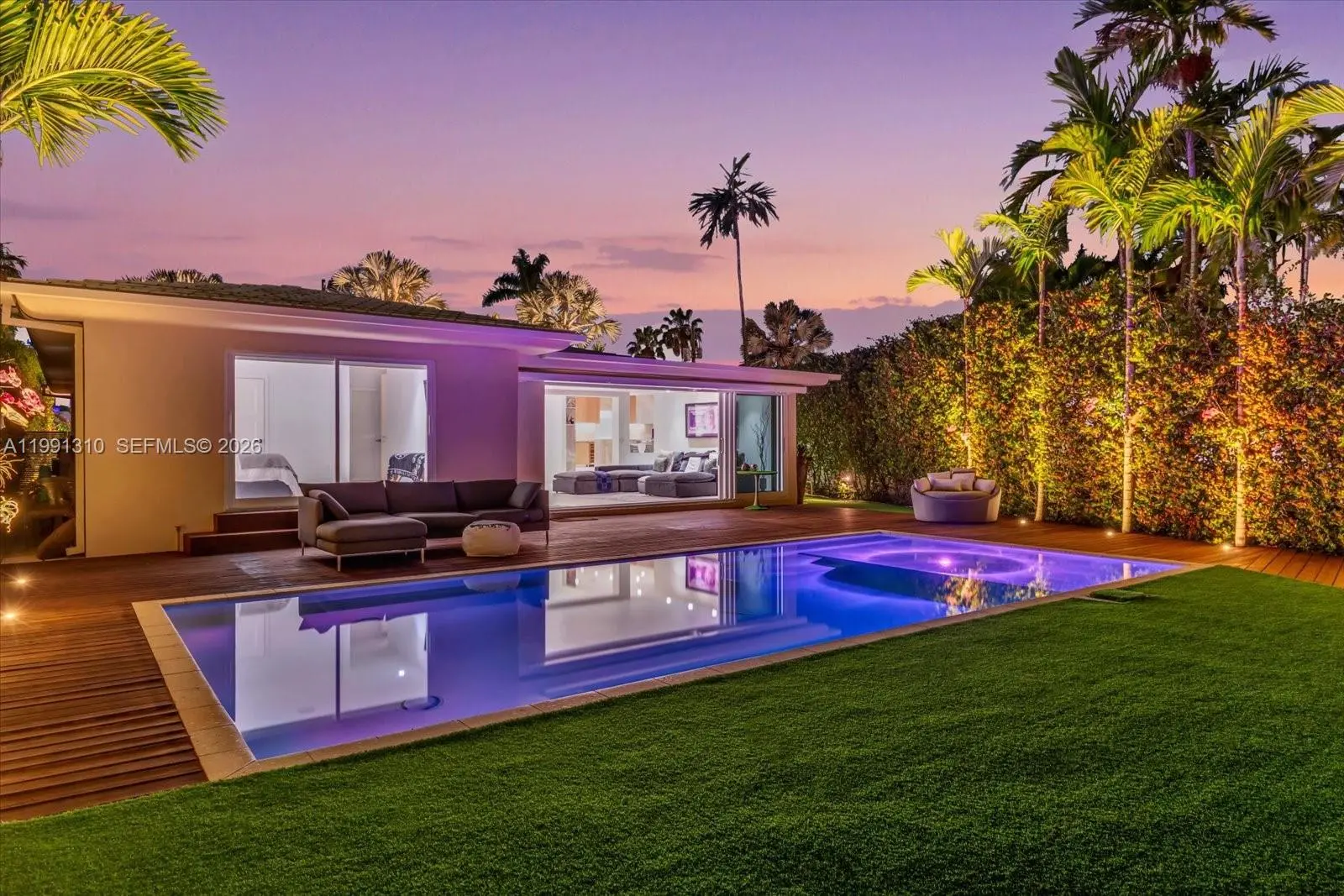 Waterfront retreat on secluded Biscaya Island in Surfside! This beautifully newly renovated residence, designed by renowned architect Fein, offers 44 ft of prime waterfront with unobstructed access to the Intracoastal and open ocean—no fixed bridges. A rare opportunity for true boaters seeking both privacy and convenience. Designed for effortless indoor-outdoor living, the home features expansive open spaces filled with natural light, a sleek modern kitchen, and multiple living areas ideal for entertaining. Set within a very private and secure double-gated enclave, the home offers an unparalleled sense of exclusivity and peace of mind. The backyard is a private oasis, complete with a resort-style pool, oversized wood deck, lush landscaping, and tranquil water views. Dock your boat just steps from your home and enjoy the ultimate South Florida lifestyle. Minutes from Bal Harbour Shops, the beach, and world-class dining, this is one of the most unique waterfront offerings in the area.