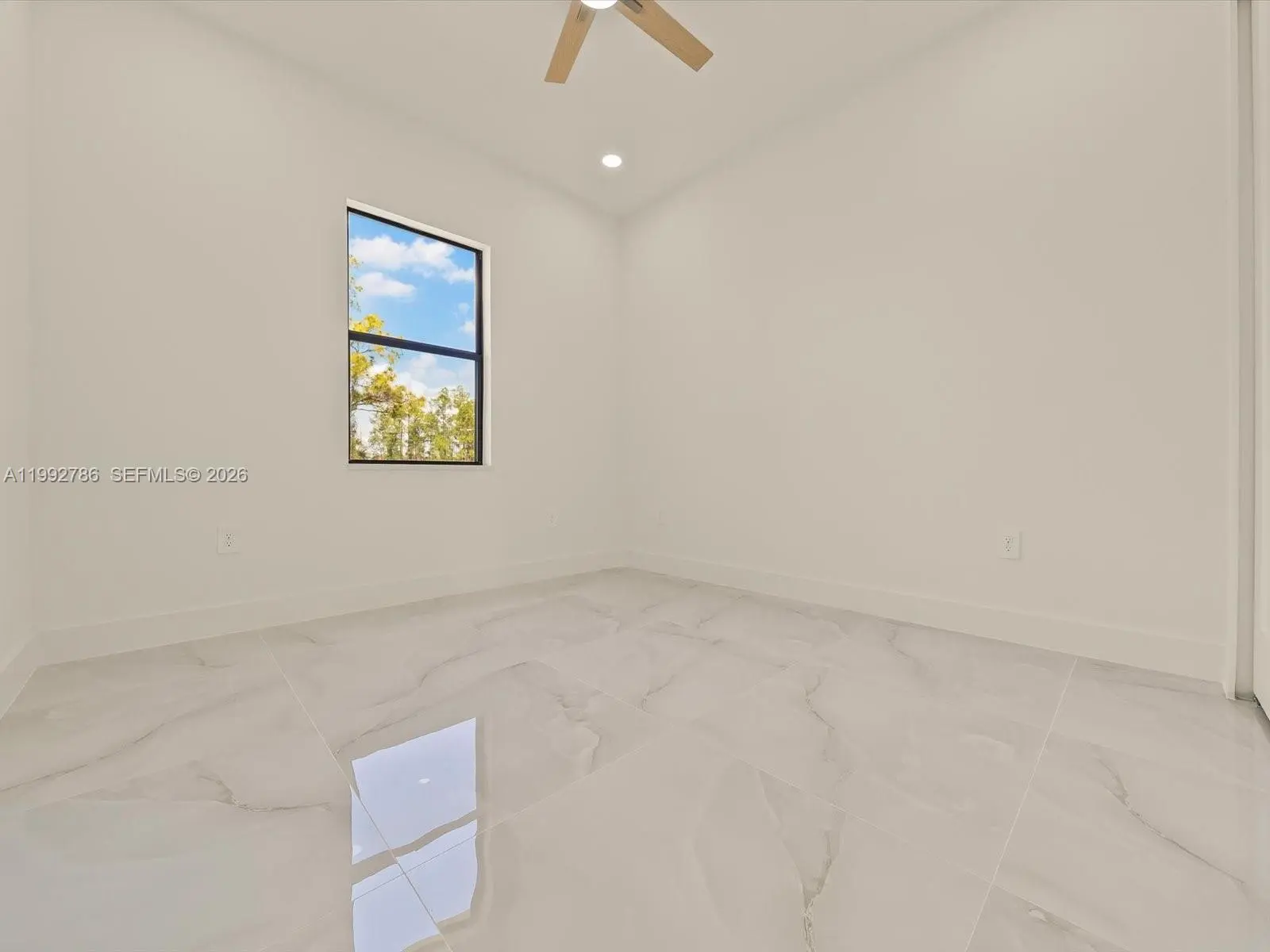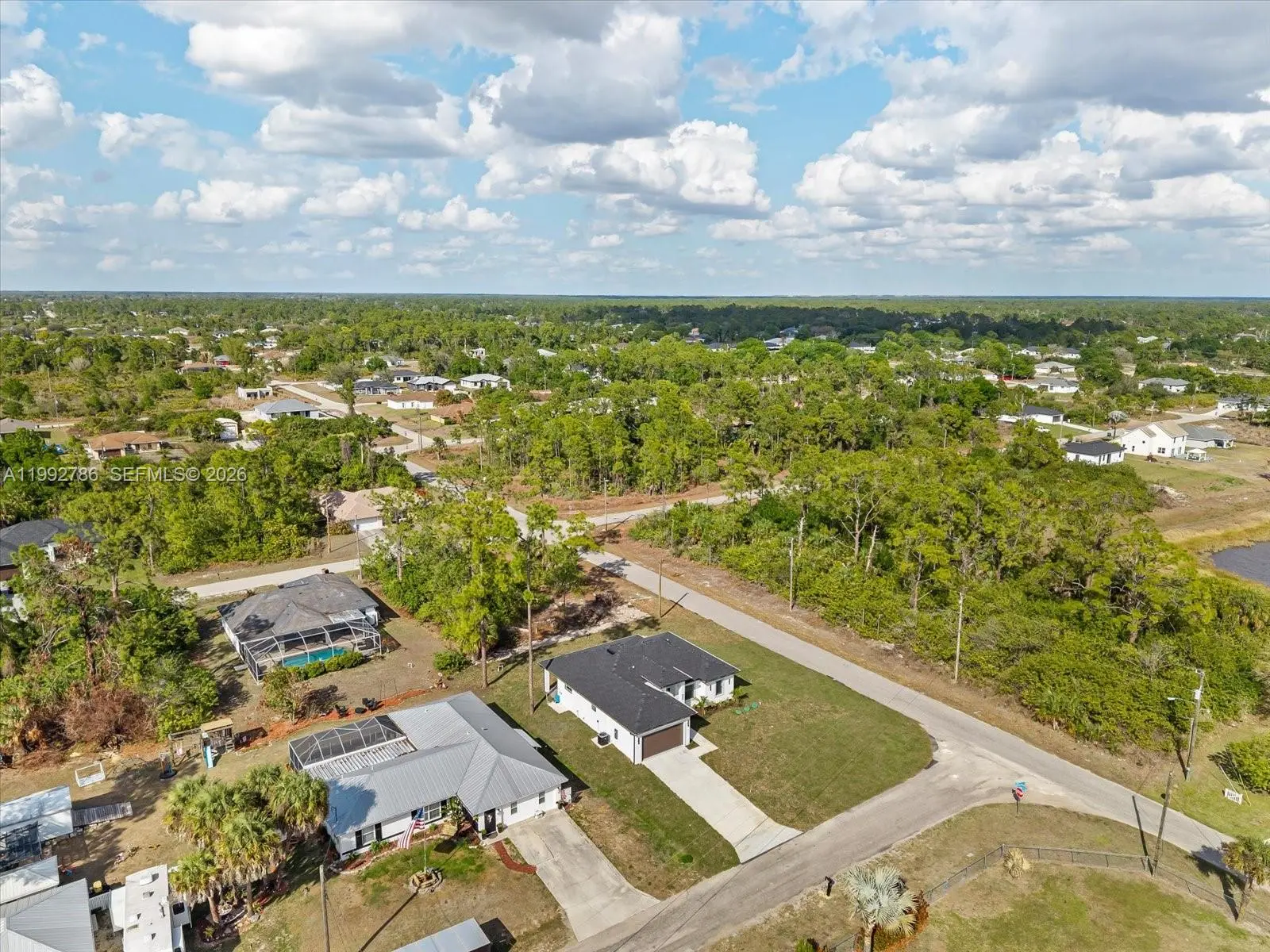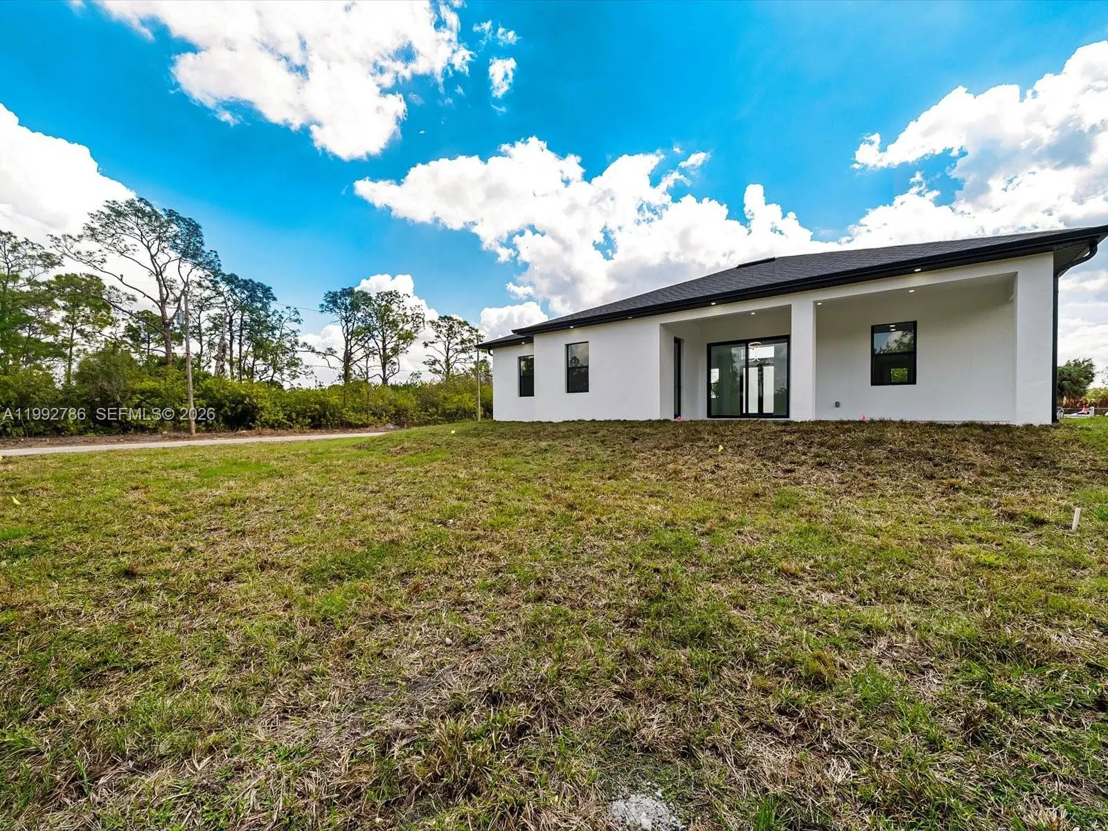 Stunning new construction on a desirable corner lot in Lehigh Acres, featuring high ceilings with varied heights, abundant natural light, and an oversized covered lanai under roof—perfect for outdoor living. This home offers 3 bedrooms + den with ensuite half bath, 2.5 bathrooms, and a spacious open-concept layout designed for versatility and modern living. The corner lot adds exceptional versatility, offering extra space, privacy, additional parking, and convenient side access—ideal for a boat, truck, or future additions such as a guest suite, outdoor upgrades, or expanded living space. Plenty of room for a pool. The interior features large-format porcelain tile flooring throughout, a modern kitchen with center island, quartz countertops, and high-quality appliances from top brands. The primary suite includes dual sinks and two walk-in closets, creating a comfortable and functional retreat. The den with its own bathroom provides the perfect setup for a potential fourth bedroom, office, or guest space. The half bath also offers direct exterior access to the lanai, adding convenience for future pool use. Additional features include a 2-car garage, dedicated laundry/utility room with sink, and impact windows and doors throughout for enhanced safety and energy efficiency. Seller willing to contribute toward buyer’s closing costs.