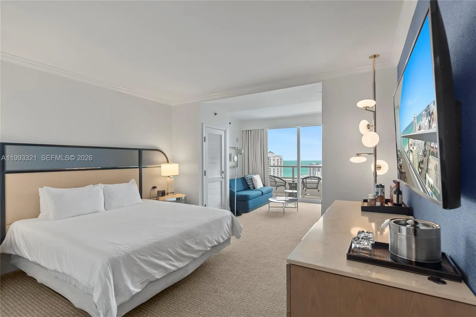 Beautiful 2BD/3BA with views of the Ocean, bay & and city at Fontainebleau II Tresor. Enjoy full service, vacation-style living in a furnished turnkey unit with 2 king beds, 2 sleeper sofas, full kitchen and washer/dryer. Enroll in hotel rental program & receive income while away! The Fontainebleau resort offers award-winning restaurants, LIV night club, Lapis spa & state-of-the-art fitness center, bakery, shops, full-service salon and more. Maintenance fees include all utilities: AC, internet, cable, electricity, valet + daily free breakfast in owner's lounge. Please click the virtual tour link to see a video of the property.