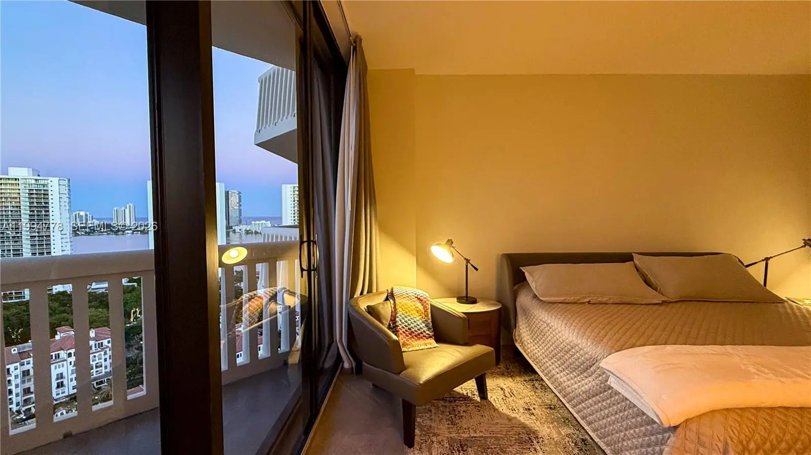 AVAILABLE JULY 2026. Stunning and fully renovated apartment with Spanish flooring in matte light gray porcelain throughout, a brand-new Monogram & Miele appliances, and granite stones imported from Brazil. All the bathrooms were redone from scratch, including all the finishing touches with the smallest details in good taste and sophistication of the showers, faucets all in matte black, giving a very modern sophistication. The view is both to the south, being able to see along the South Beach, the bay in the background with boats and from the rooms the view to the north of the bay, the Hard Rock hotel and casino, etc. The apartments are all decorated with almost unused furniture by a Brazilian architect. 16 tennis crts, pickleball crts, swimming pools, 2 floors of gym with classes, 3 wonderful restaurants!