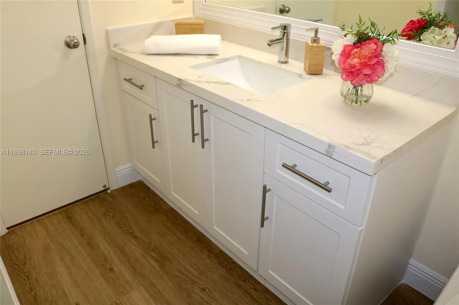 Spacious first-floor corner-unit apartment available in the quiet and well-maintained community of Gardens North. This remodeled residence features new flooring throughout, creating a bright and inviting living space. The updated kitchen offers new white cabinetry, modern countertops, and a convenient pass-through to a separate dining area, ideal for everyday living and entertaining. Enjoy peaceful lake views from both bedrooms and the fully screened-in patio, perfect for relaxing outdoors. The primary bedroom includes a spacious walk-in closet and an updated en-suite bathroom with a walk-in shower, double-sink vanity, and linen closet. The second bathroom features a tub and updated white cabinetry and countertops. Additional features include a full-size washer and dryer in the unit, pantry/storage space, and a utility closet for added convenience. One assigned parking space is located close to the unit entrance, with guest parking nearby. Residents of Gardens North enjoy access to community amenities including a clubhouse with heated pool, fitness center, and tennis courts. One small, well-trained pet welcome with a non-refundable $200 pet fee. Showings will begin the last week of April.