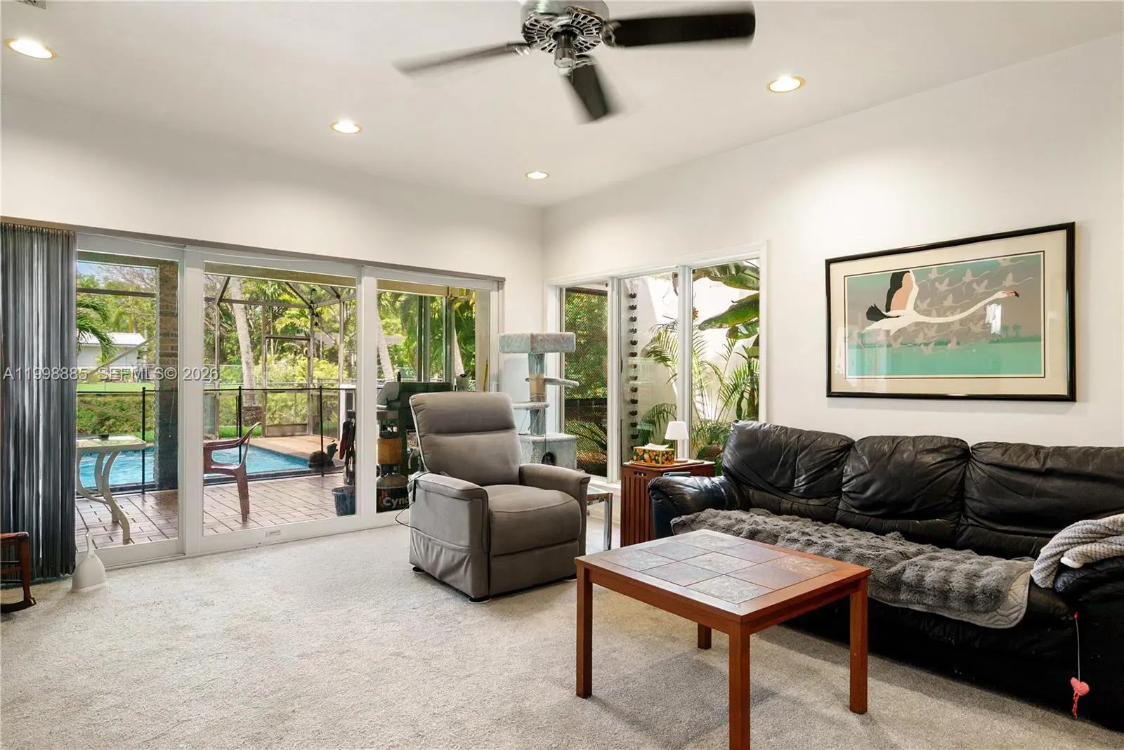 Tucked away on a quiet street in Pinecrest, this 4-bedroom, 2.5-bath canal-front residence offers a flexible layout and serene surroundings. Originally built by Hollub, the home reflects solid construction and thoughtful design throughout. Upon entry, a unique tropical art carved glass feature sets a distinctive tone, adding character and visual interest. A spacious living room overlooks a private enclosed atrium with a calming water feature, bringing in natural light and an indoor-outdoor ambiance. Family room features vaulted tongue-and-groove ceilings, creating an open and airy atmosphere. The kitchen is appointed with quartz countertops, updated cabinetry, and ample storage. Additional storage is found throughout the home, supporting everyday functionality. All windows and doors are impact-rated for safety, energy efficiency, and peace of mind. A full-house generator provides uninterrupted power and added convenience. Outdoors, the fully fenced yard is divided into three separate sections, offering versatile space for entertaining, pets, play, or gardening. The pool features a sun shelf for lounging and is enclosed within a screen for year-round enjoyment. The canal-front setting adds privacy and a tranquil backdrop. Desirable Pinecrest location close to schools, shopping, dining, and community amenities. A unique opportunity to enjoy quality construction, flexible living spaces, and a peaceful setting in one of the area’s most sought-after neighborhoods.