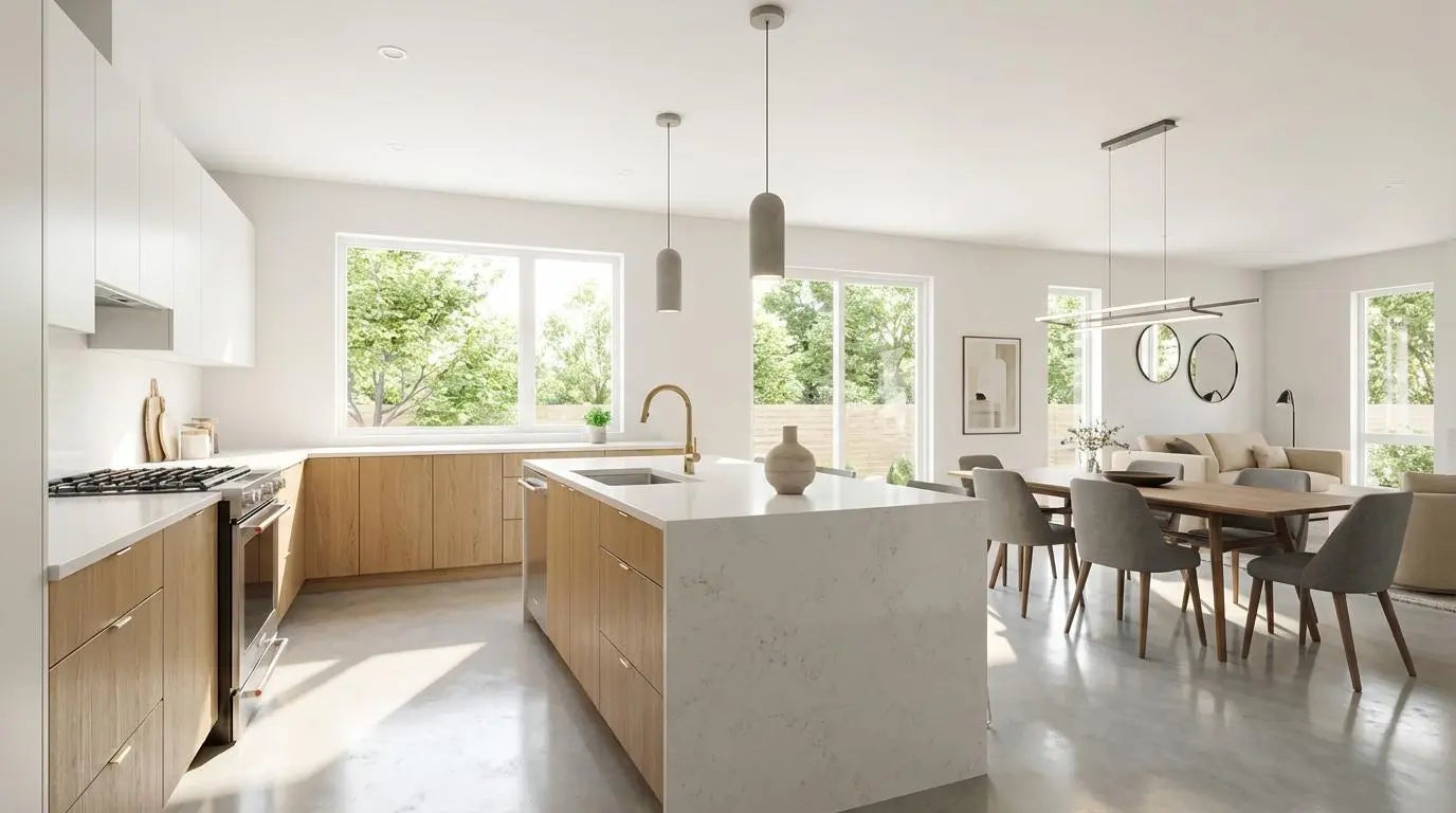 Modern new construction pre-manufactured home currently under development and scheduled for completion in the coming months. This thoughtfully designed residence features clean architectural lines, open living spaces, and large windows that bring in plenty of natural light. The open layout includes a contemporary kitchen with quality cabinetry, quartz countertops, and a central island connecting to the living and dining areas. The primary bedroom includes a private bathroom with modern fixtures and a glass-enclosed shower. Additional bedrooms provide flexible space for family living, children's rooms, guest space, or a home office. Sliding glass doors connect the interior living area to the outdoor space. Buyers who go under contract prior to completion may have the opportunity to select