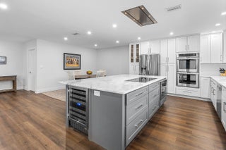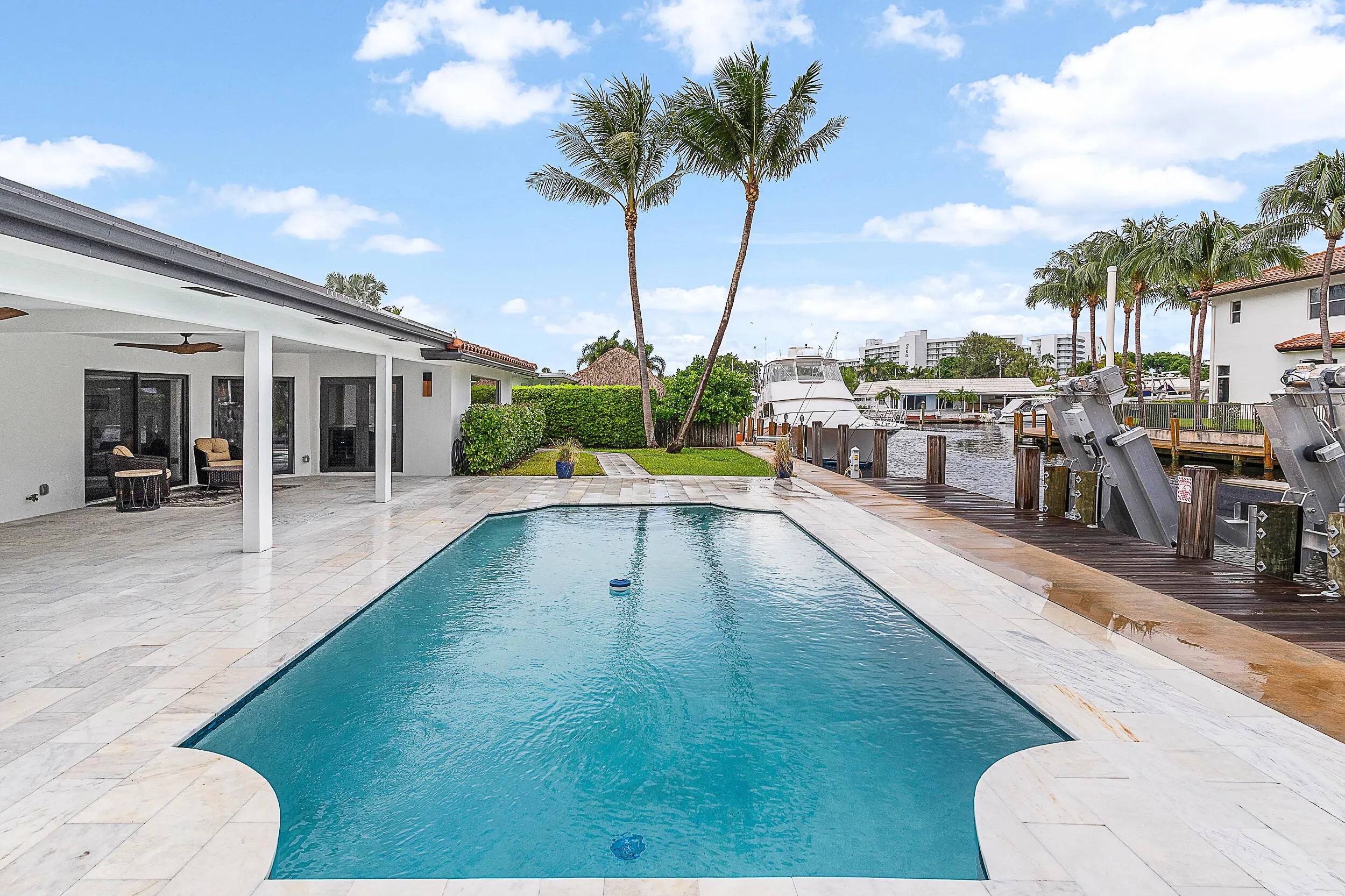 BOATER'S DREAM HOME AWAITS! NO FIXED BRIDGES! Exceptional waterfront living with a private full-service 80' dock dredged to 6' MLW, featuring a 35,000-lb BOAT LIFT (2024) and newer SEAWALL (2021). Ideally positioned by a turning basin with direct ocean access just minutes to open water. This beautifully renovated home offers a bright open floor plan, new ROOF (2024), and a stunning chef's kitchen with custom soft-close cabinetry, quartzite countertops, oversized island, flush-mount exhaust, and wine cooler. European-inspired finishes add modern elegance throughout. The expansive lanai with Egyptian marble pool decking creates the perfect setting for entertaining and relaxing while enjoying views of your yacht in the backyard. Epoxy-floored garage w/cabinetry, wet sink, and large attic!!