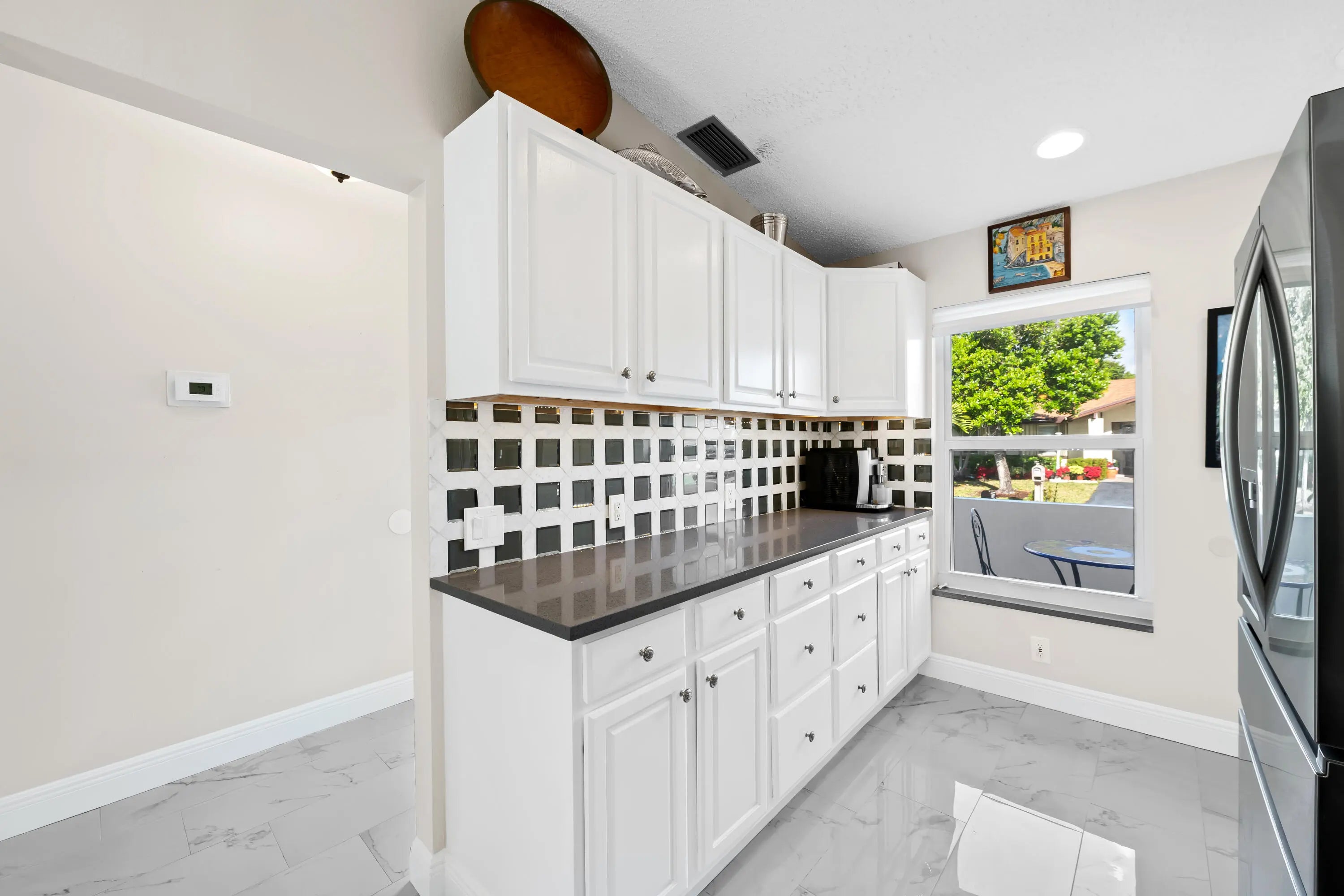 Beautifully maintained villa with attached garage in the desirable 55+ community of Las Verdes. This immaculate home features 2 bedrooms, 2 bathrooms, and a spacious office/den, offering flexible living space for work or guests. Hurricane impact windows and doors provide added safety and peace of mind. Enjoy updated bathrooms and a stunning kitchen with new countertops, backsplash, and stainless steel appliances. Modern tile flooring and vaulted ceilings create a bright, open feel. Major updates include a new roof and AC (2021) and new gutters (2025). The expanded driveway fits two vehicles, and the peaceful patio is perfect for relaxing. Resort-style amenities including a clubhouse, fitness center, library, yoga classes, social events, 3 pools, tennis, pickleball, bocce, and shuffleboard.