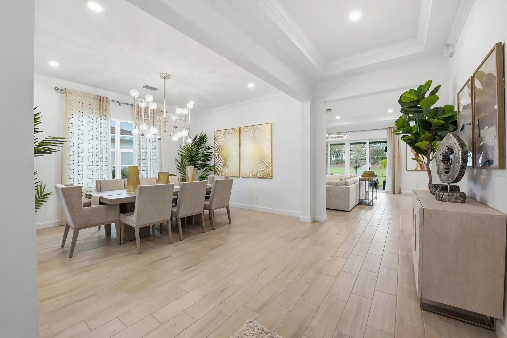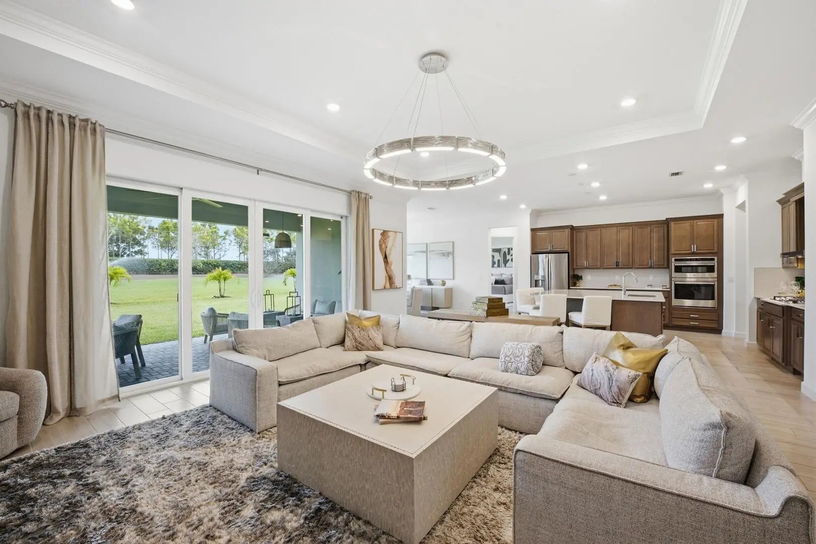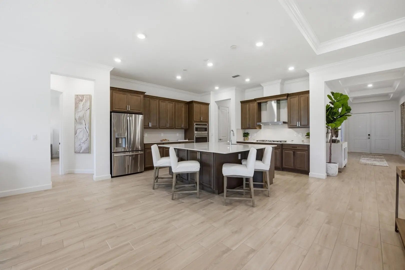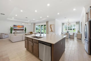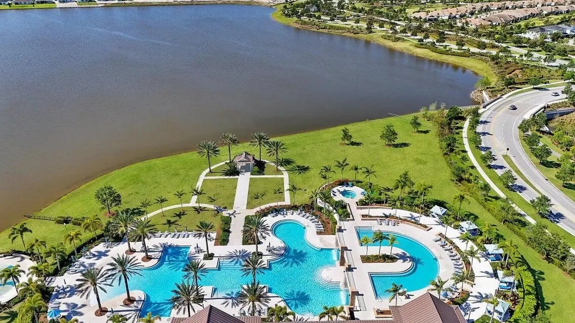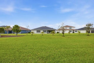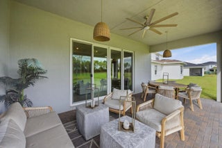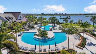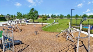 This beautifully designed 4-bedroom plus study/den, 3.5-bath home welcomes you with an elegant double-door entrance leading into a grand foyer with a triple tray ceiling. The spacious great room features sliders to the patio, creating a seamless flow for indoor-outdoor living, while the formal dining room is perfect for entertaining. The home showcases smooth walls, crown molding, wood-look plank tile flooring, and impact windows throughout. The open kitchen is a chef's dream with quartz countertops, a tiled backsplash, stainless steel appliances, a 5-burner gas stove with vented hood, a large island, snack bar, and a bright breakfast nook. The primary suite offers a relaxing retreat with a tray ceiling and dual walk-in closets. The luxurious primary bath features a freestanding soaking tub and a walk-in shower. Step outside to the covered patio overlooking a large backyard, perfect for outdoor living and entertaining. Located within walking distance to the new elementary school and near top-rated K-12 options, this home offers convenience as well as luxury. The community provides resort-style amenities: miles of trails, two clubhouses, pools, pickleball, tennis, basketball, boat ramp, fishing piers, skate park, dog parks, and even a working farm offering organic produce to residents.