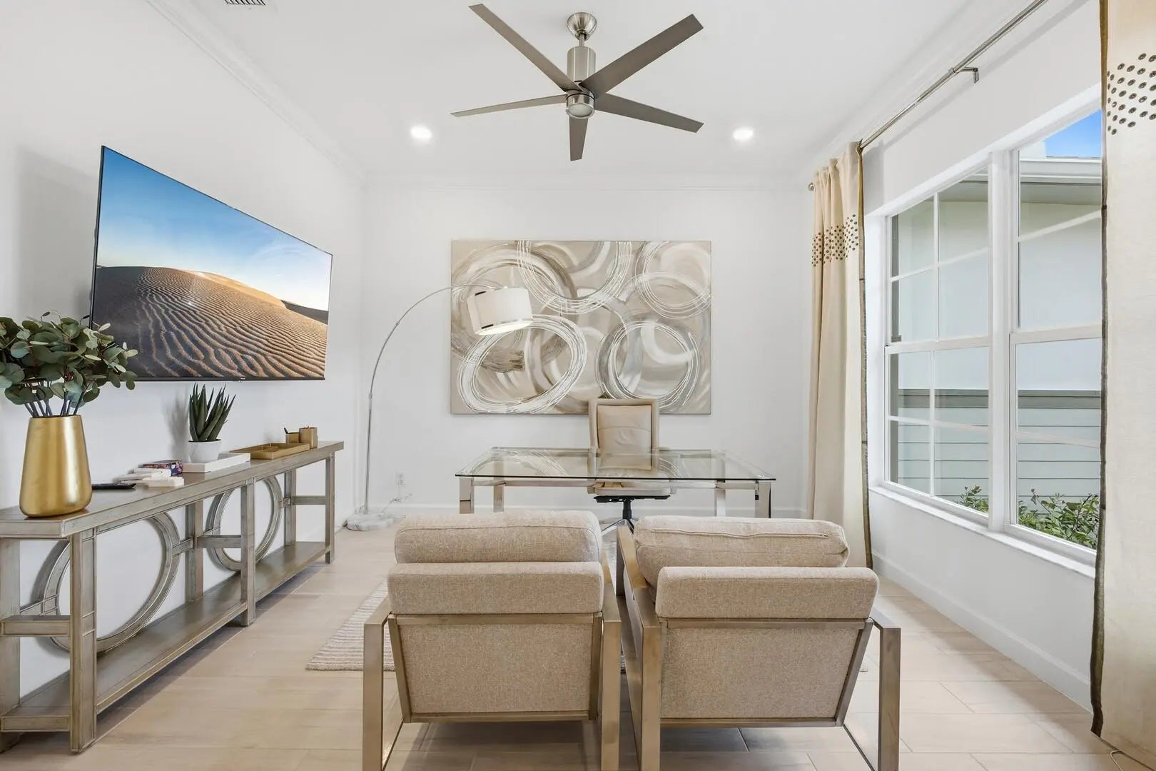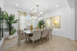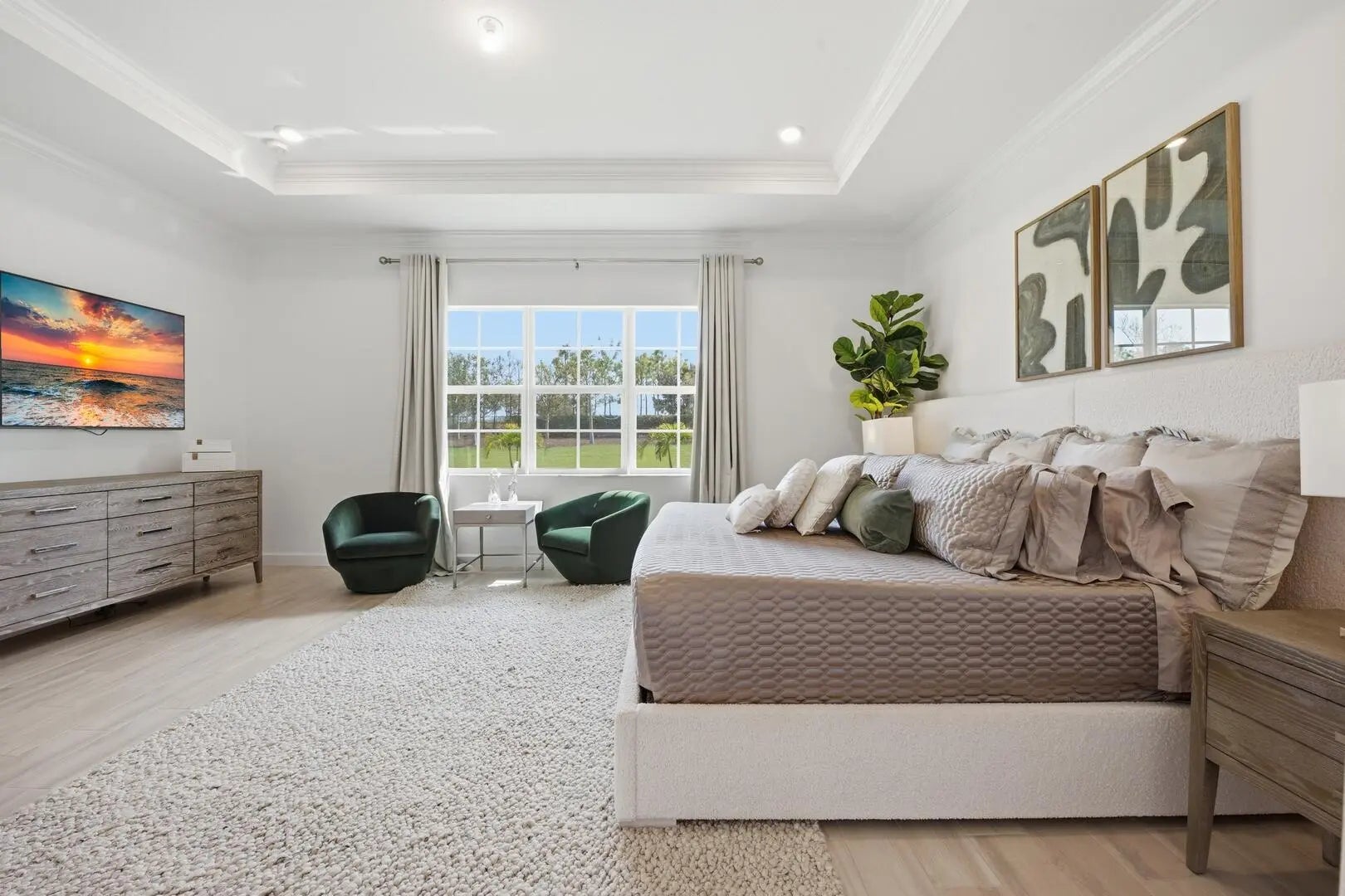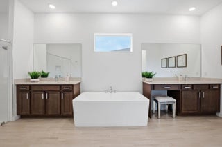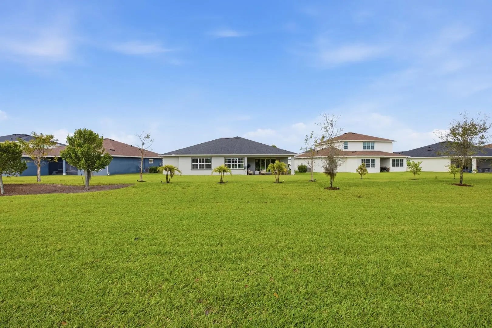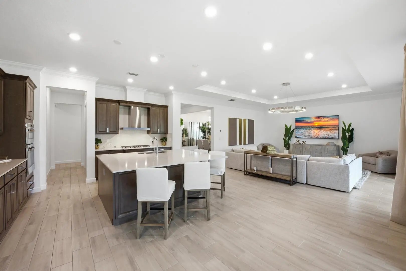 This beautifully designed 4-bedroom plus study/den, 3.5-bath home welcomes you with an elegant double-door entrance leading into a grand foyer with a triple tray ceiling. The spacious great room features sliders to the patio, creating a seamless flow for indoor-outdoor living, while the formal dining room is perfect for entertaining. The home showcases smooth walls, crown molding, wood-look plank tile flooring, and impact windows throughout. The open kitchen is a chef's dream with quartz countertops, a tiled backsplash, stainless steel appliances, a 5-burner gas stove with vented hood, a large island, snack bar, and a bright breakfast nook. The primary suite offers a relaxing retreat with a tray ceiling and dual walk-in closets. The luxurious primary bath features a freestanding soaking tub and a walk-in shower. Step outside to the covered patio overlooking a large backyard, perfect for outdoor living and entertaining. Located within walking distance to the new elementary school and near top-rated K-12 options, this home offers convenience as well as luxury. The community provides resort-style amenities: miles of trails, two clubhouses, pools, pickleball, tennis, basketball, boat ramp, fishing piers, skate park, dog parks, and even a working farm offering organic produce to residents.