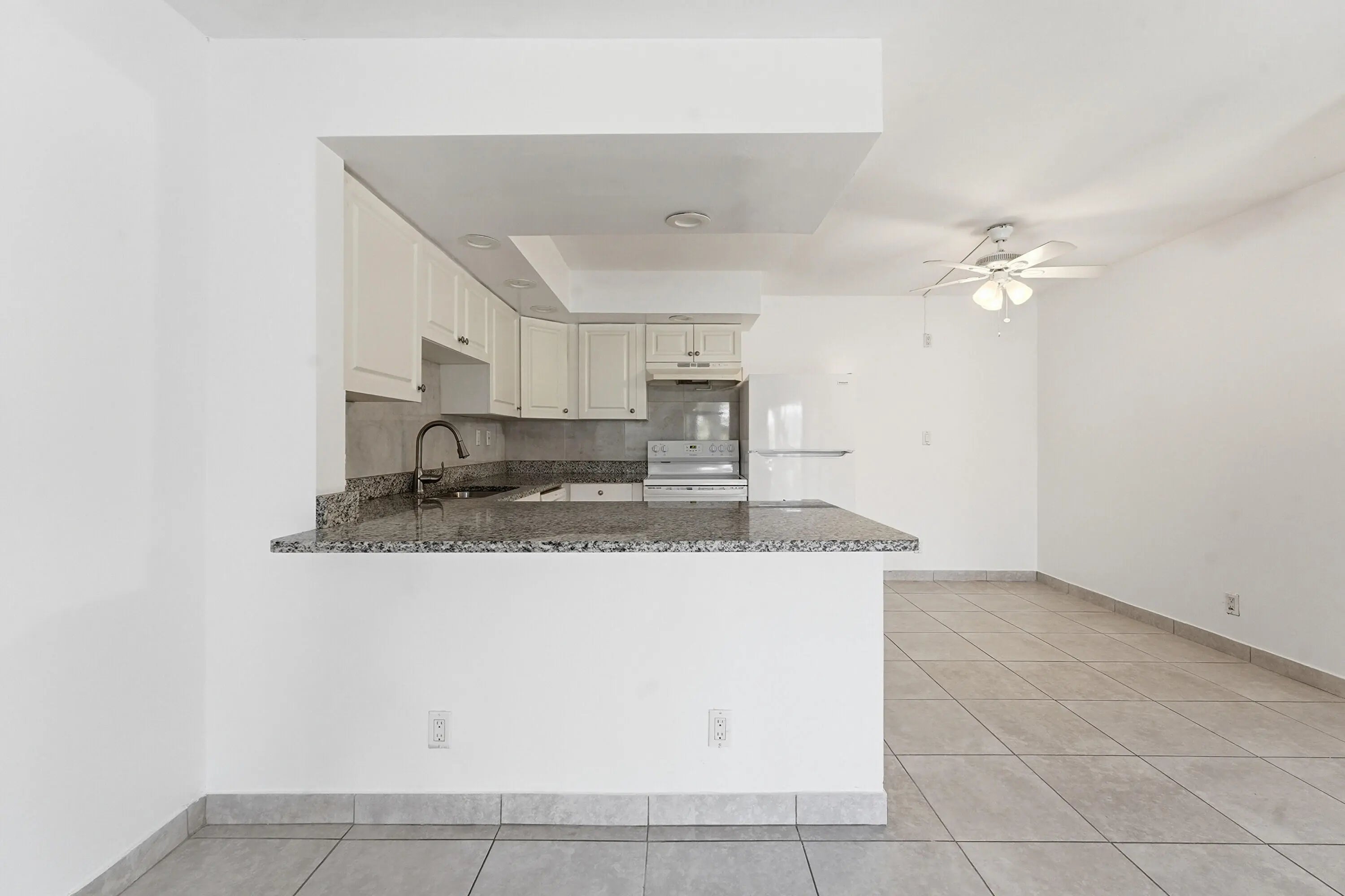 Bright and inviting 2-bedroom, 1-bath apartment located in the beautiful Villas of Riverside community. This home features a modern white kitchen with sleek granite countertops, offering a clean and stylish space perfect for cooking and entertaining. The updated bathroom includes a refreshed shower/tub combination and a contemporary vanity, adding comfort and appeal. Beautiful tile flooring runs throughout the condo, adding durability and a polished look. Natural light fills the living areas, creating a warm and welcoming atmosphere. Enjoy a peaceful, well-maintained community close to shopping, dining, and major roadways—ideal for comfortable, modern living.