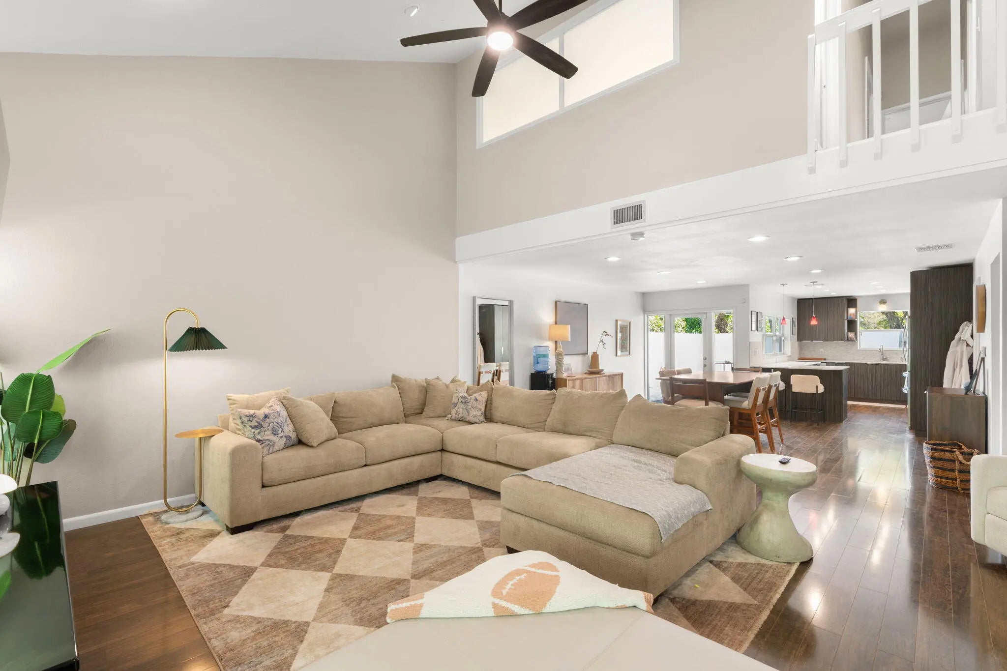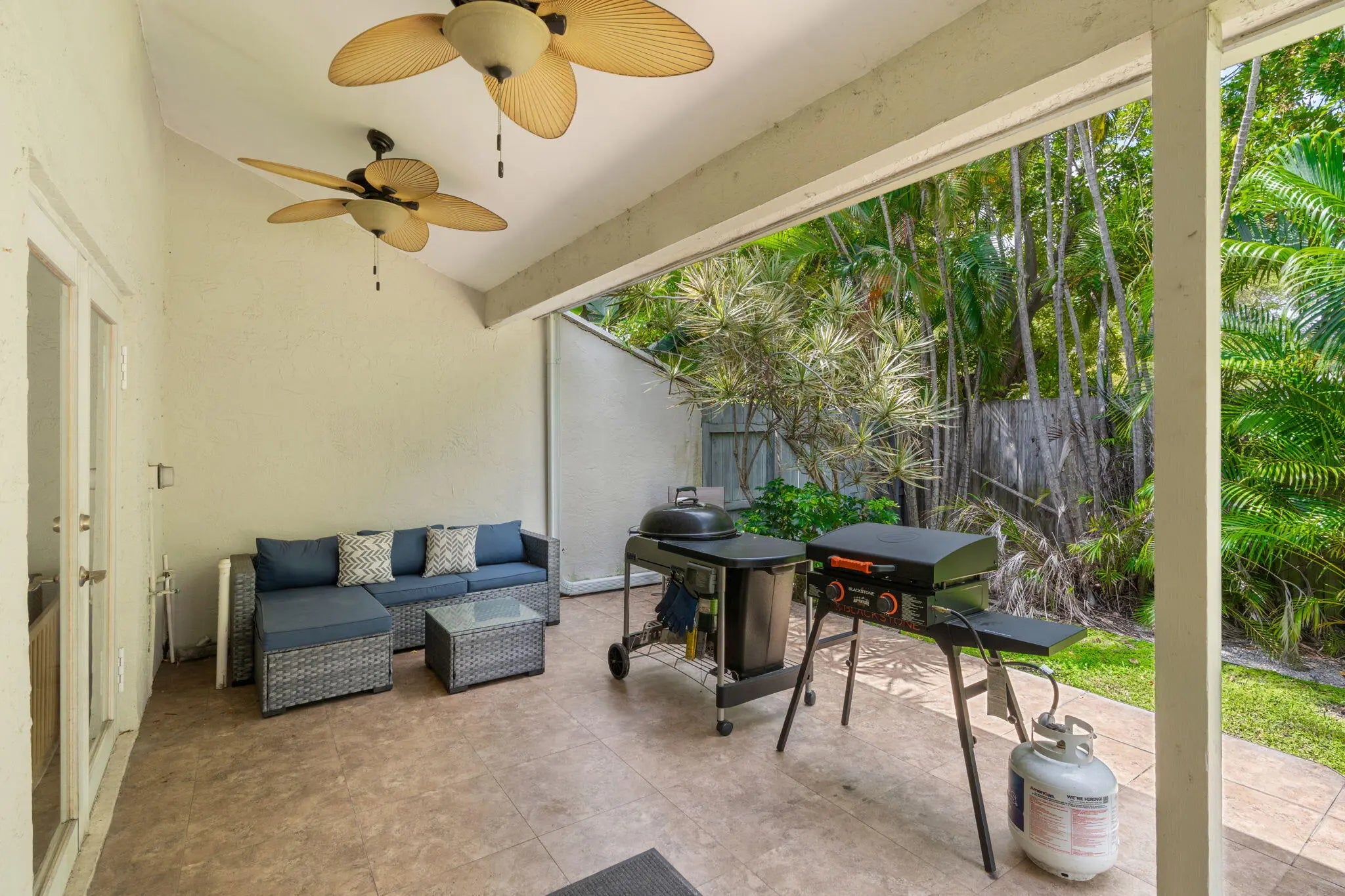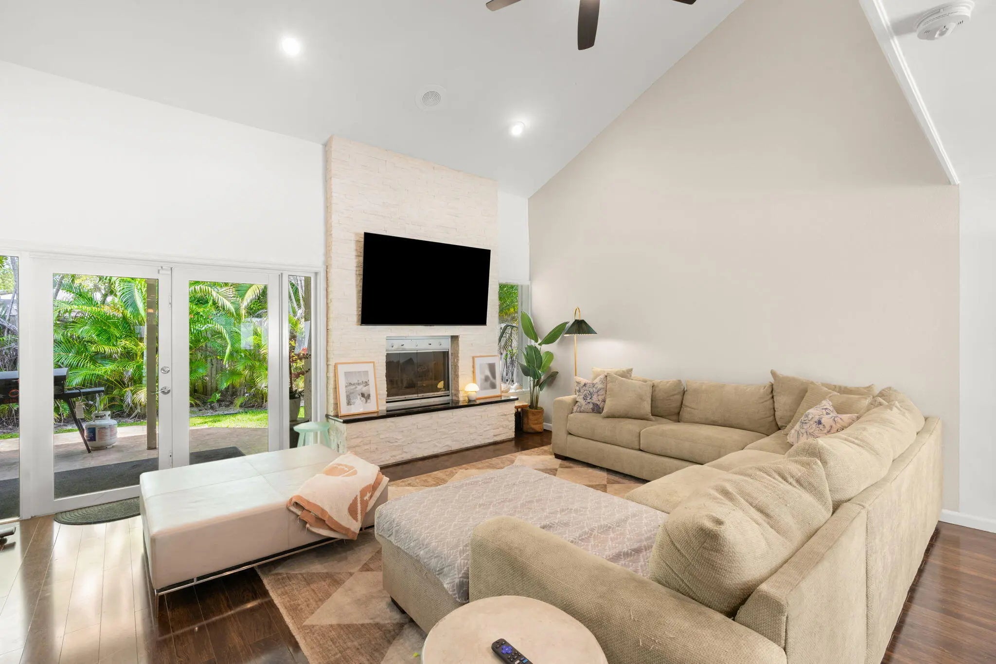 Welcome to this beautifully maintained end-unit townhome with a bright, open layout, vaulted ceilings, and abundant natural light. Laminate wood plank flooring enhances the spacious living area, featuring a striking fireplace wall and seamless flow into the dining space and kitchen with modern cabinetry, light countertops, stainless steel appliances, and bar seating. The primary suite offers vaulted ceilings and a well-appointed bath with a glass-enclosed shower and modern vanity. Enjoy a private covered patio with lush tropical landscaping. Recent improvements include roof (2021), AC (2023), and newer lighting and fans. Located within 2mi of Whole Foods, Publix, Target, LA Fitness, the beach, and I-95. 1% lender credit toward closing costs when using seller's preferred lender.